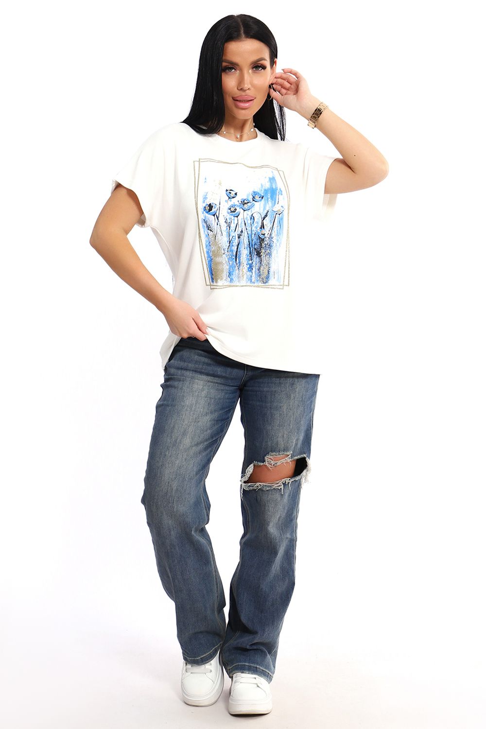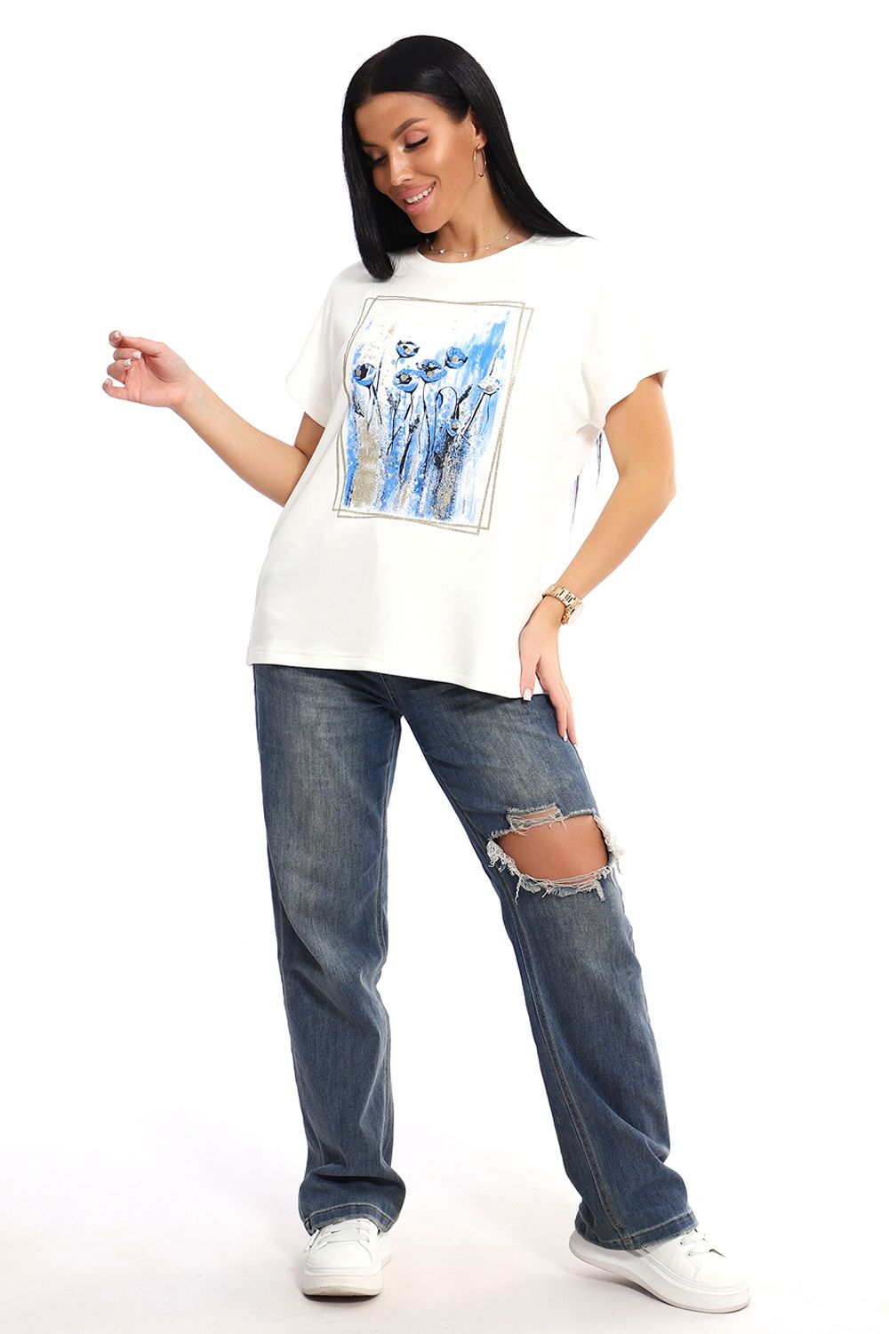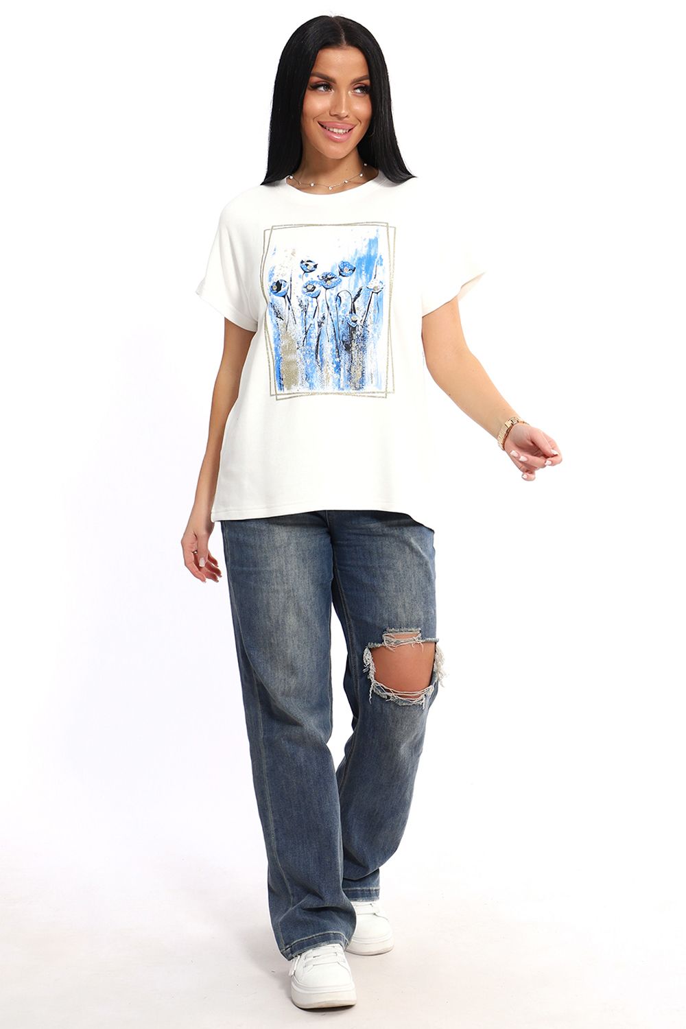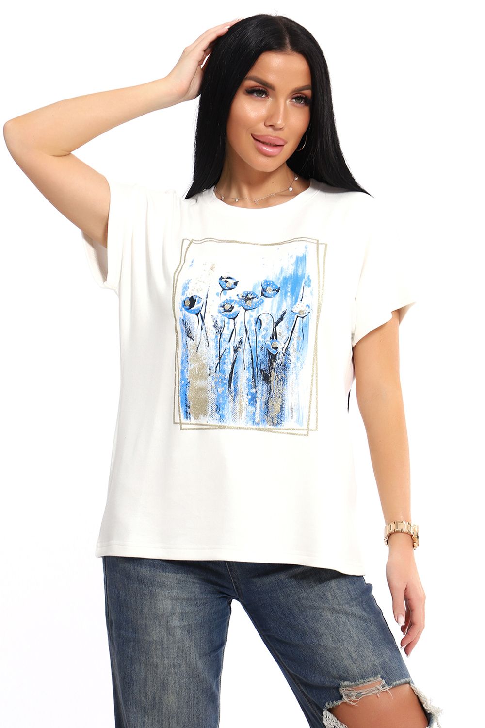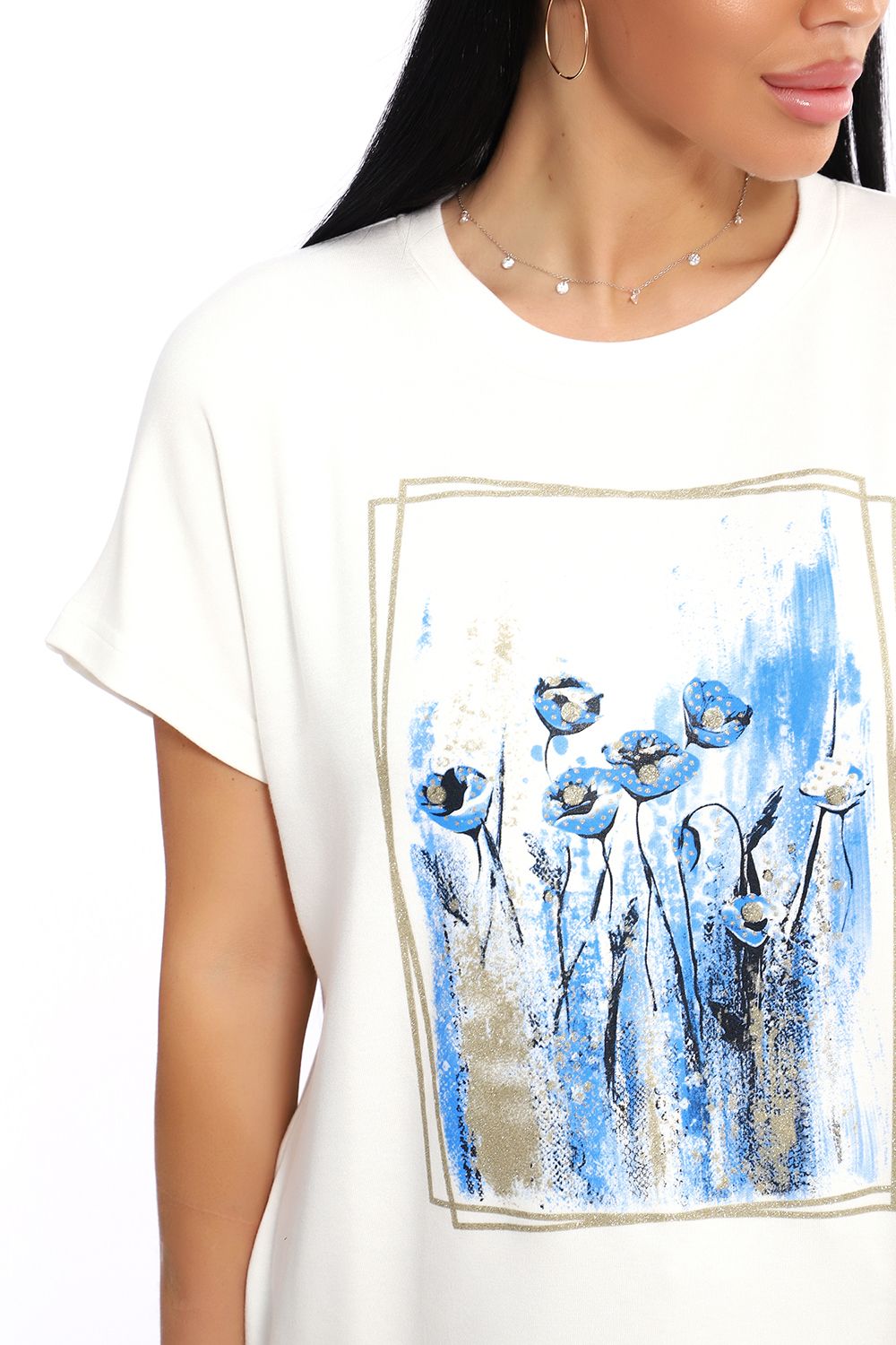 Футболка классического фасона, прямого кроя, с коротким рукавом и округлым вырезом. Полочка декорирована цветочным принтом в пастельных тонах. Универсальная и нарядная модель футболки отлично подойдет для любого образа и станет необходимой вещью в вашем гардеробе наравне с повседневными футболками.