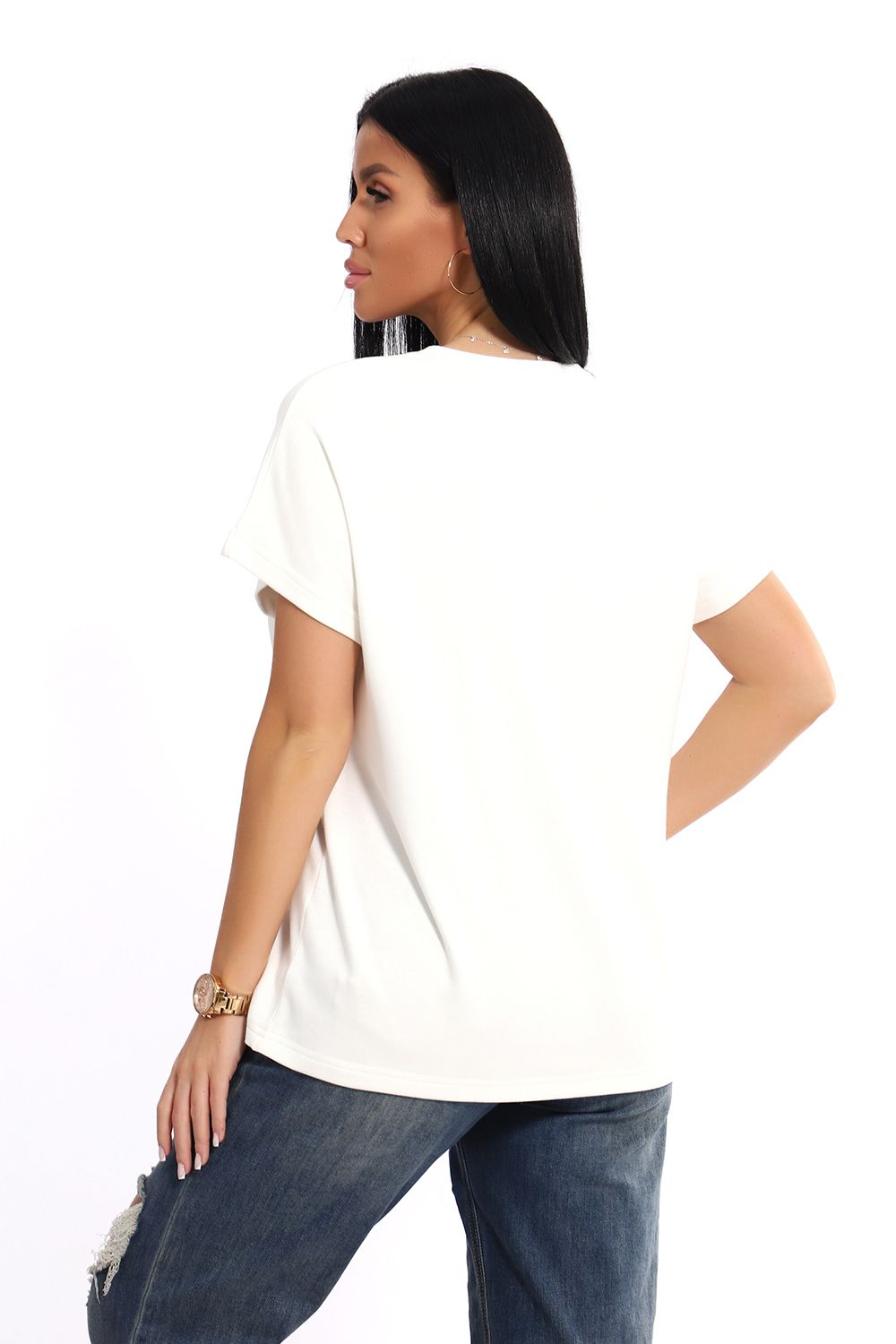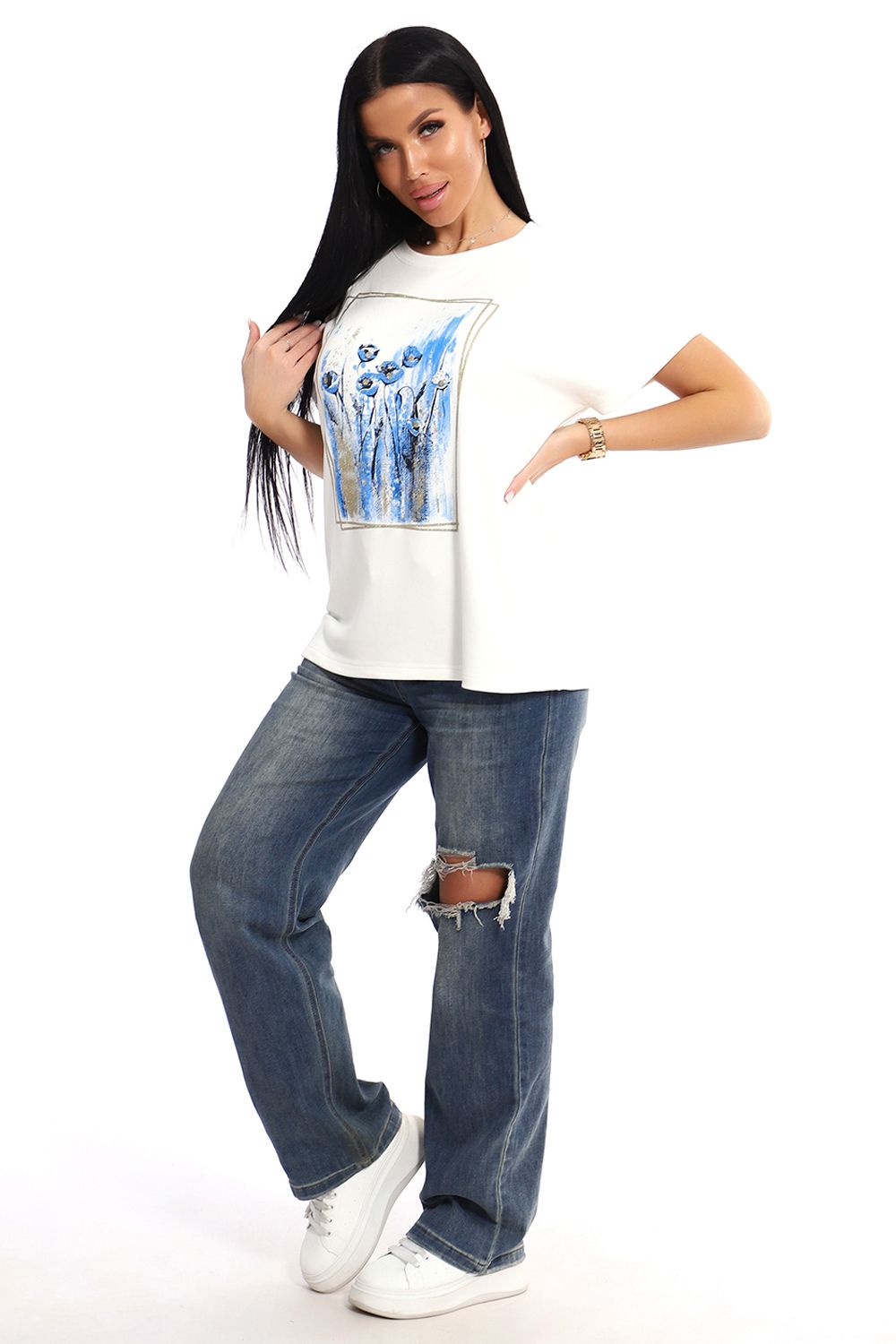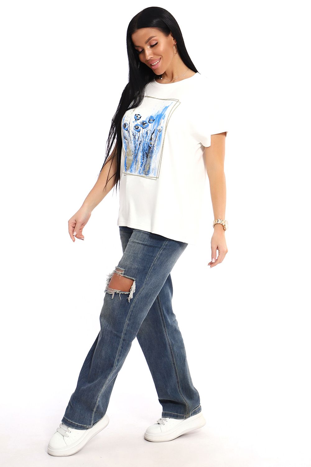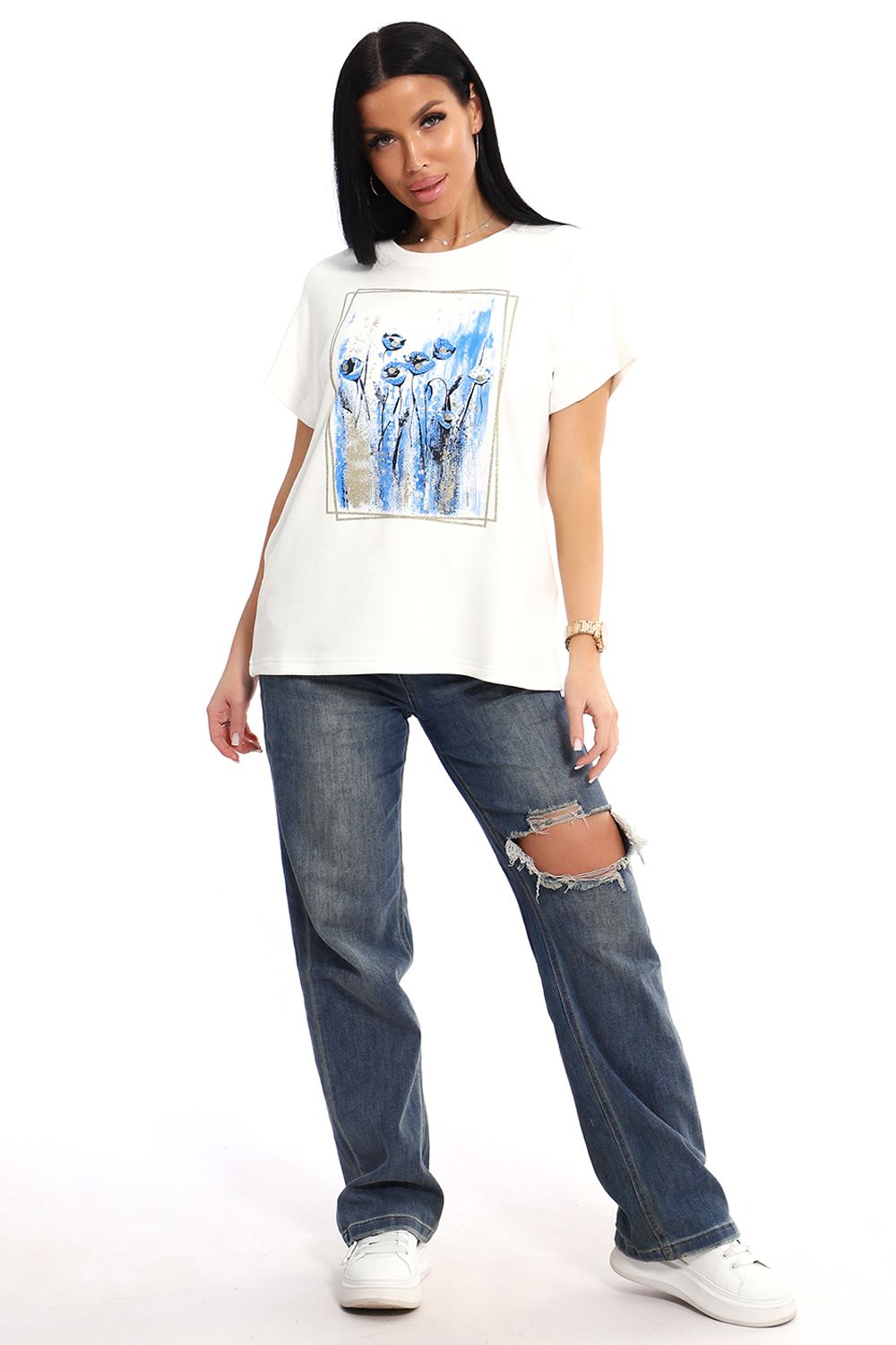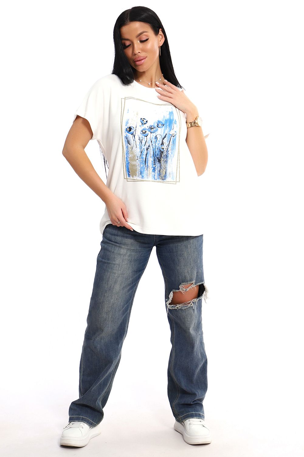 Футболка классического фасона, прямого кроя, с коротким рукавом и округлым вырезом. Полочка декорирована цветочным принтом в пастельных тонах. Универсальная и нарядная модель футболки отлично подойдет для любого образа и станет необходимой вещью в вашем гардеробе наравне с повседневными футболками.
