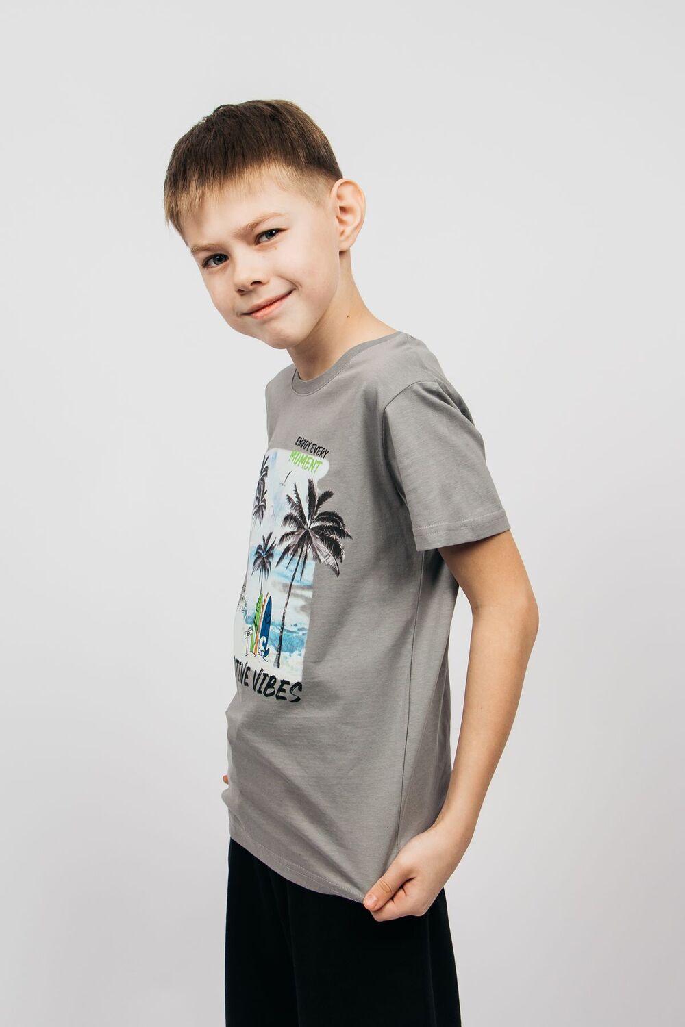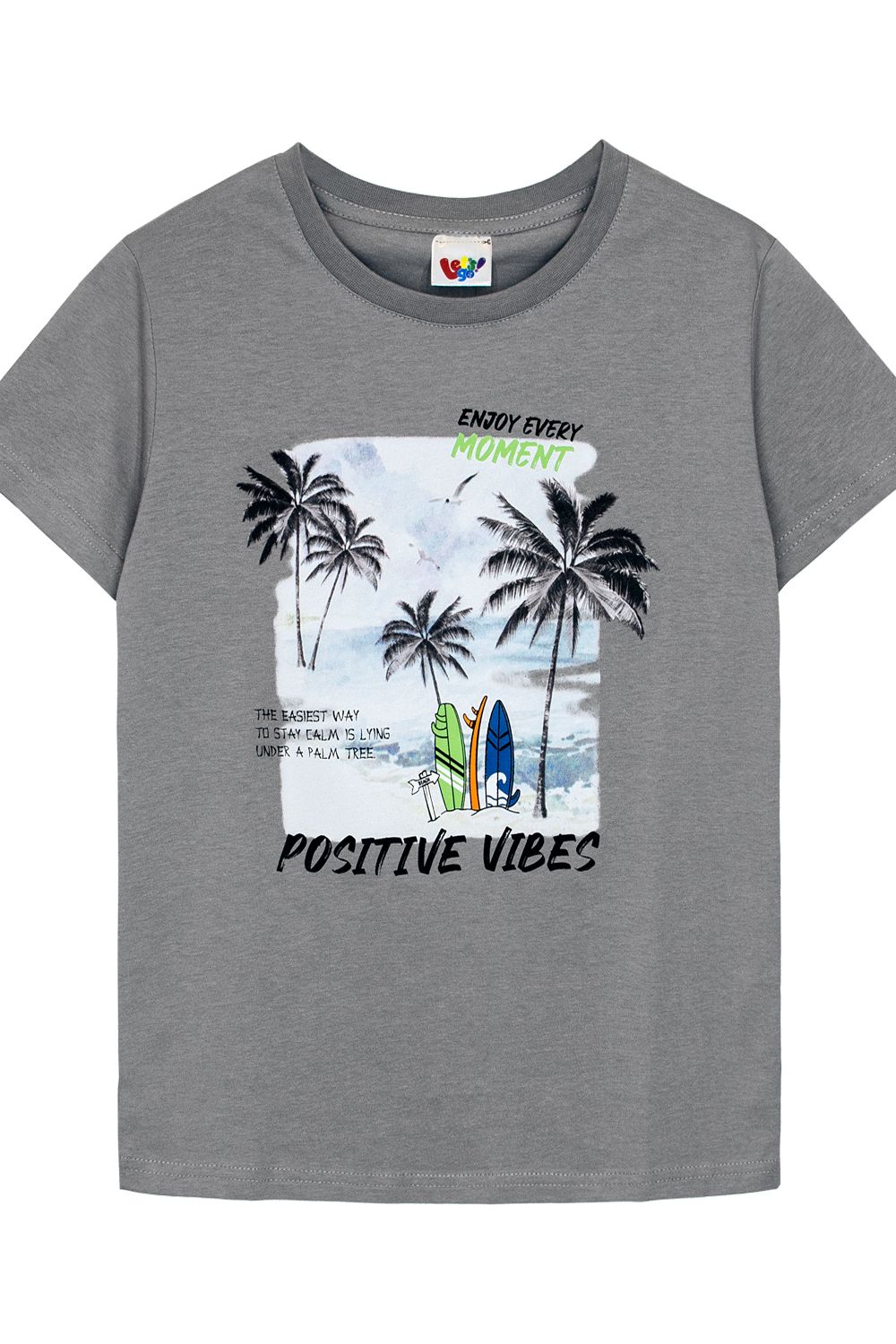Футболка для мальчика прямого силуэта с втачным коротким рукавом. Горловина круглая, обработана воротником из рибаны. Горловина спинки внутри укреплена бейкой из кулирки. Низ изделия и рукава обработан швом вподгибку. На полочке Фотопринт с шелкографией. Надпись переводится как "Наслаждайся каждым моментом; Самый простой способ сохранять спокойствие-лежать под пальмой; Волны позитива".