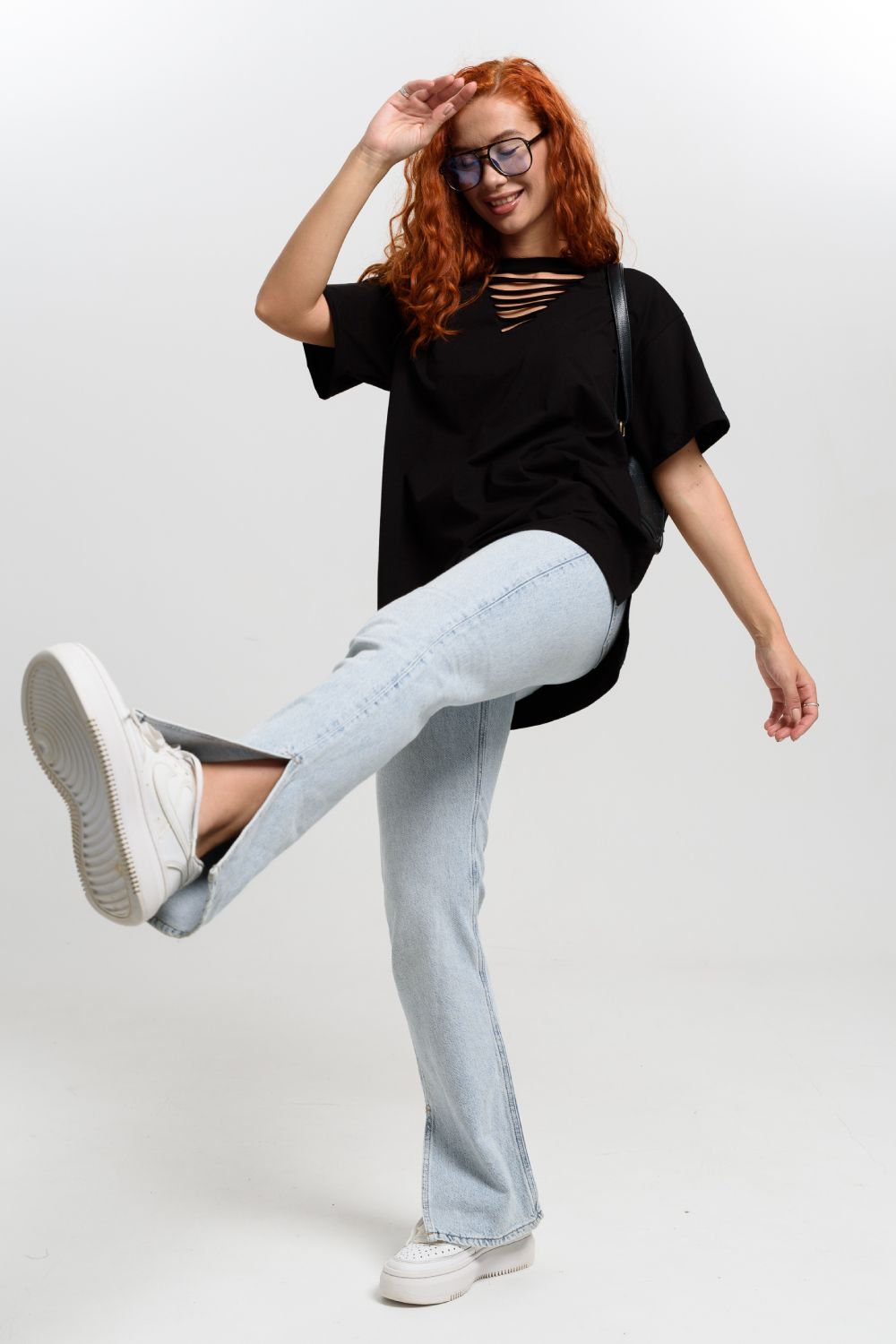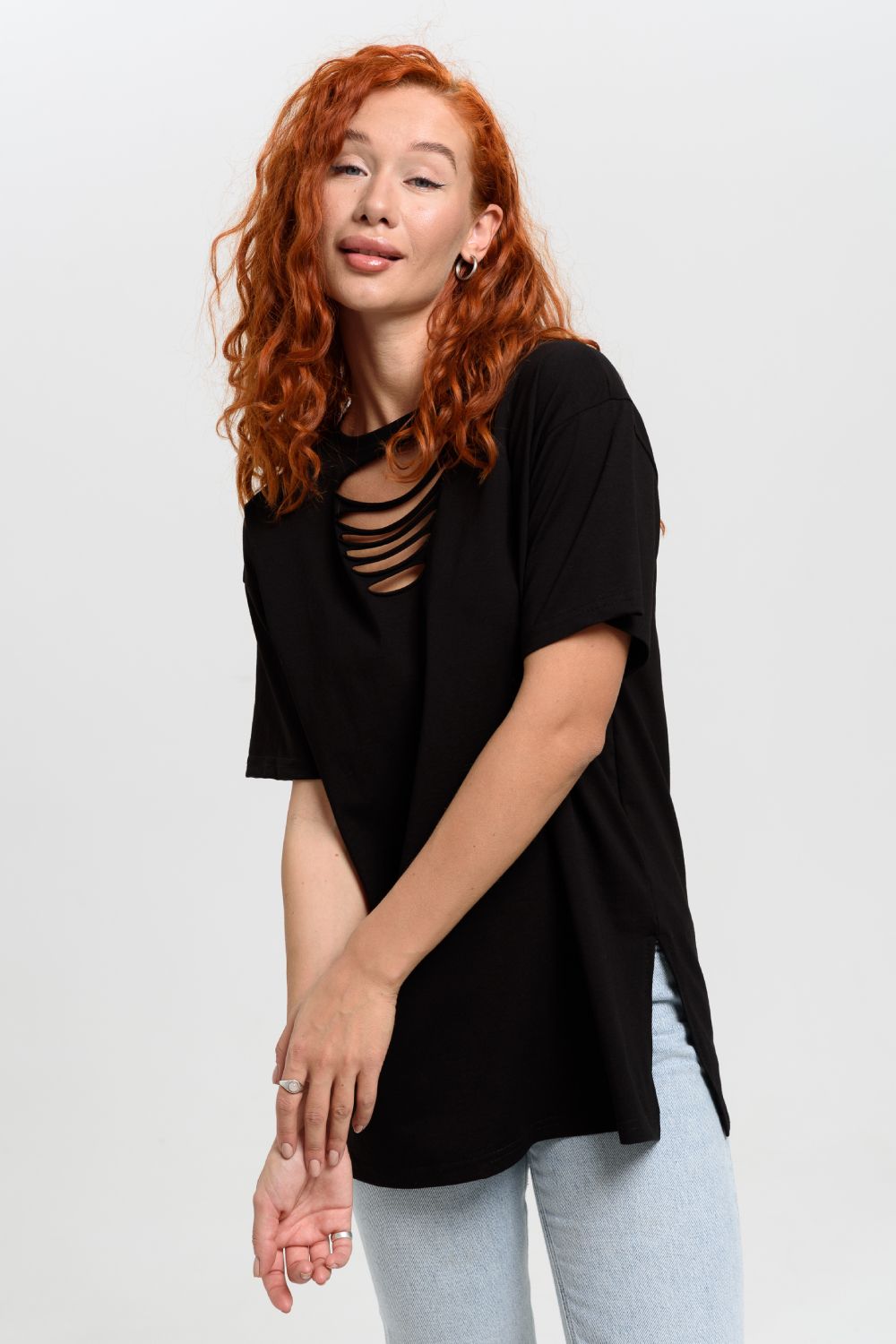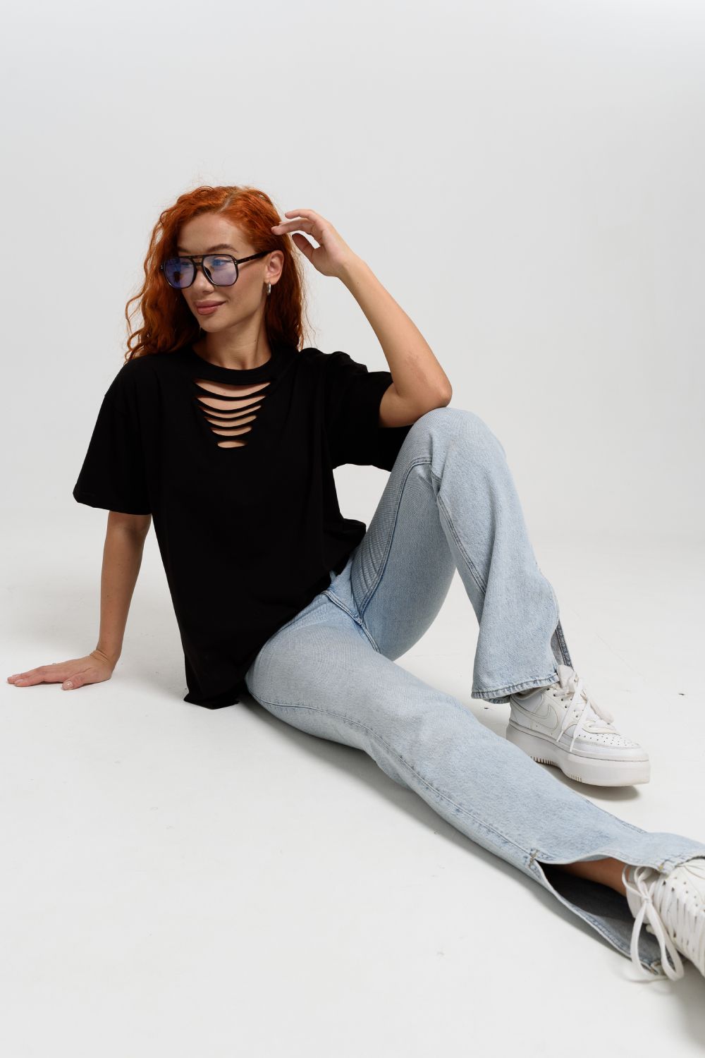 Футболка в стиле oversize, со спущенным плечом и стильными разрезами на груди. Невероятно комфортная, приятная к телу, футболка универсальной длины.