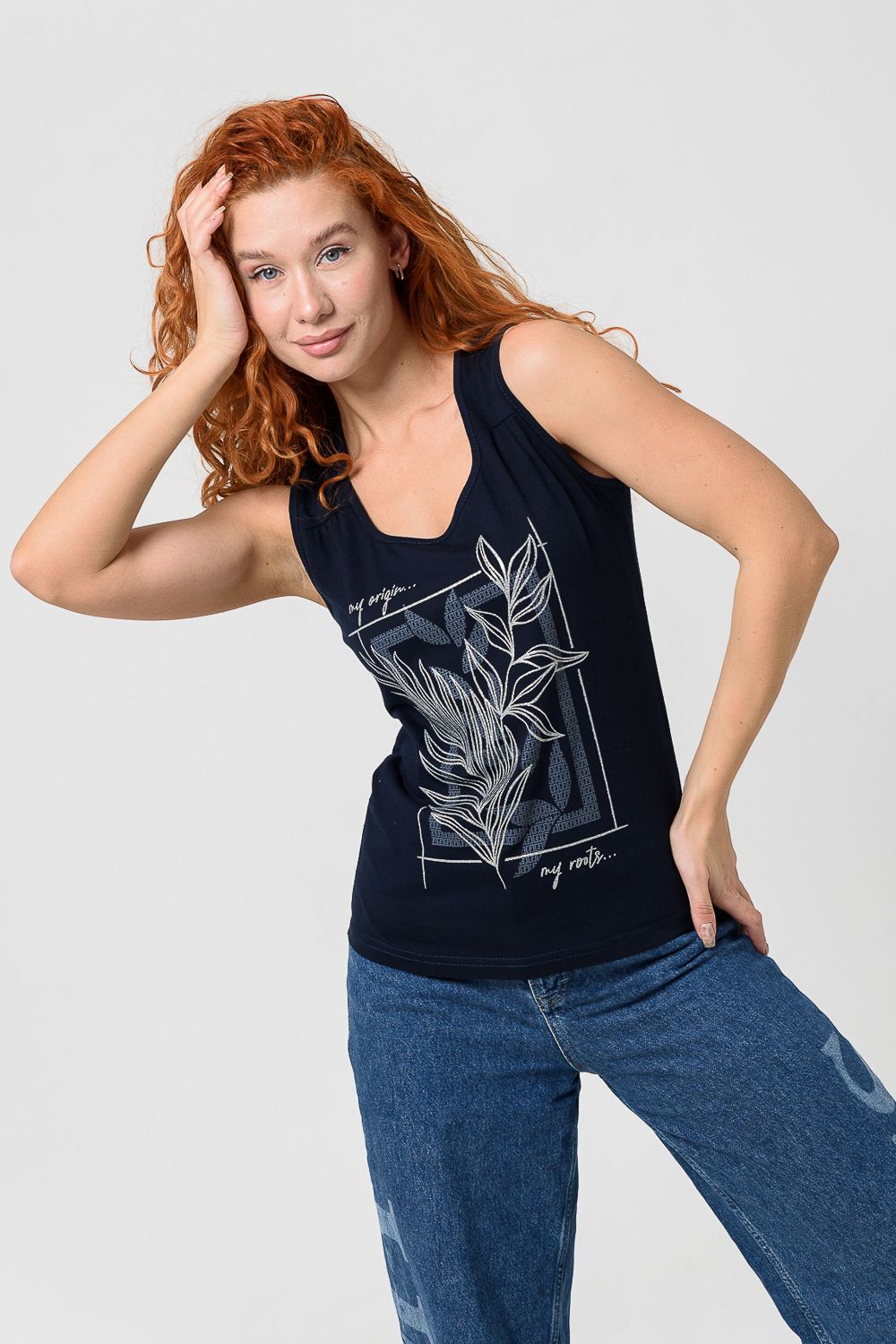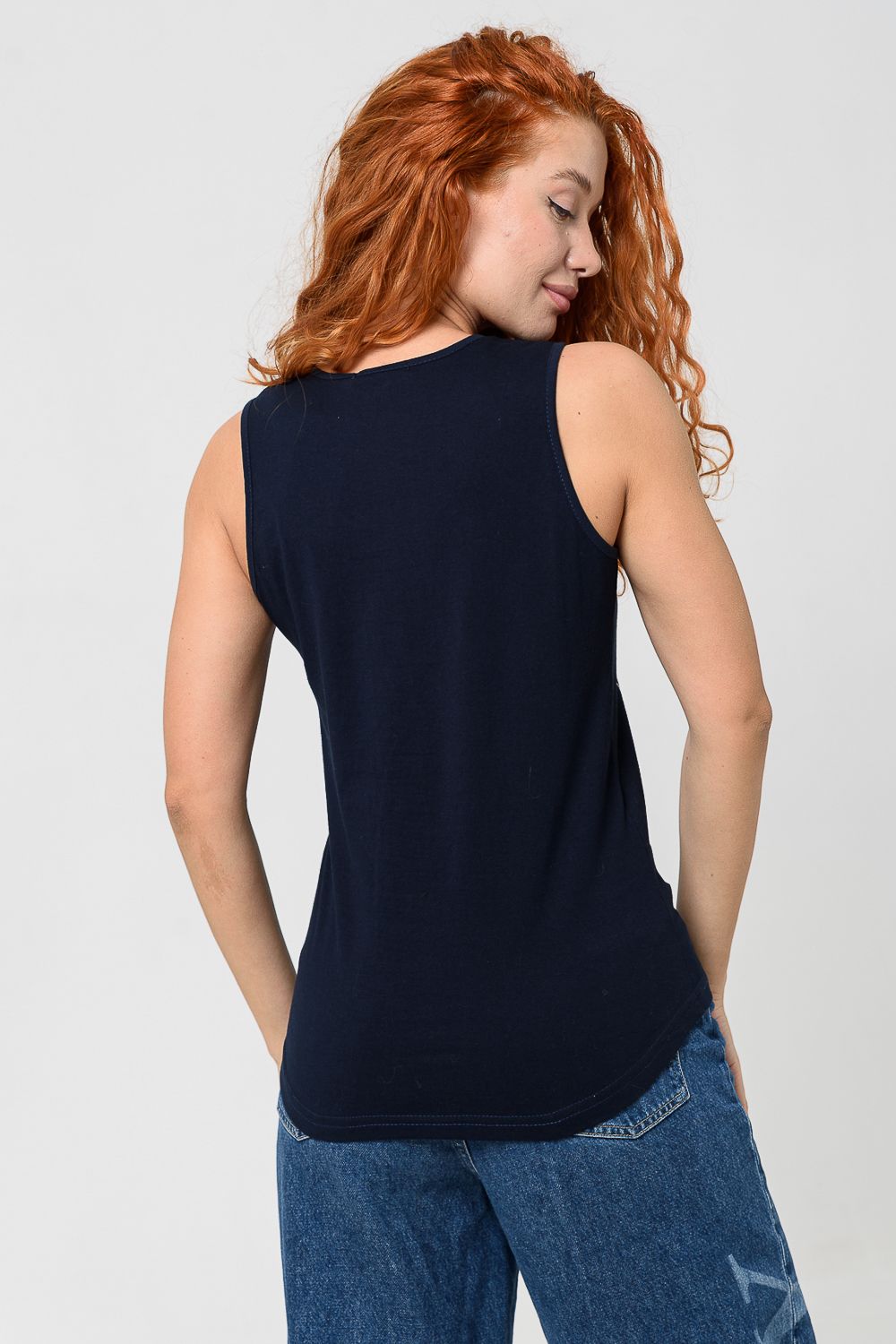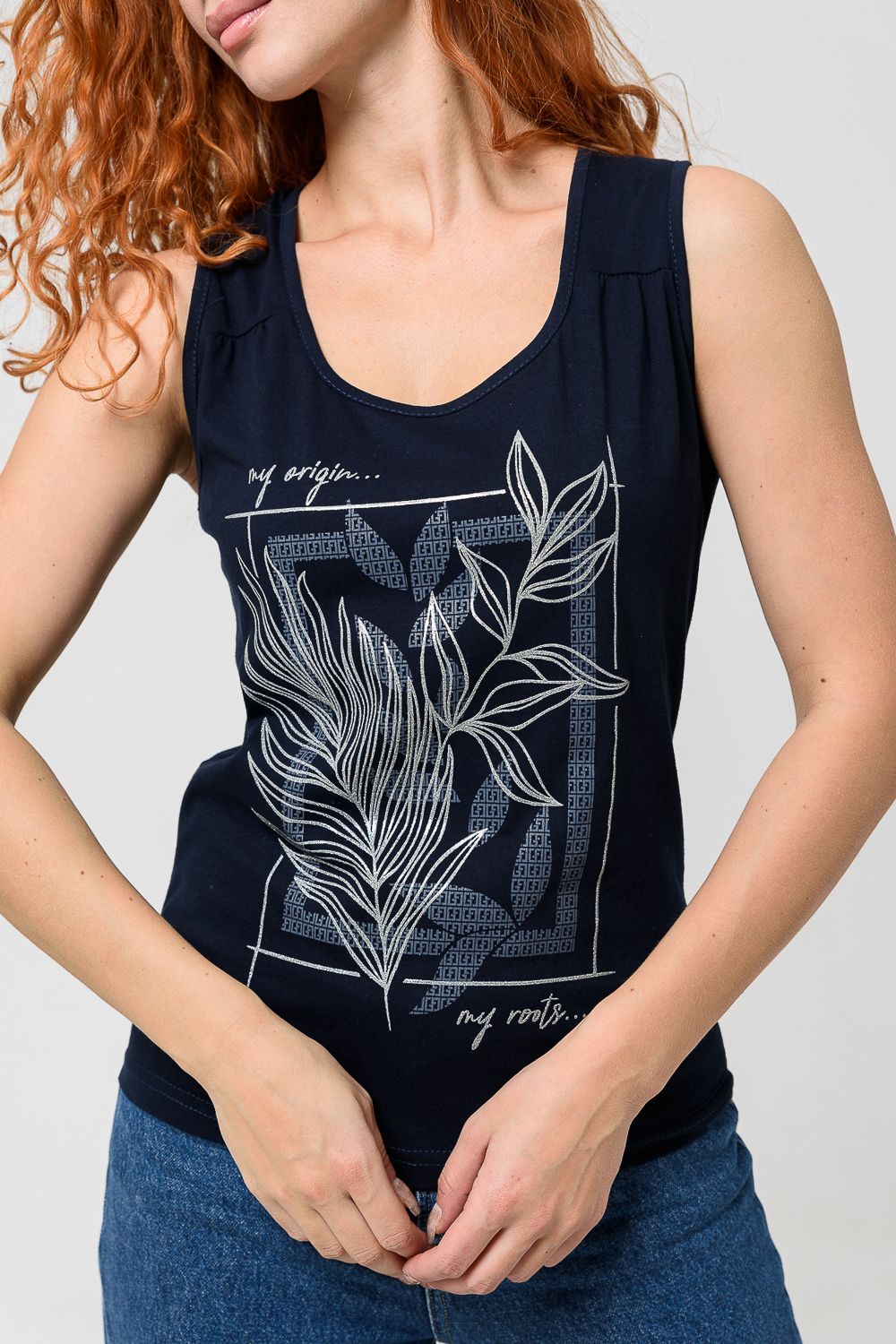 Майка прилегающего силуэта, с округлой горловиной. Полочка с кокетками. Горловина, проймы обработаны бейкой из основного полотна.