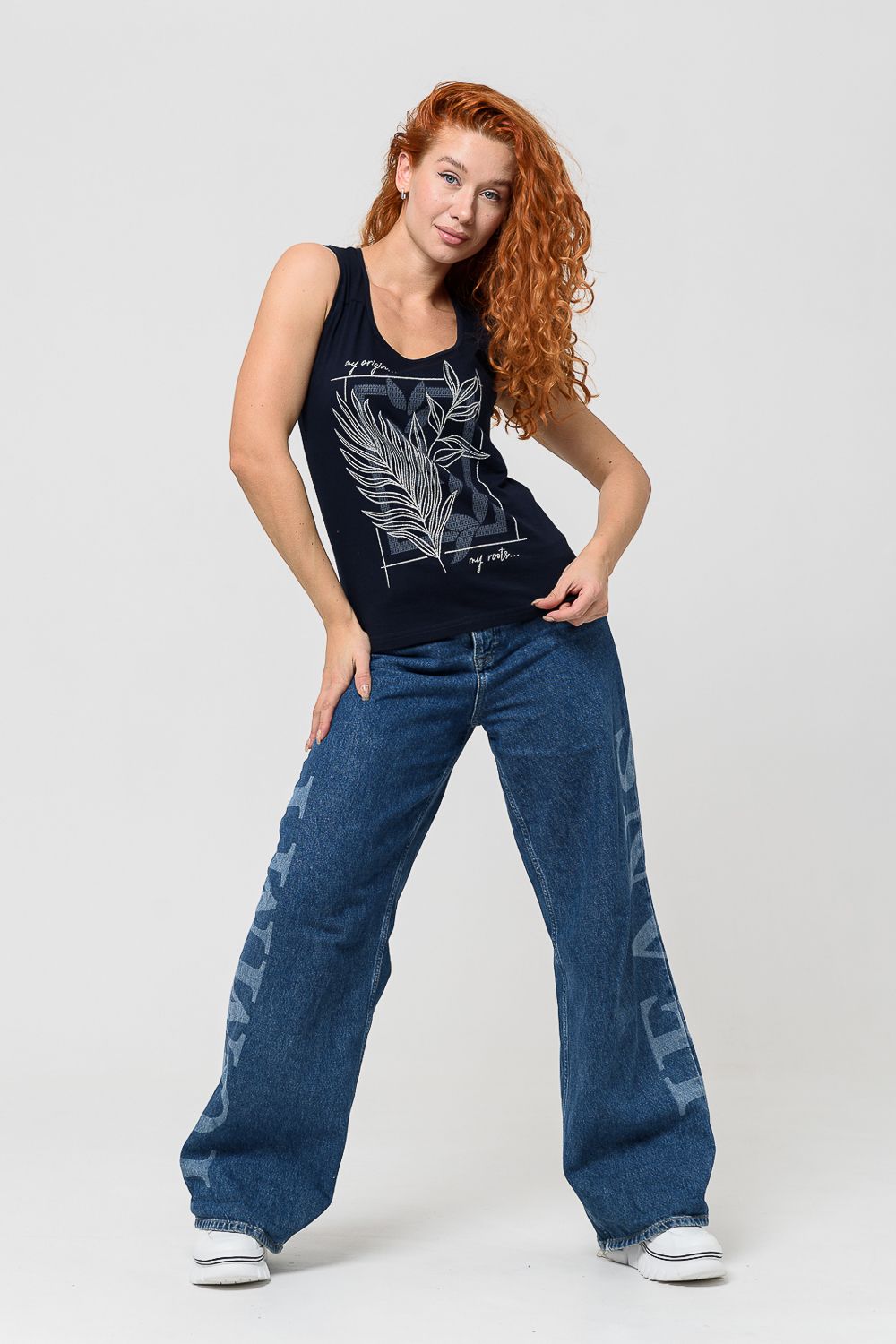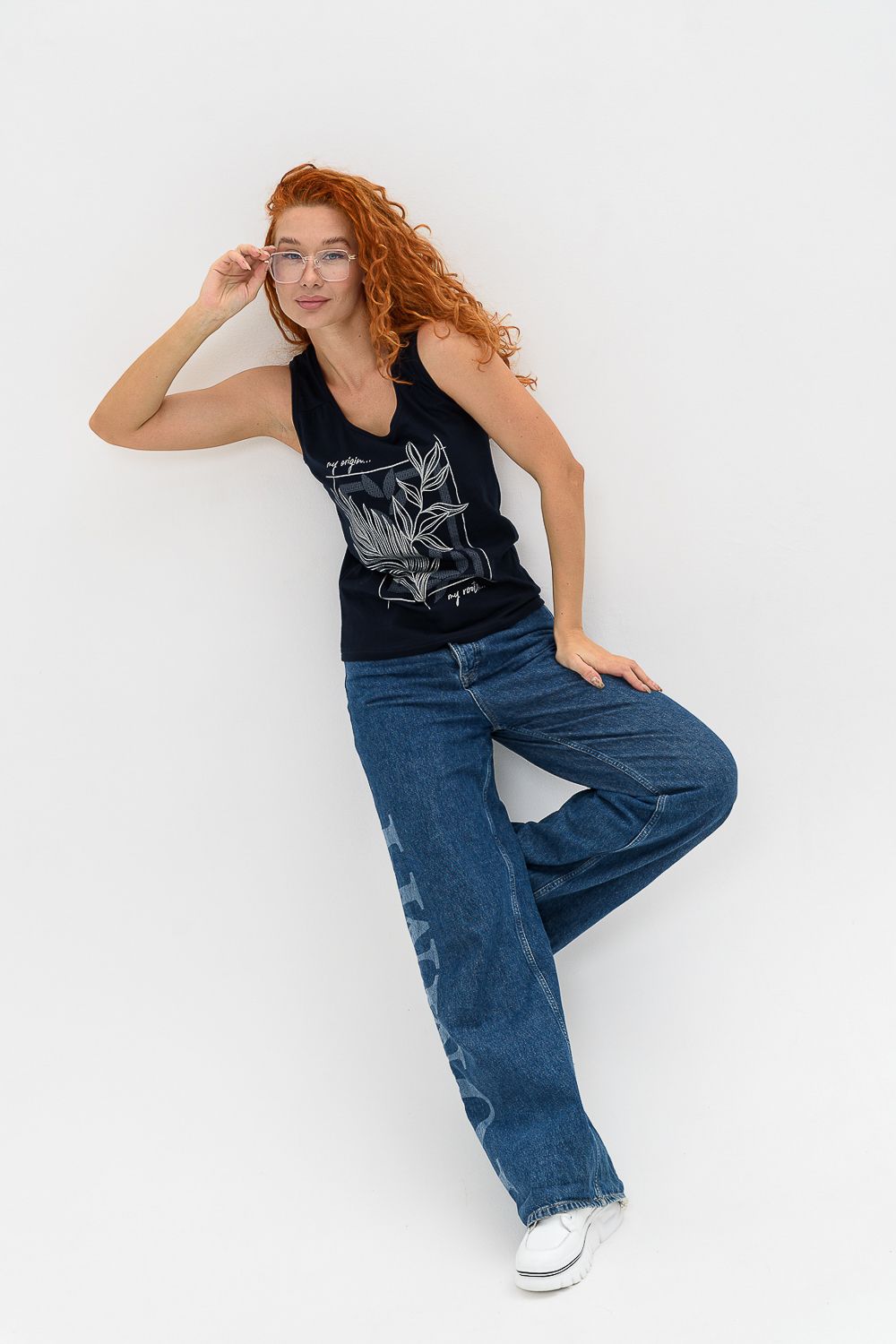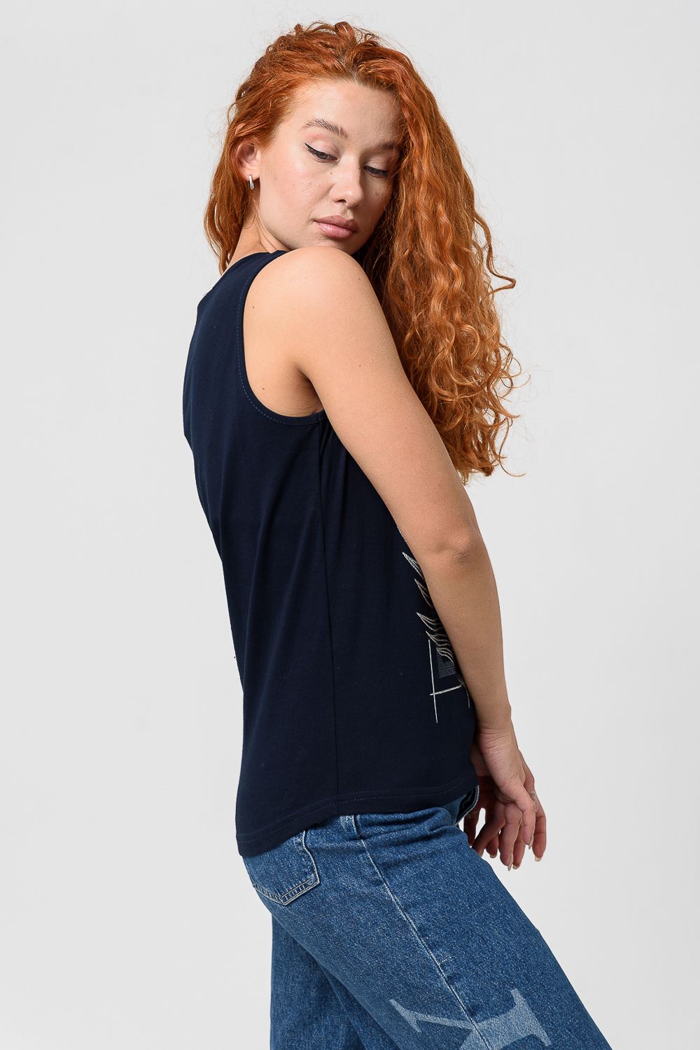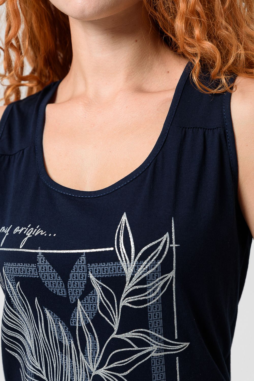 Майка прилегающего силуэта, с округлой горловиной. Полочка с кокетками. Горловина, проймы обработаны бейкой из основного полотна.