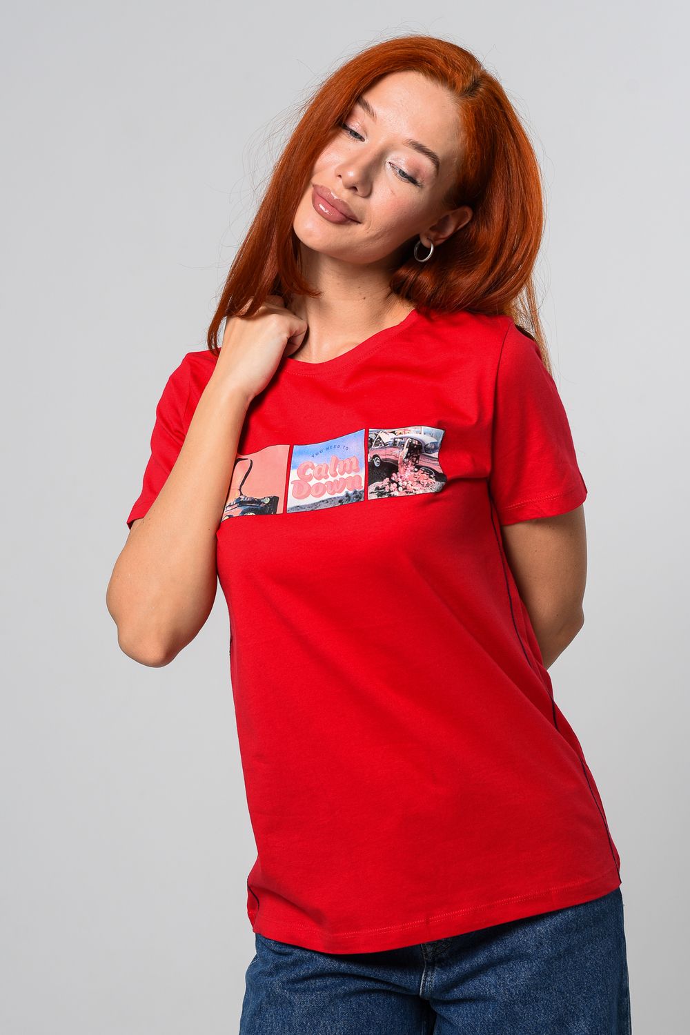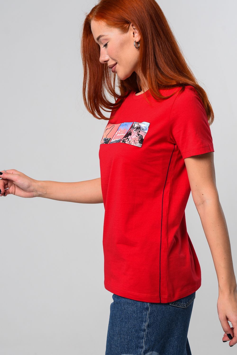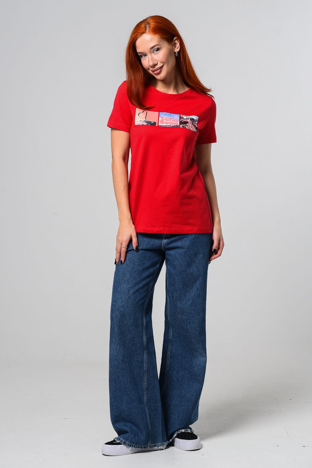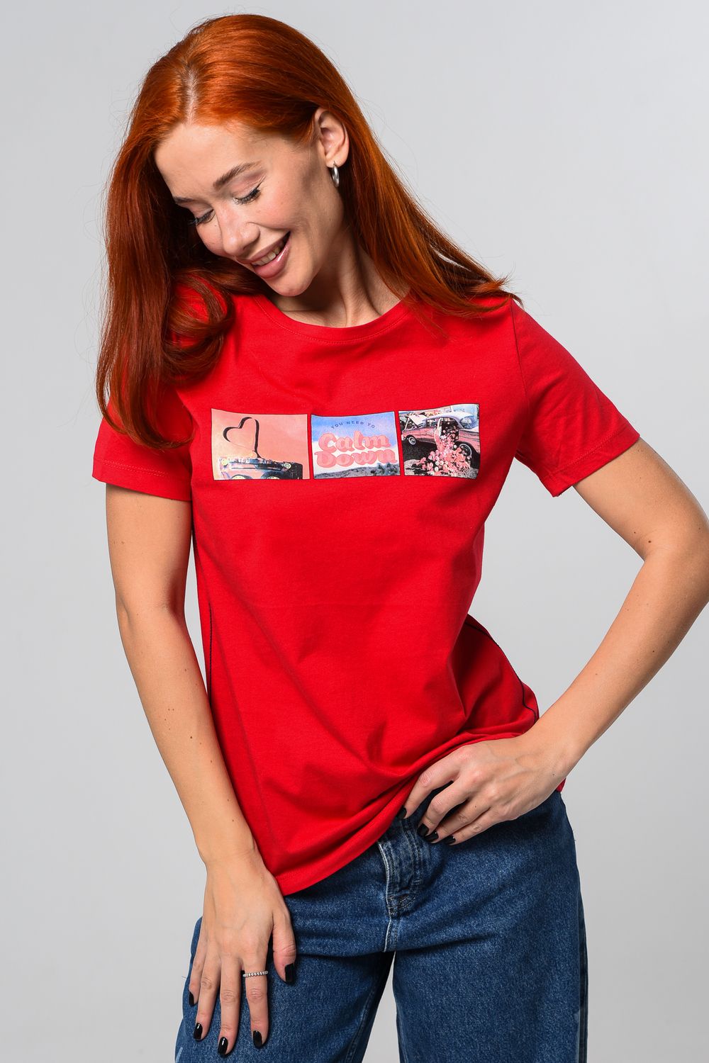 Футболка женская красная. Подойдет на повседневный образ, модель свободного кроя, не сковывает движения. Красивый принт придает изюминку футболке. Приятный и дышащий материал. Состав: хлопок 100%