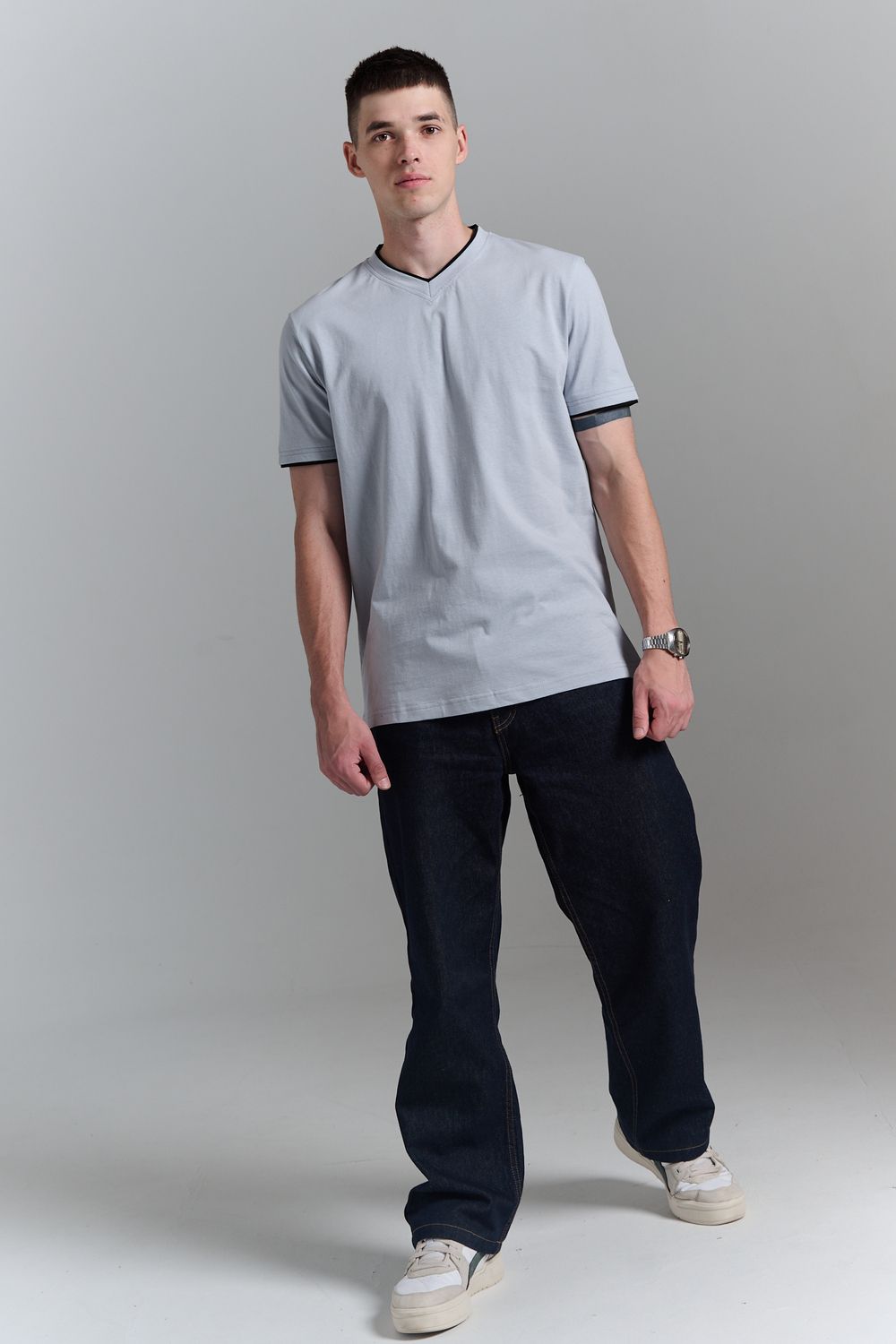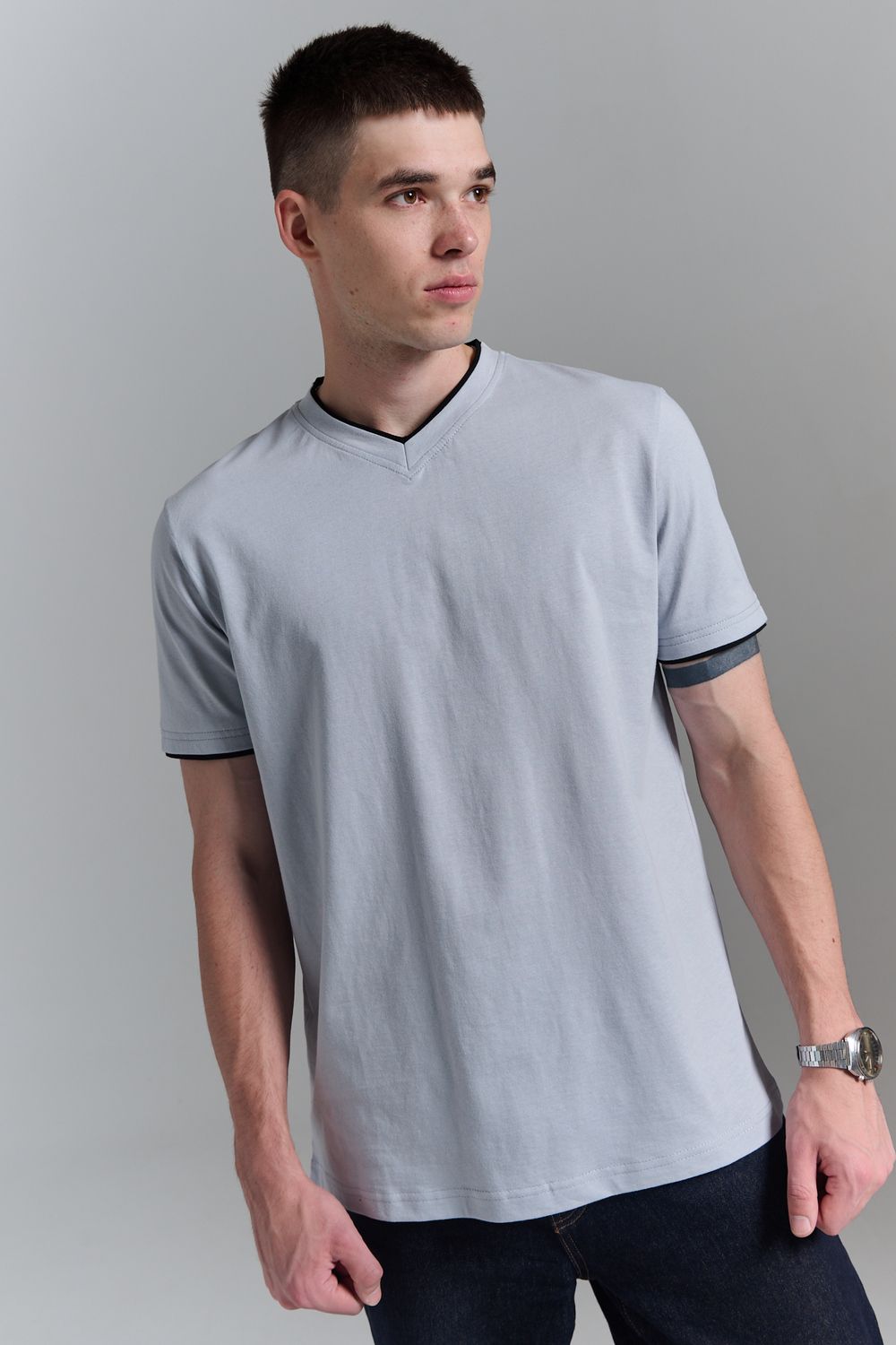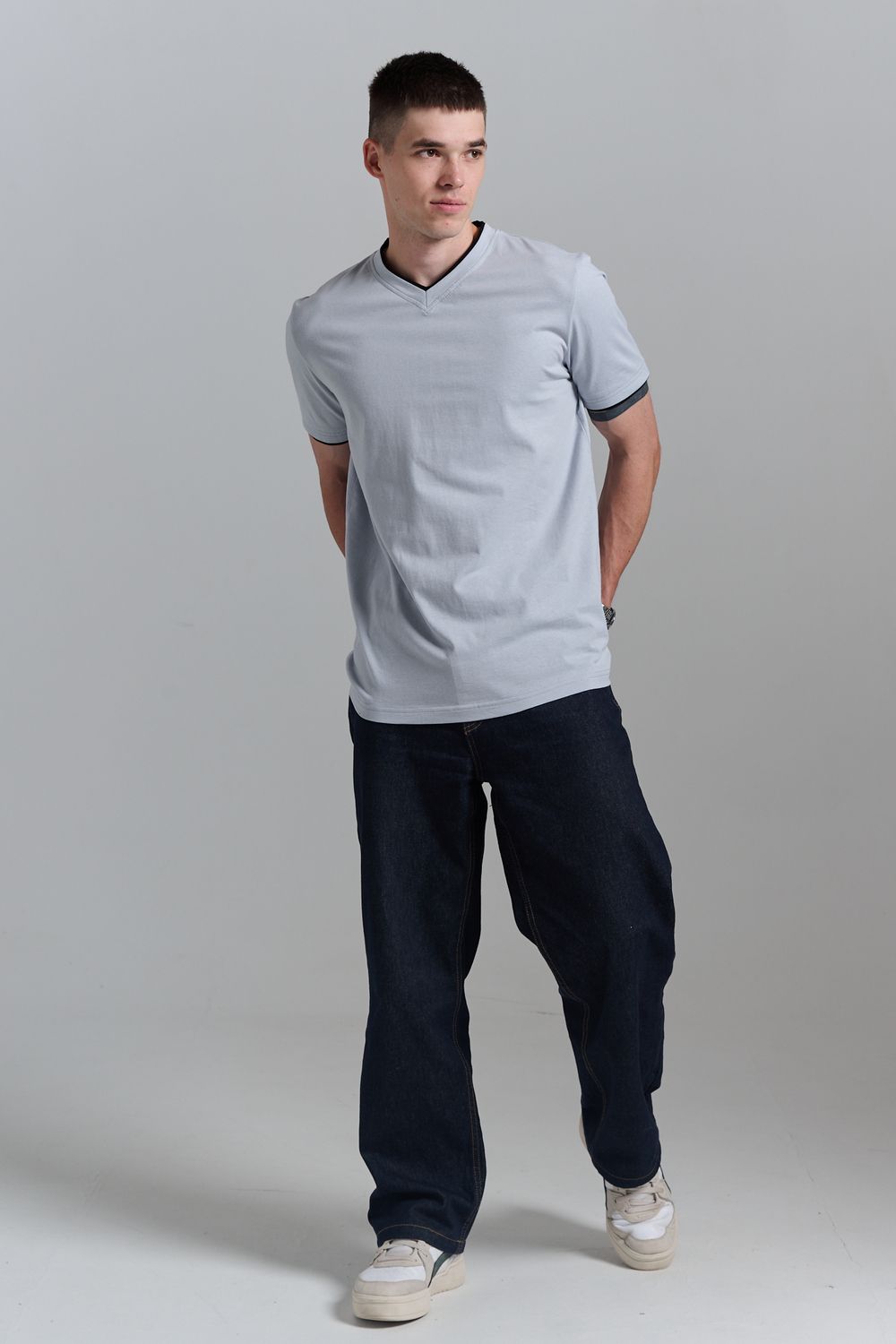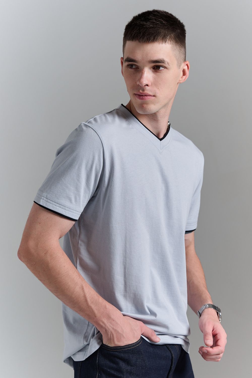 Футболка мужская однотонная с окантовкой из плотного дышащего хлопка. Модель в расслабленном молодежном стиле. Свободный прямой крой – база для любого гардероба. Представлены мягкие футболки стандартных размеров, подходят на высокий рост. С усиленным V-Образным вырезом и окантовкой, подойдет для тренировок, офиса, учебы, активного отдыха, туристических поездок, встреч с друзьями и дома.