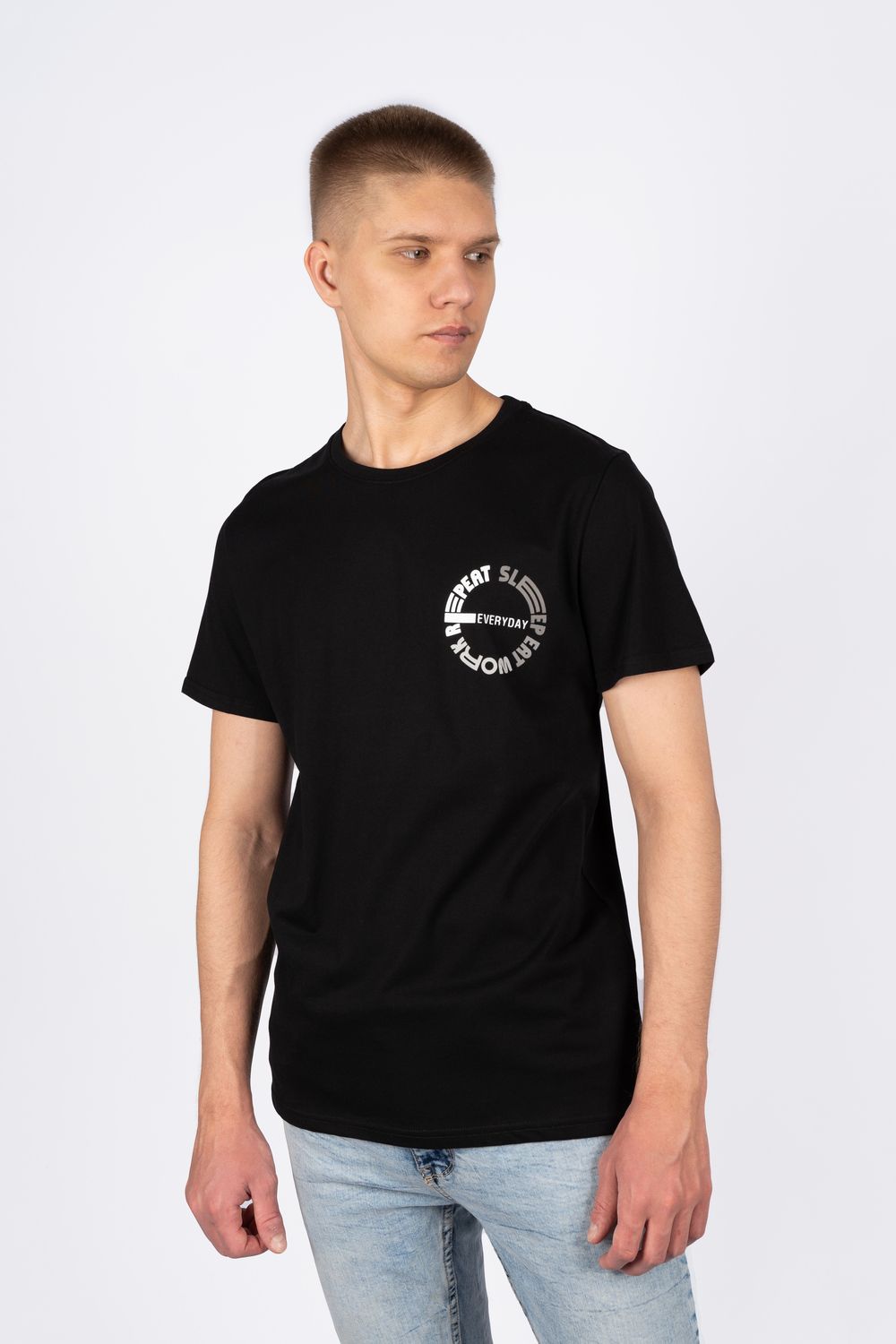 Мужская футболка с принтом для настоящих трудоголиков! Ешь, спи, работай - девиз на каждый день для тех, кто стремится к своим целям, внимательно относится к дисциплине и обязательно добьется всего, чего хочет! Сделана из мягкого трикотажа, который выдержит множество стирок. Прямой силуэт футболки, втачной рукав, горловина круглая, обработана воротником из рибаны. Горловина спинки внутри укреплена настрочной планкой из кулирки. Низ изделия и рукавов обработан швом в подгибку. На полочке принт шелкография.