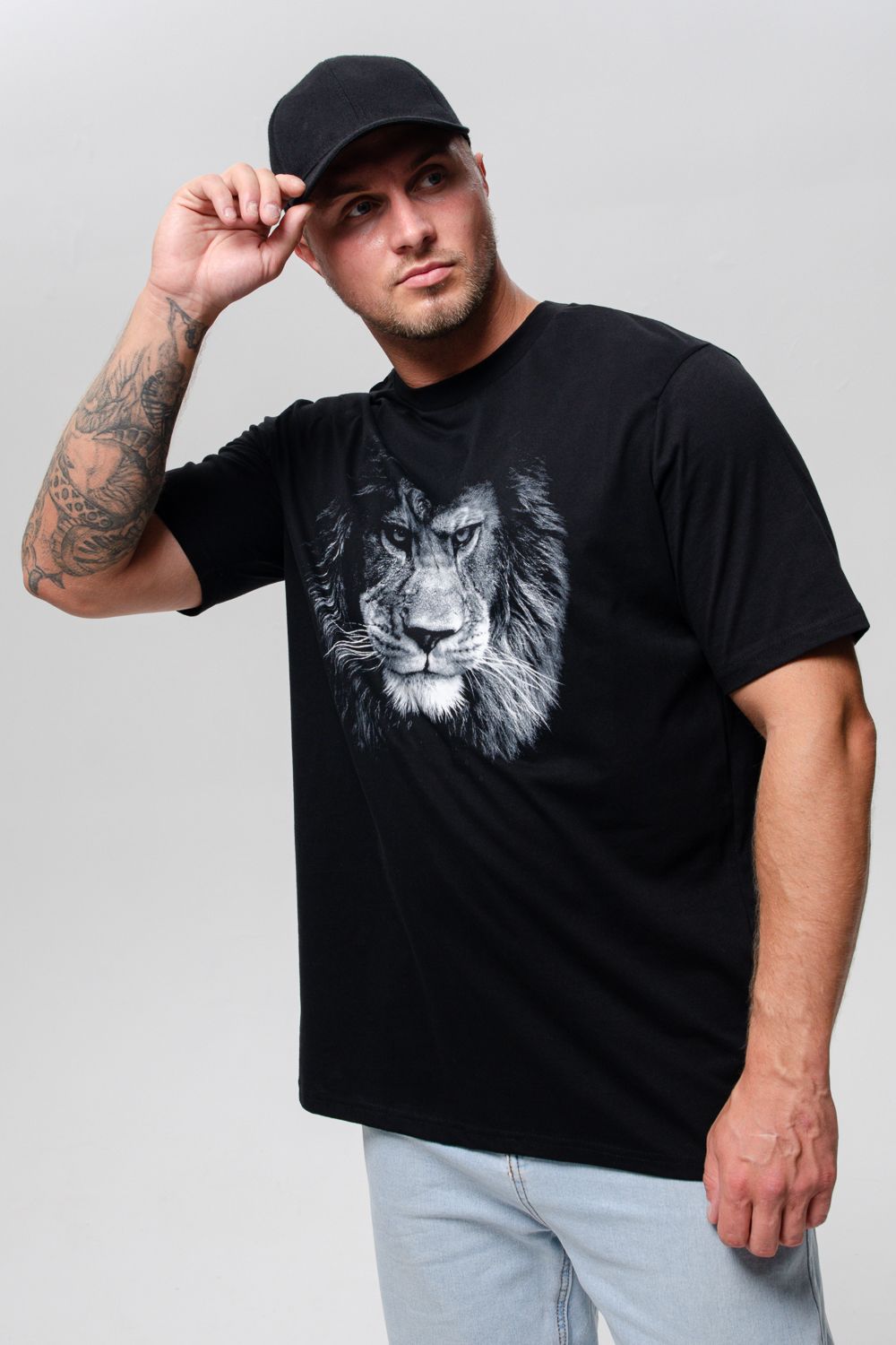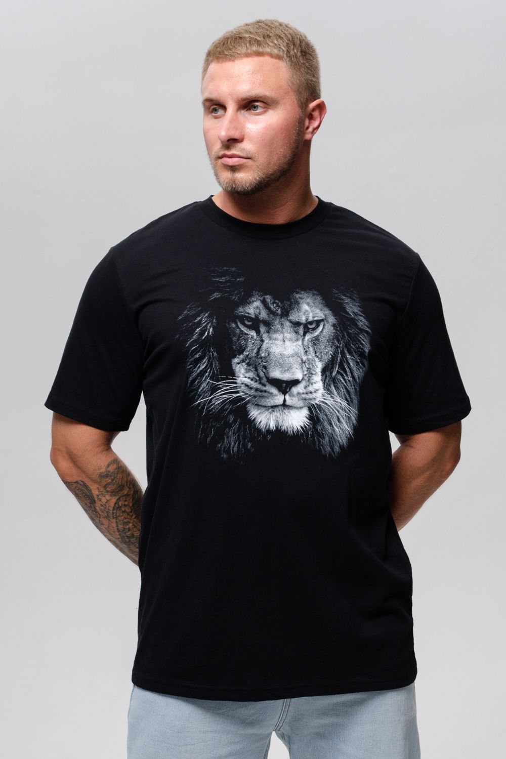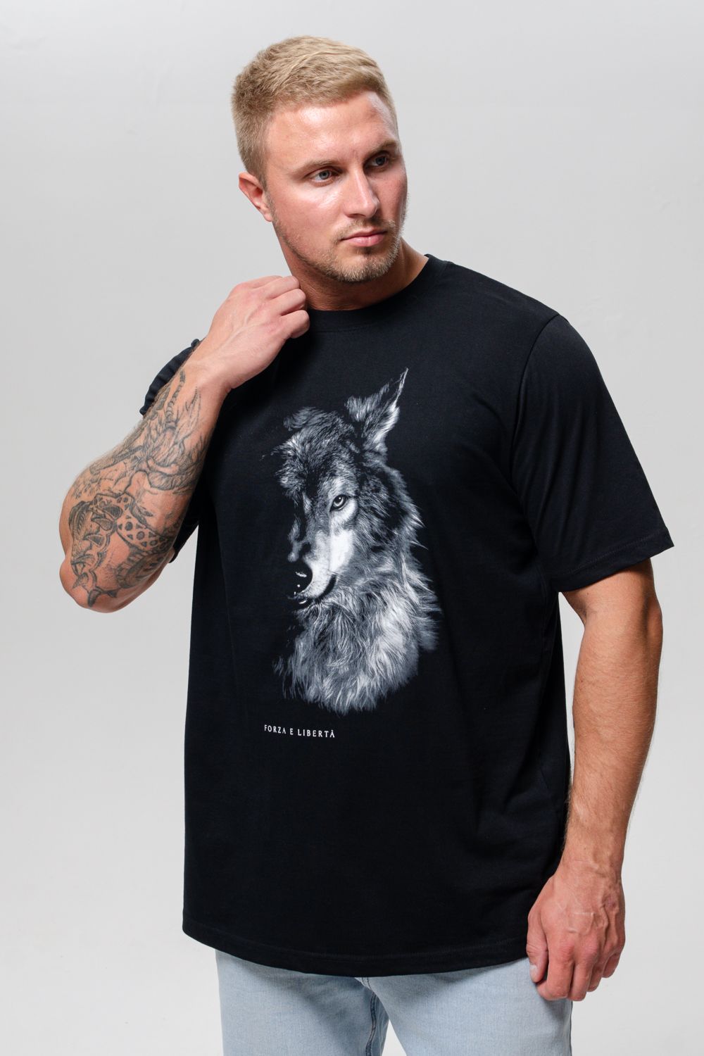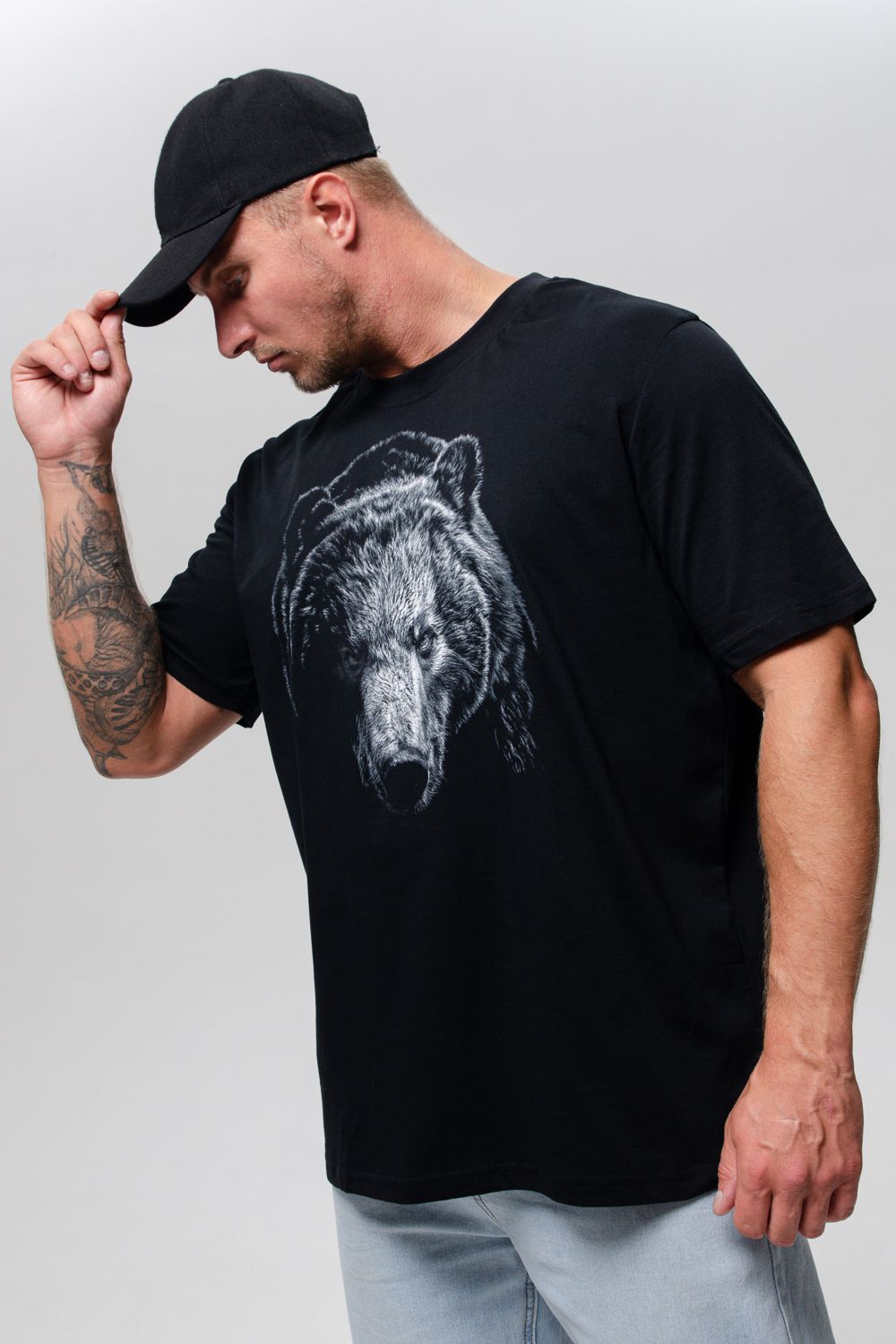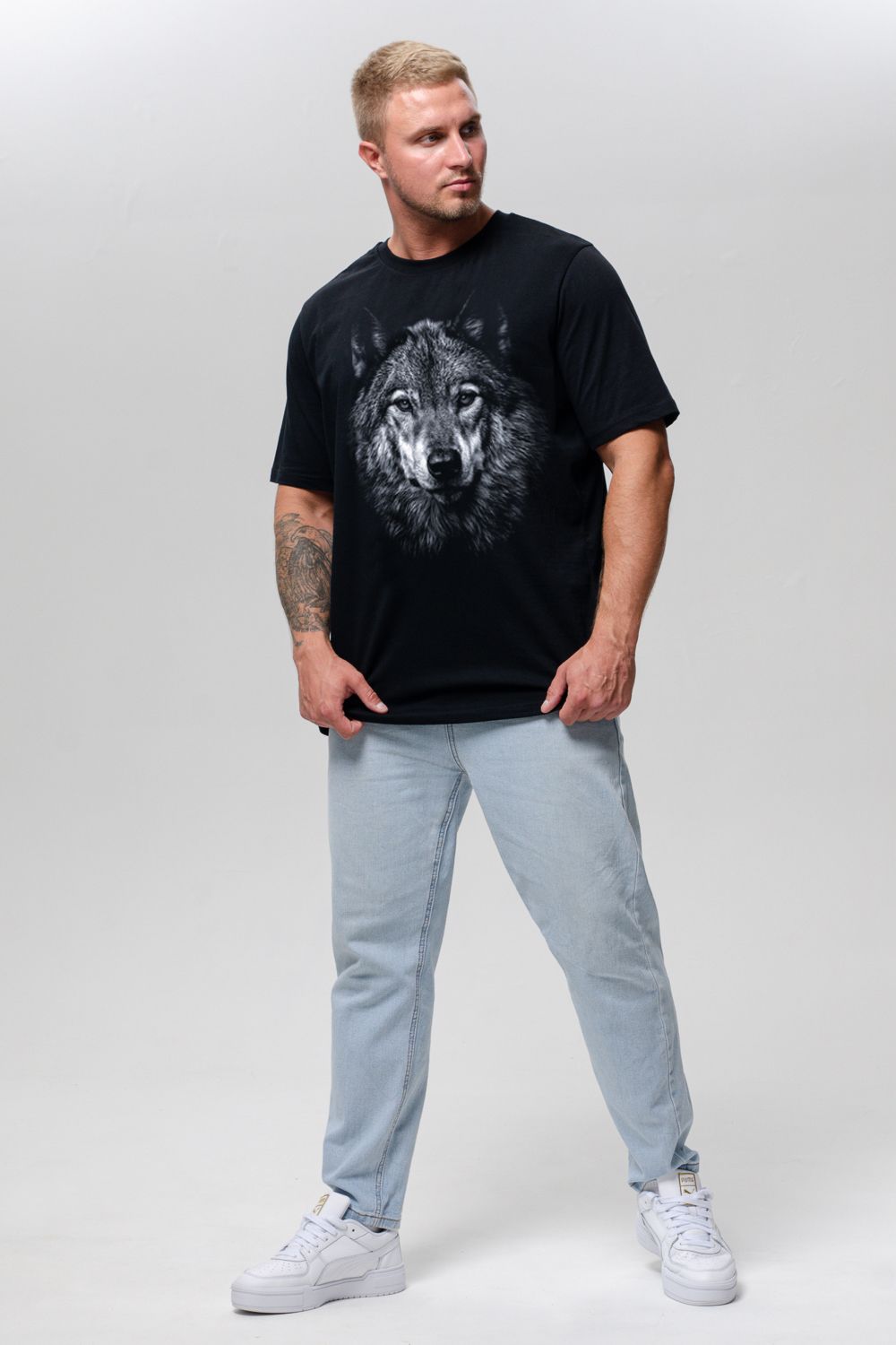 Футболка прямая, свободная, средней длины, с округлой горловиной. Рукав короткий. Горловина обработана эластичной обтачкой. Изображение волка возможно другое.