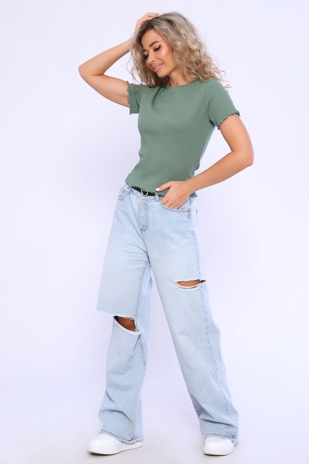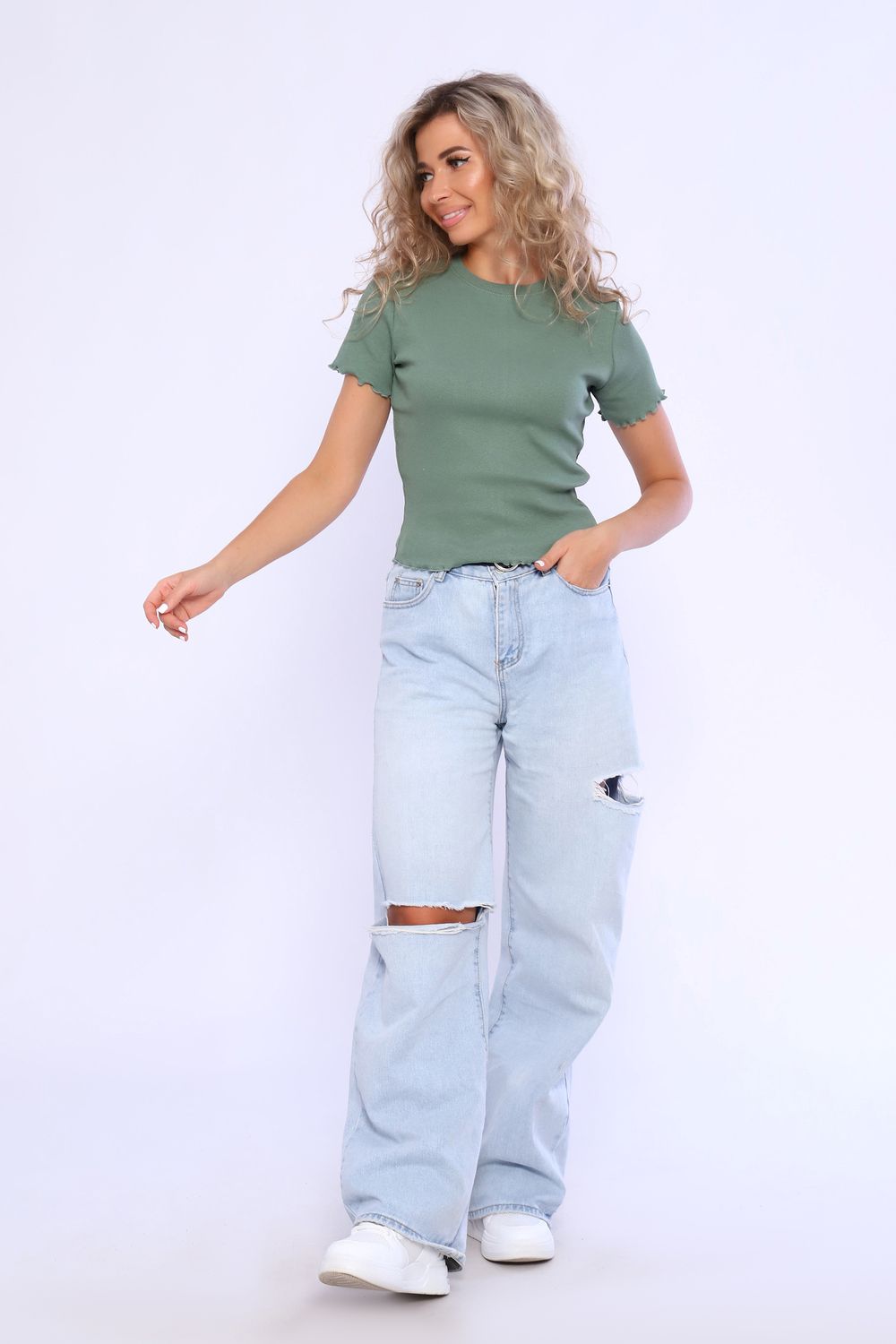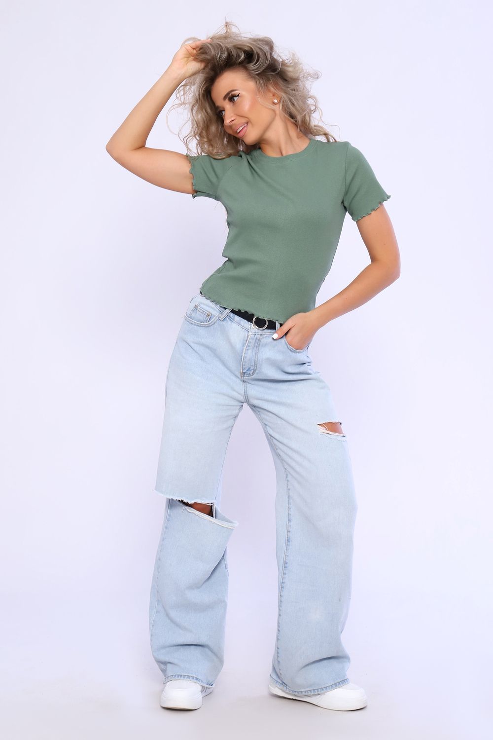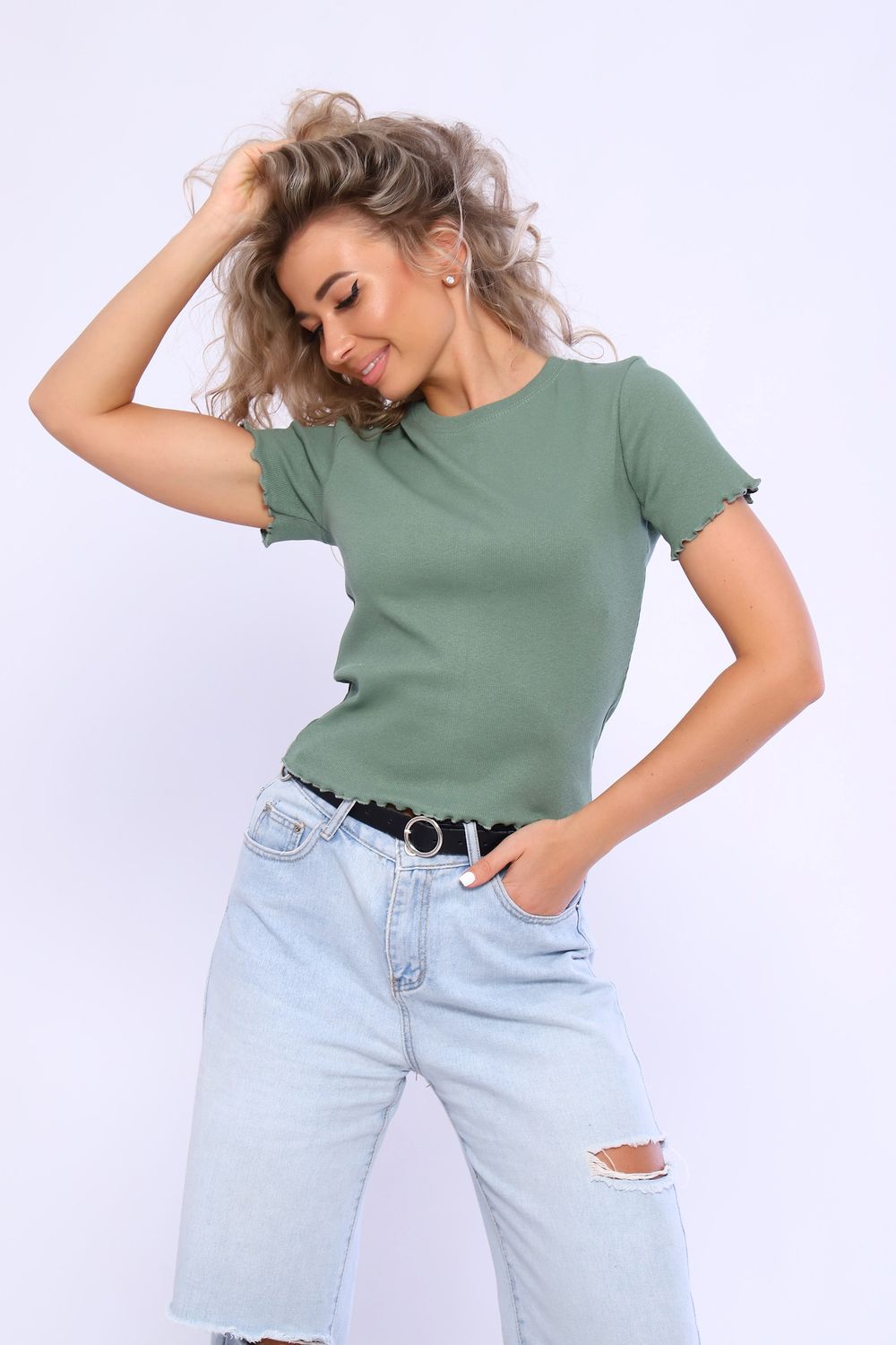 Футболка - топ укороченная молодежная, выполнена из мягкого приятного к телу кашкорсе. Рукав короткий обработан под краевку и так же низ изделия. На модели 46 размер.
