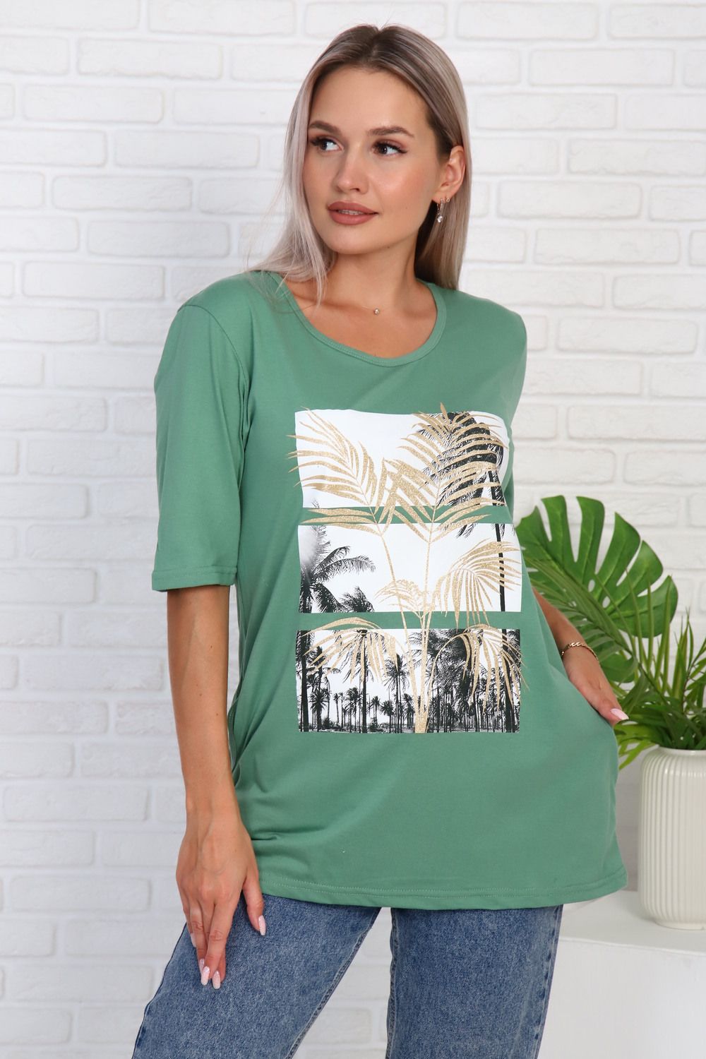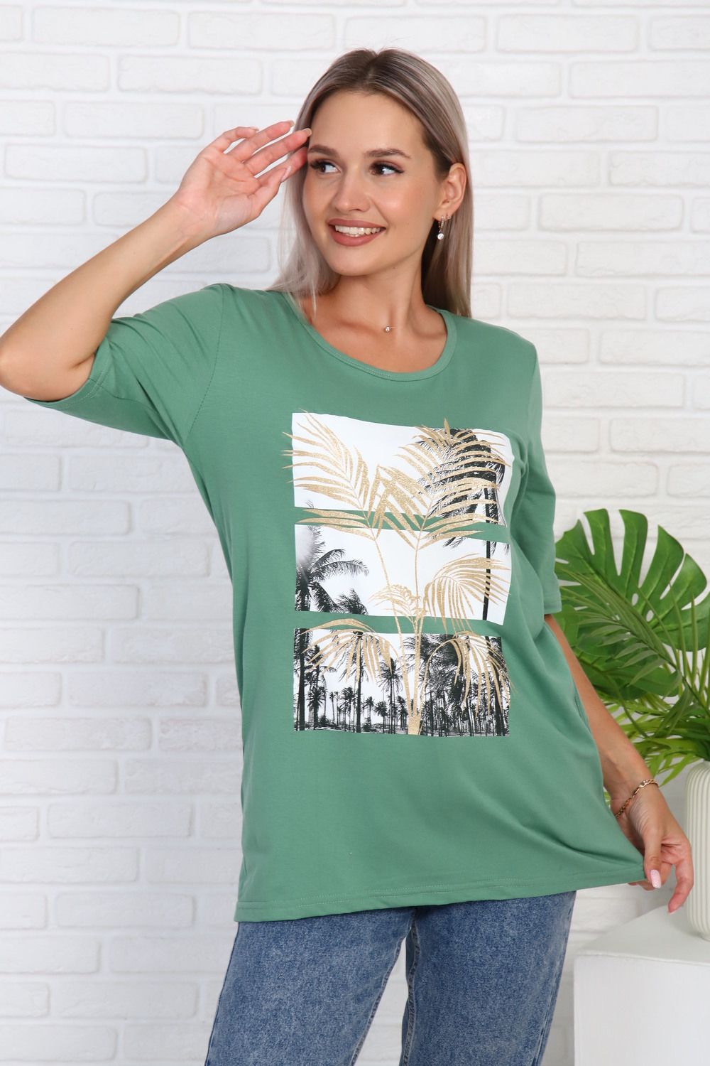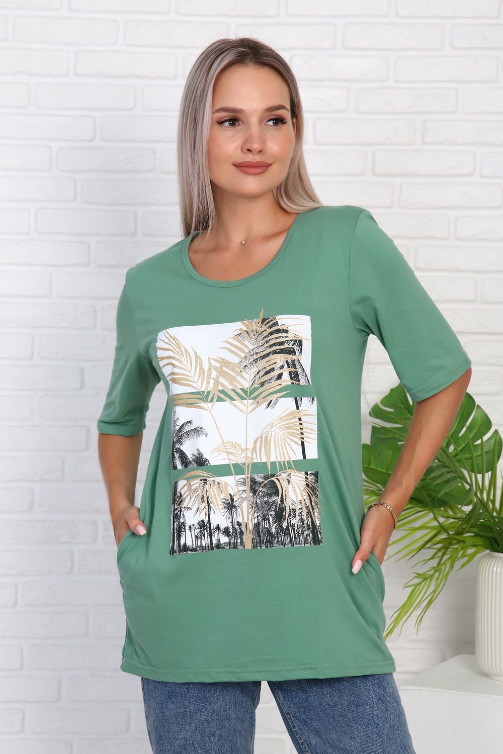 Футболка удлиненная с рисунком листья пальмы, Арт. 786 - оливковый