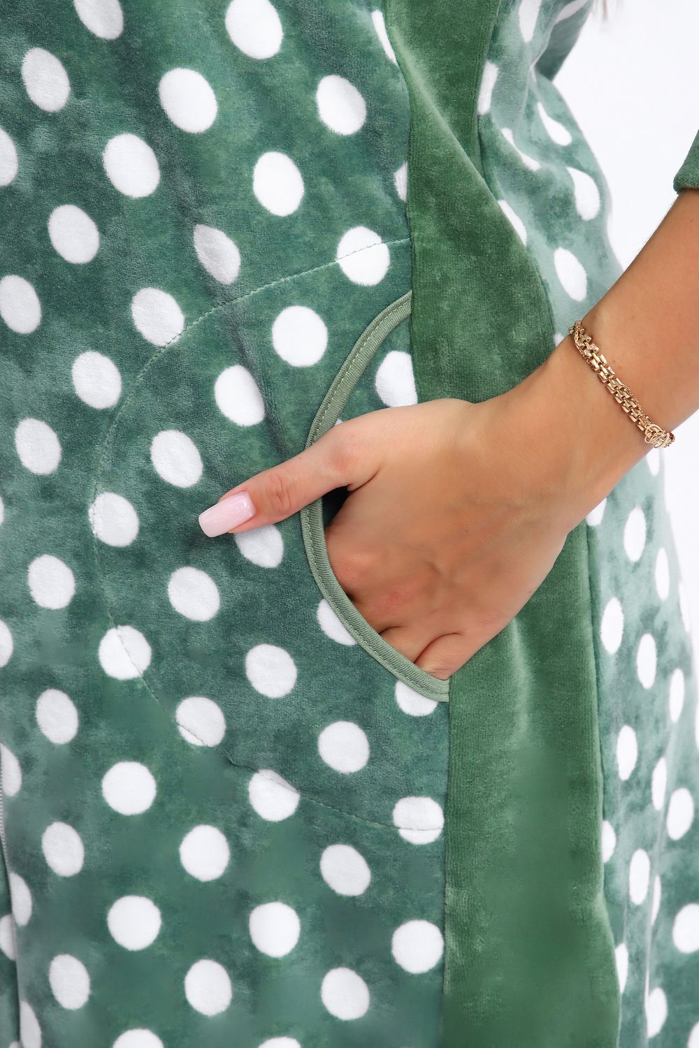 Халат велюровый на молнии в горошек. Воротник-стойка, рукава 3/4 на манжете, по бокам однотонная вставка, с карманами. Ткань велюр, качество отличное, после стирки цвет не теряет, не деформируется, приятное к телу. Для дома и отдыха.