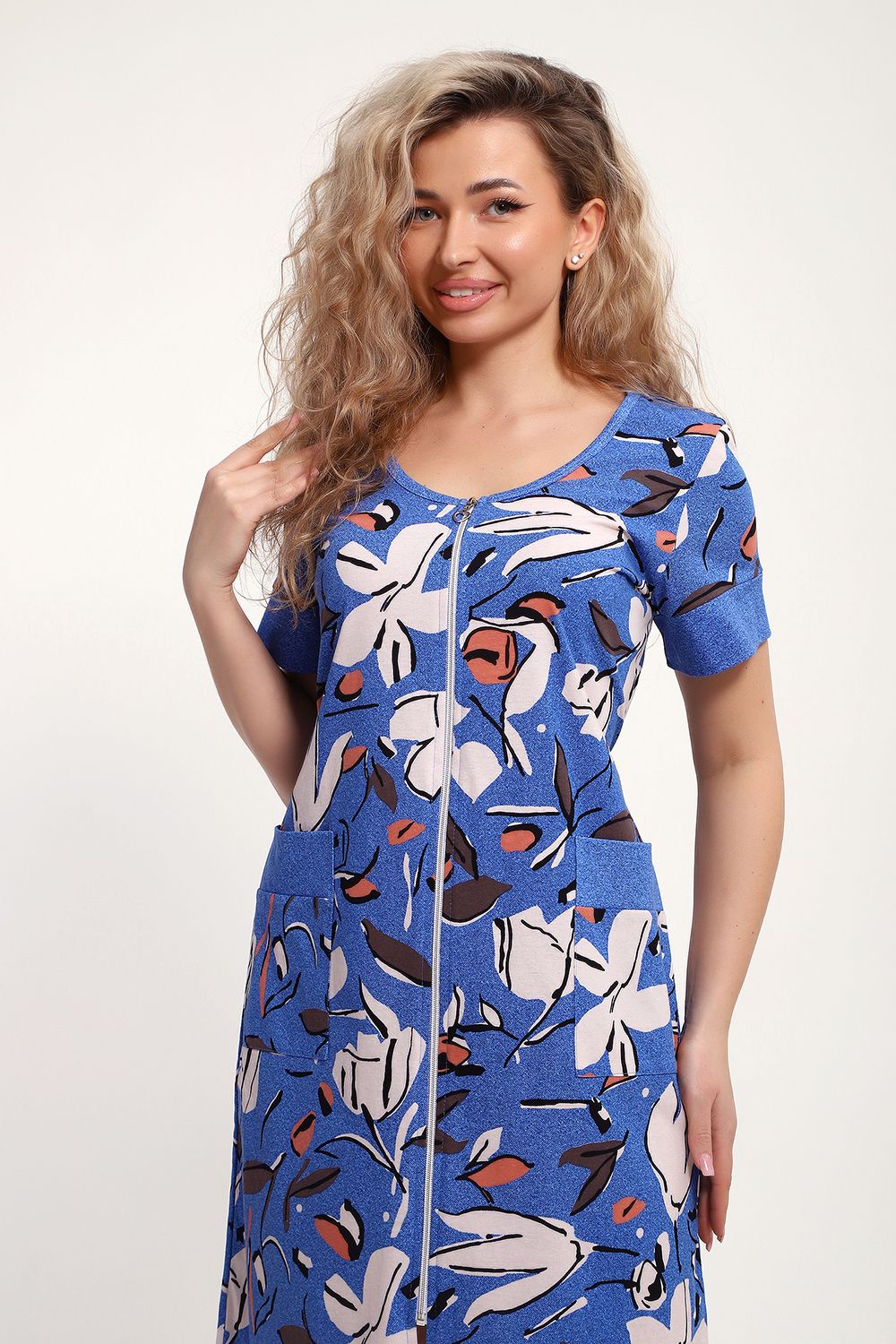 Женский халатик на молнии – самая распространенная и универсальная одежда для домашнего отдыха и хозяйственных хлопот. После трудного рабочего дня, приходя домой, первым делом хочется переодеться. И данная модель это идеальный вариант среди представительниц прекрасной половины человечества. Модель выполнена из 100% хлопчатобумажной ткани. Халат так же дополняет яркая отделка по рукавам и карманам. А пояс на линии талии поможет легко смоделировать женственный силуэт и при этом Вы будете чувствовать себя легко и непринуждённо. Данная модель прекрасно подойдёт для дома, дачи и отдыха, создавая по-настоящему яркий образ и хорошее настроение! Рост модели на фото 165см.