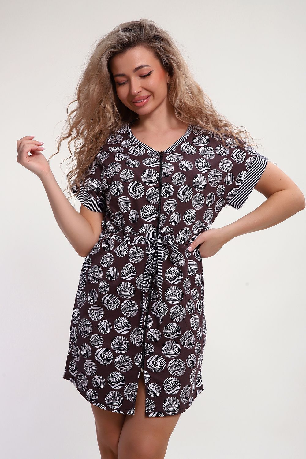 Женский трикотажный халат на молнии без сомнения станет самой желанной и любимой вещью в гардеробе любой дамы. Халатик укороченный, на кулисе со шнурком, с удобными карманами и молнией. Выглядит стильно и современно. Халатик такого плана подходит для фигур разного типа. Легкий и мягкий, качественный, дышащий, сшит из высококачественного трикотажа, подарит вам абсолютную непринужденность и легкость, простор в движении, идеально подойдет для беременных и кормящих и будет хорошим сопровождением в роддом и не вызовет раздражения, так как создан из натуральной ткани. Благодаря этому может стать прекрасным подарком для, мамы, подруги, бабушки, сестры или коллеги на любой праздник. Отлично сядет на женщин больших размеров. Данная модель будет кстати для отдыха на даче и даже поездки к морю. Домашняя одежда российского производства, имеет комфортную посадку, не линяет, не дает усадку после стирки и долго сохраняет первоначальный внешний вид. Халатик подчеркнет Ваш стиль и добавит молодежных нот в ваш образ, а затягивающийся пояс на талии придаст женственности и изящества вашему луку. Стирайте изделия из хлопка на бережном режиме с температурой не выше 30С, чтобы сохранить цвет, форму и фактуру материала. Приобретая наши изделия, радуйте себя и своих близких.