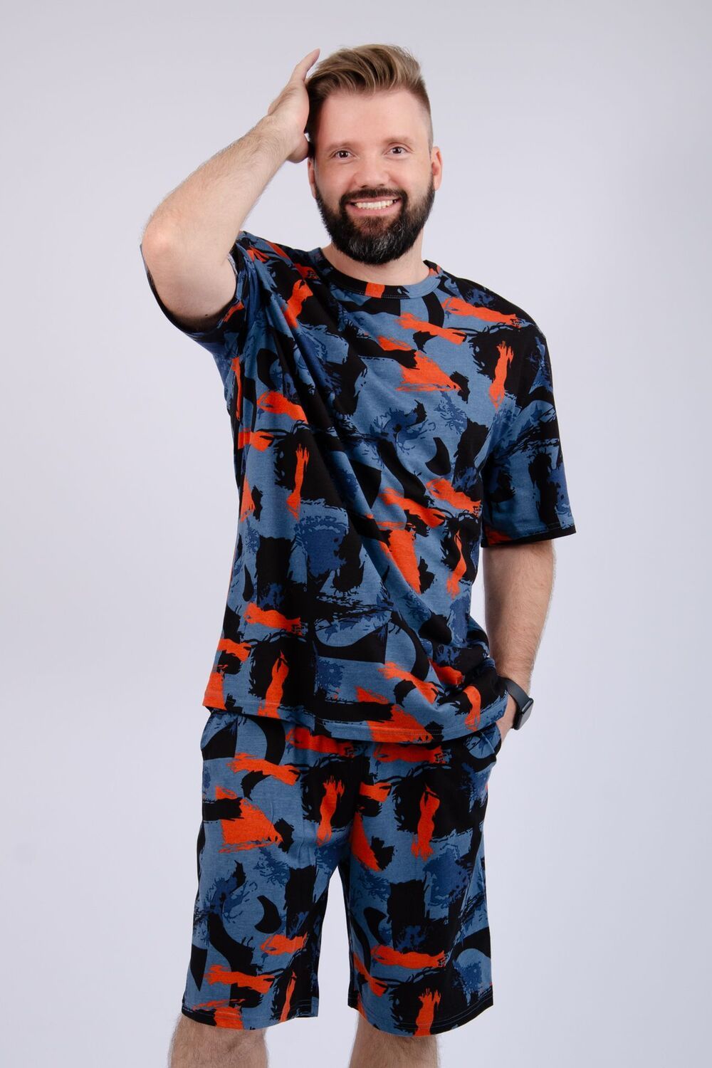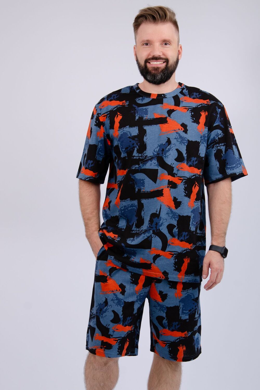 Костюм Харди изготовлен мягкого трикотажного материала. Комплект обеспечивает приятные ощущения на коже и отличную воздухопроницаемость. Включает футболку оверсайз и шорты, которые не сковывают движений и идеально подходят для комфортного использования.