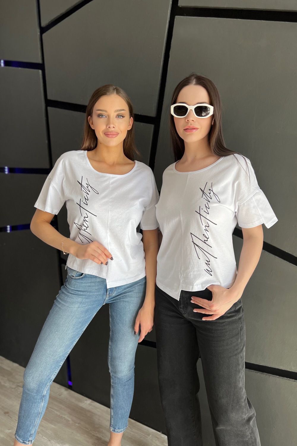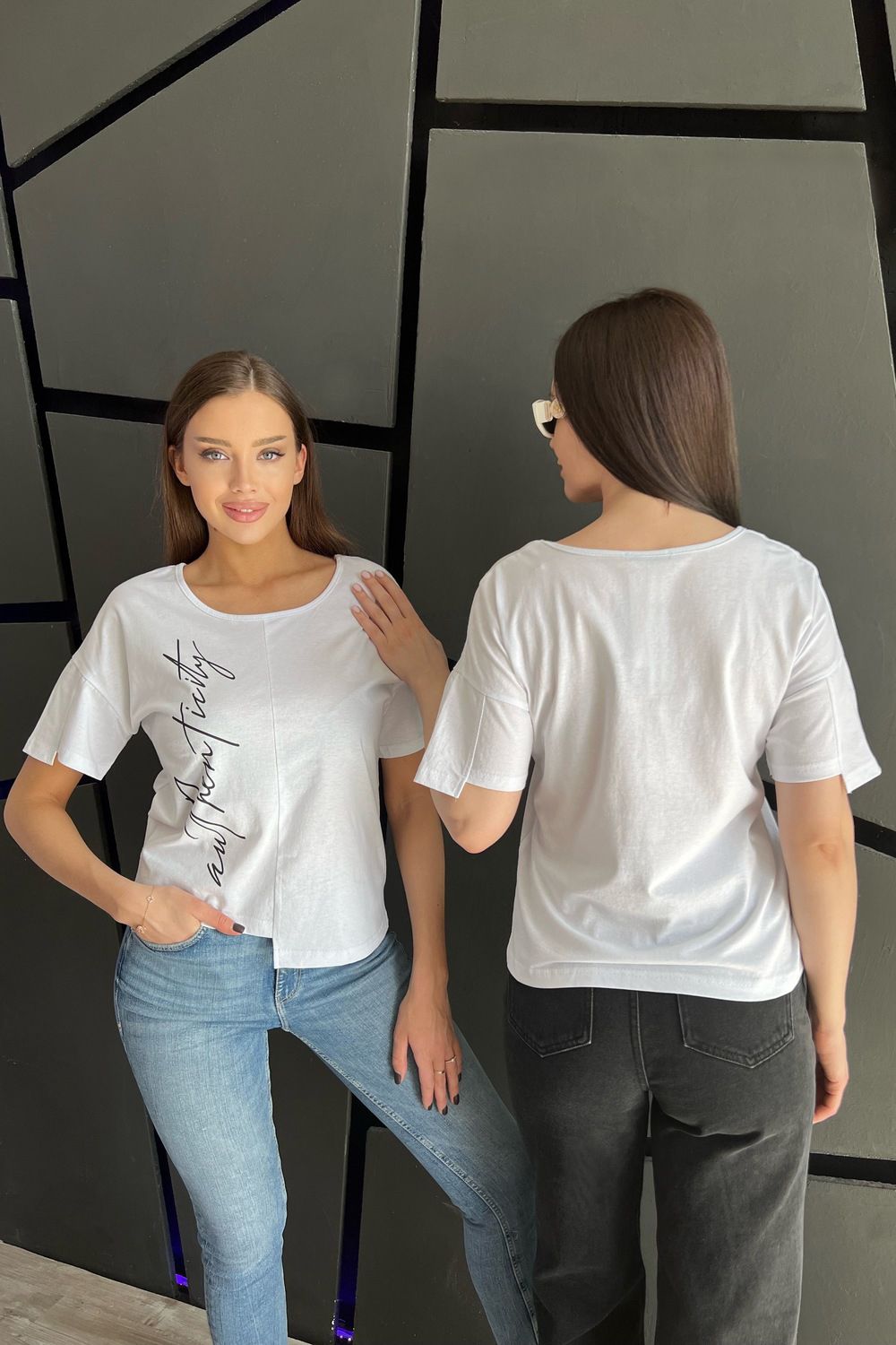 Футболка прямого силуэта, с округлой горловиной. Рукав короткий, с фигурной линией низа. Горловина обработана бейкой из основного полотна.