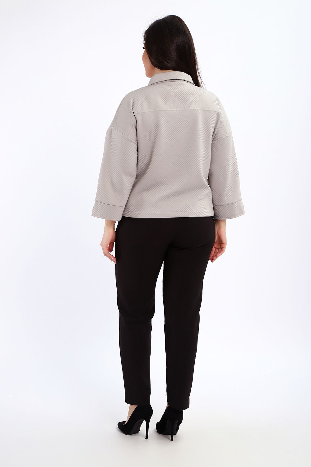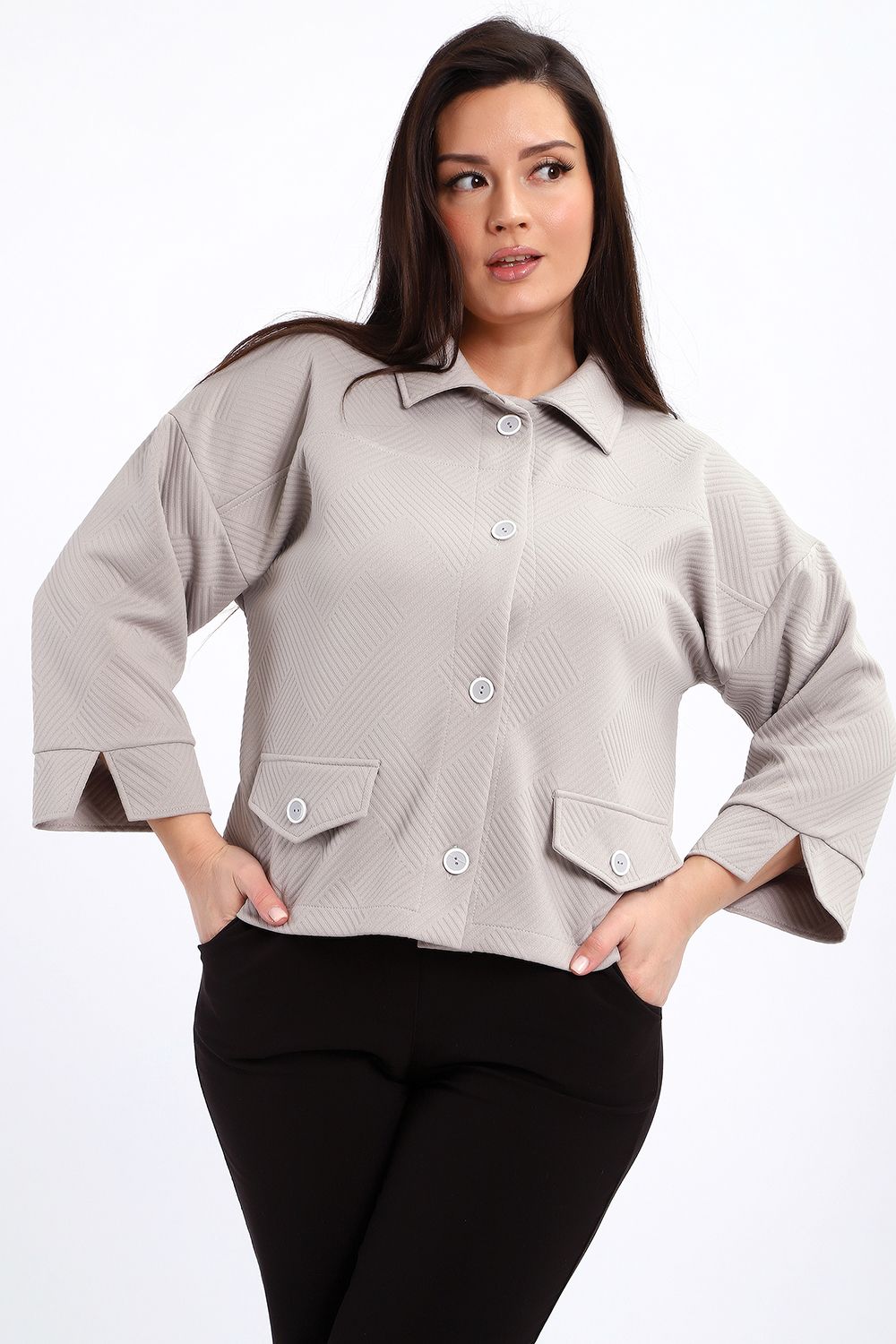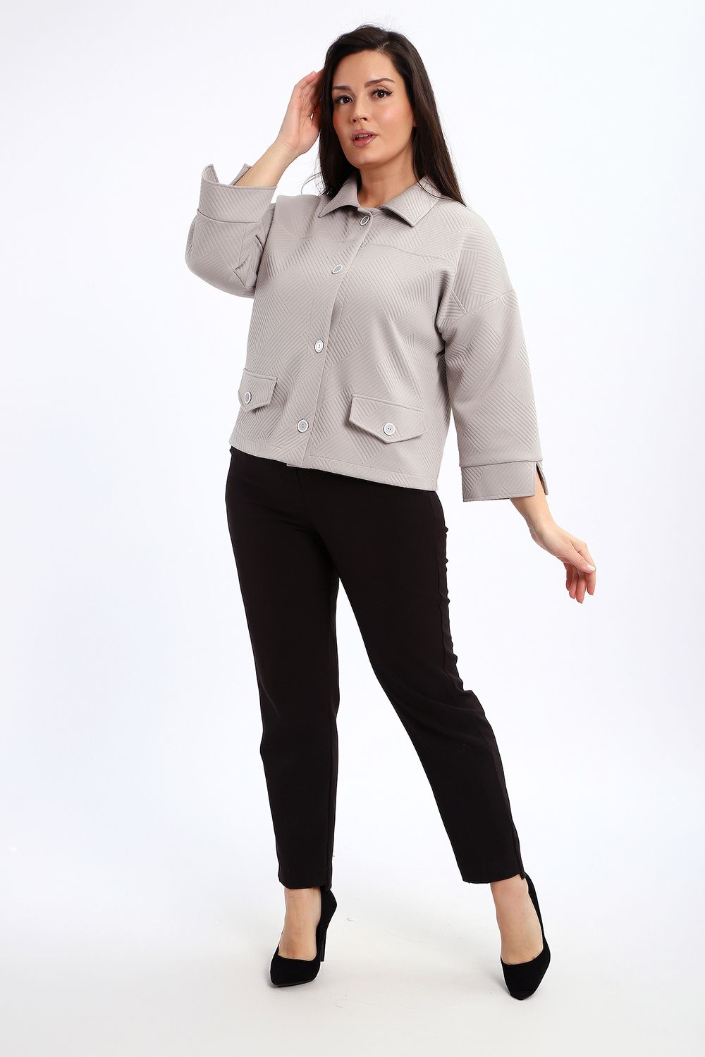 Жакет свободного прямого кроя длиной до линии бедра. Отложной воротник, рукав 3/4 удобен для дам разного роста, на рукавах манжеты с разрезом добавляют шарма изделию. Жакет декорирован фальш-клапанами с пуговицами.