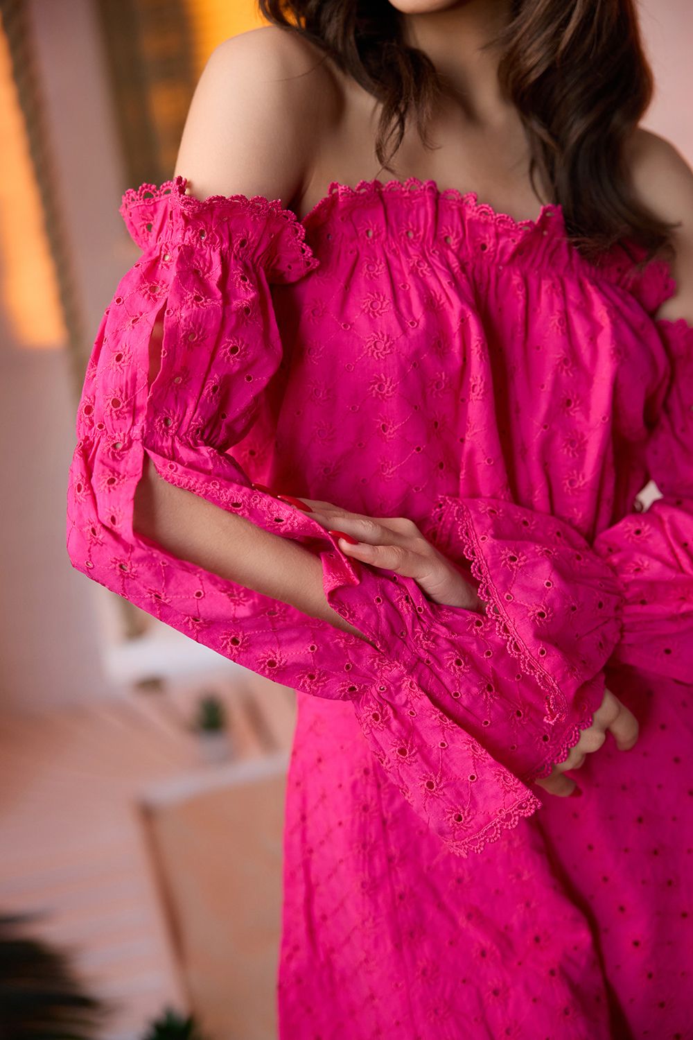 Молодежный костюм состоит из топа с открытыми плечами и с длинными рукавами, и мини юбки.