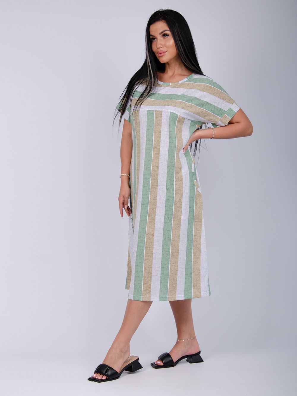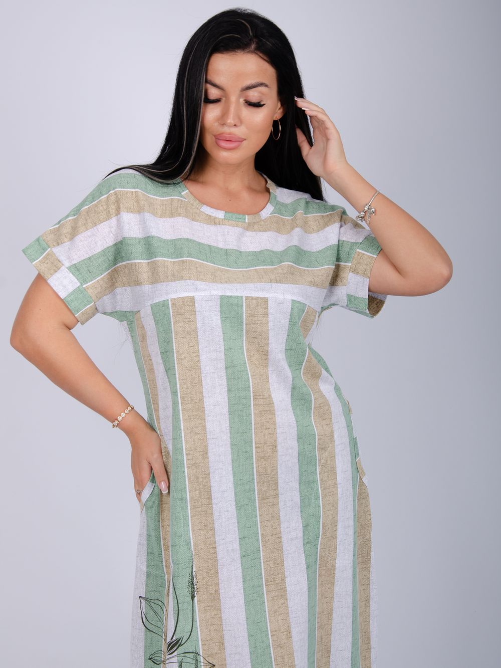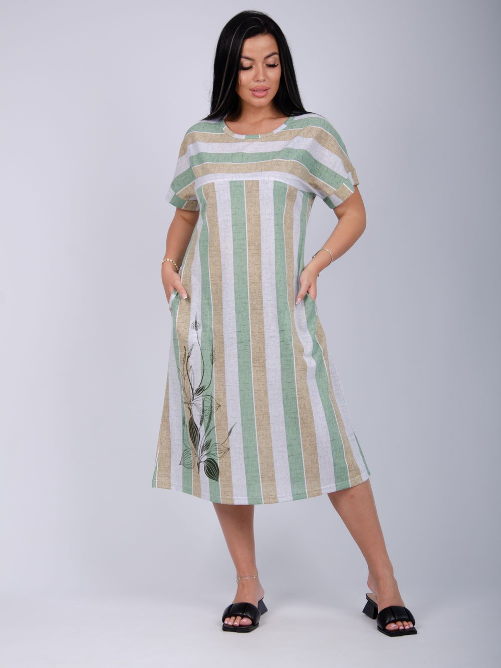Платье Камилла зготовлено из мягкого хлопкового полотна кулирка, обеспечивает комфорт даже в жаркие дни. Подходит для ежедневного ношения благодаря повседневному стилю и удобству конструкции без застежки. Рукава средней длины на базе спущенного плеча, не стесняют движений.