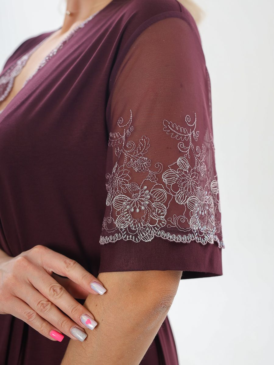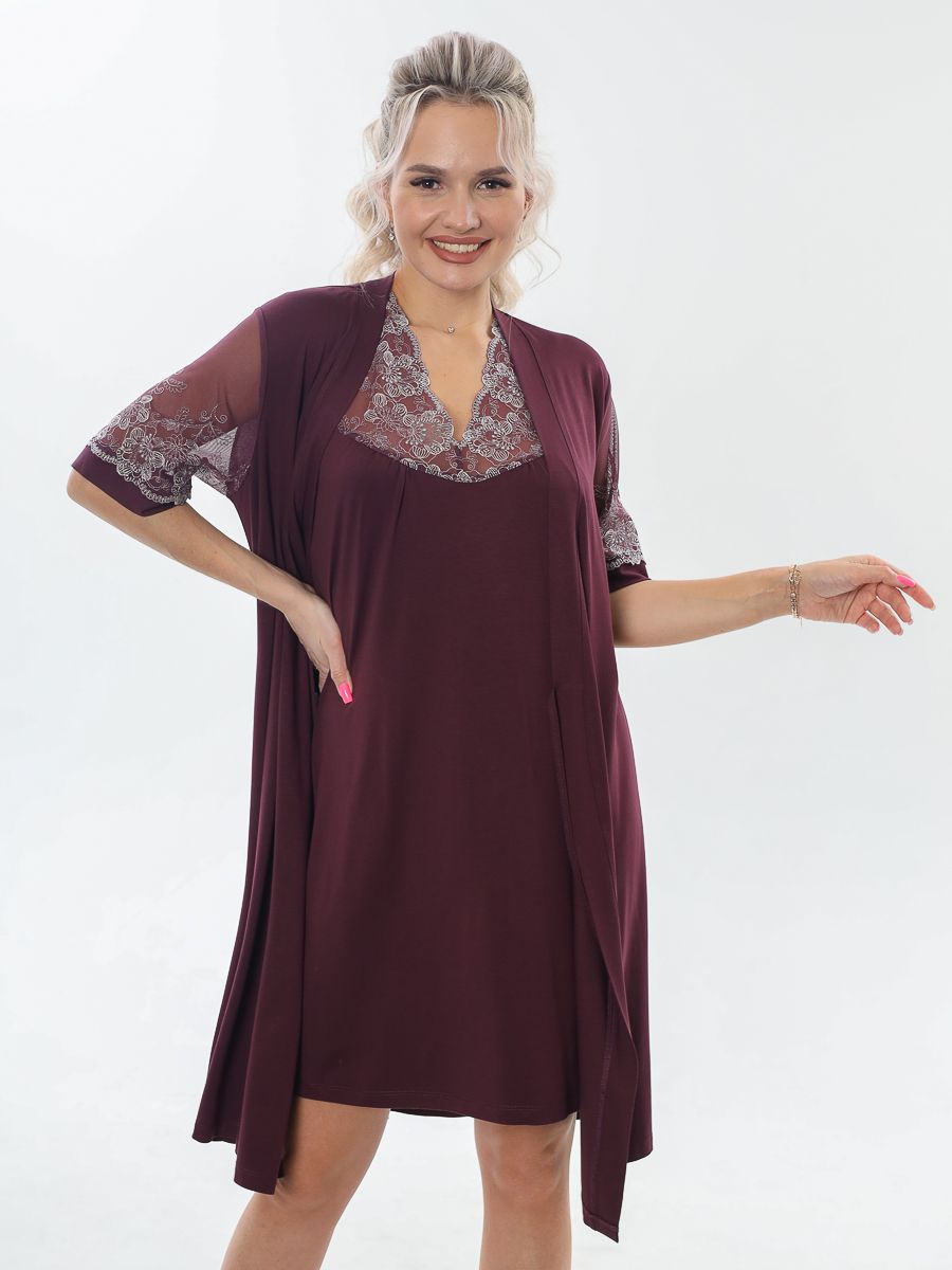 Кружевной трикотажный пеньюар - идеальный выбор для комфортного и элегантного отдыха дома. Изготовлен из высококачественной вискозы. Сорочка длинною до колена, вверх изделия украшен изысканным кружевом на сетке премиум качества. Халат, длиной за колено, с запахом, короткие рукава из сетки с кружевом добавляют нотку романтики и женственности. Модель пеньюара подходит для женщин с большими размерами и беременным, благодаря отличной тянущейся вискозе, которая обеспечивает идеальное прилегание и свободу движений. Простота и лаконичность дизайна этого комплекта прекрасно сочетаются с изысканностью и стилем, делая его незаменимым атрибутом вашего гардероба для специальных моментов отдыха или для повседневного использования.