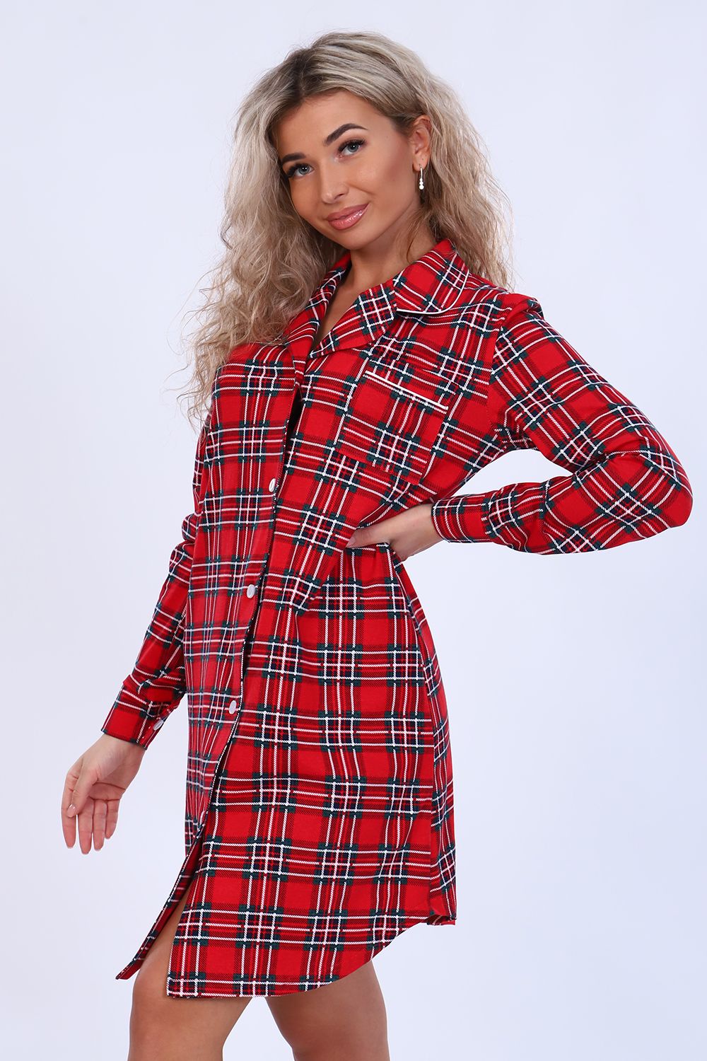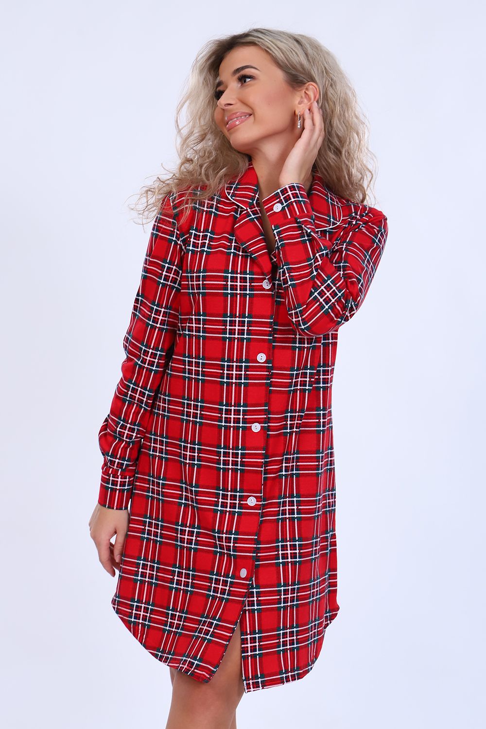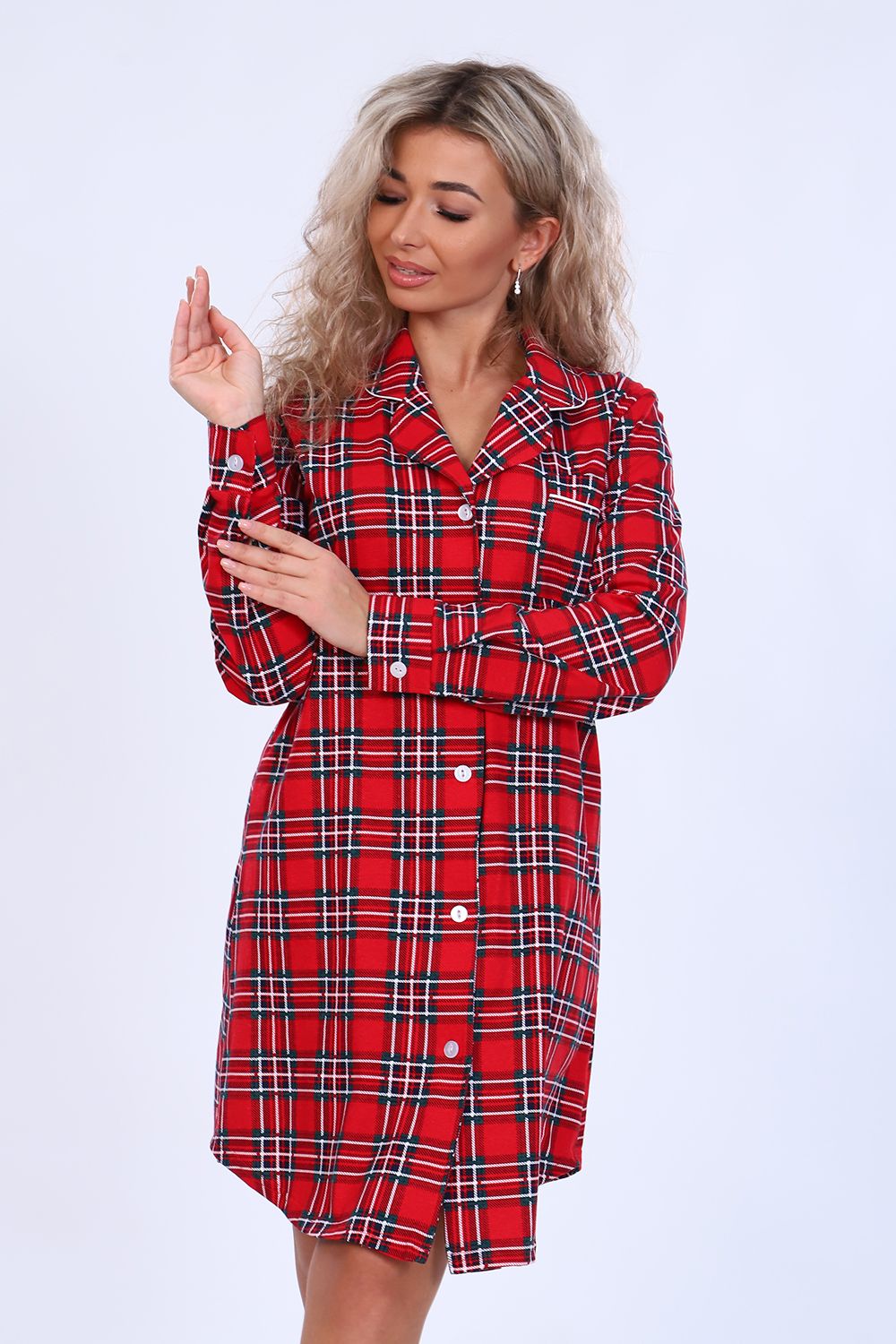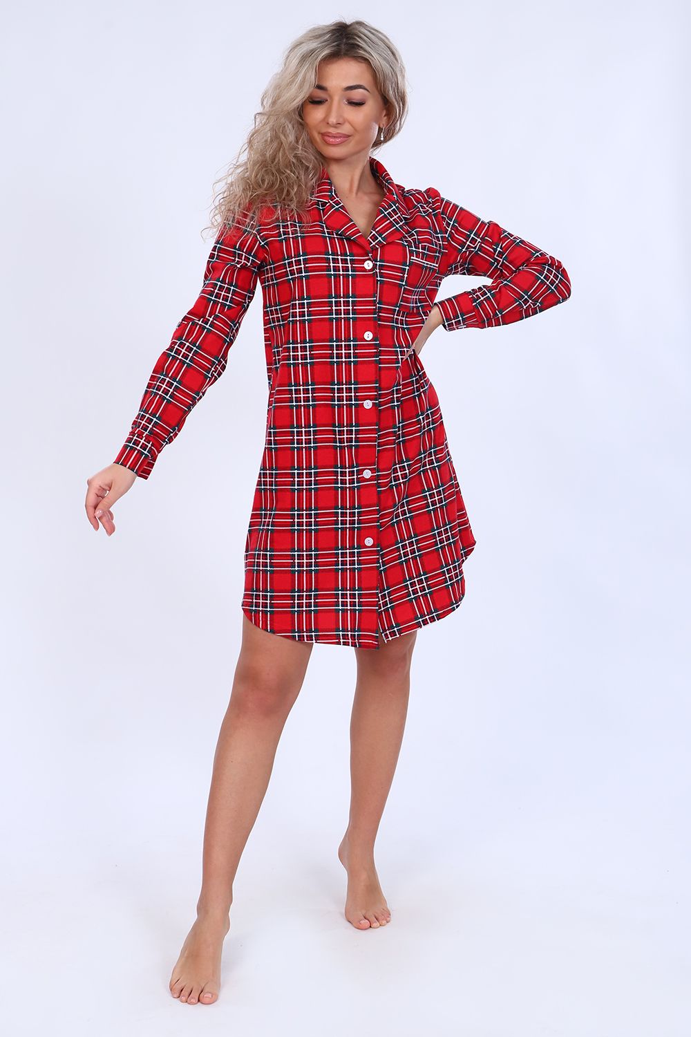 Женский халат-рубашка на пуговицах чуть выше колена с длинным рукавом на манжете. Разрез рукава окантован. На груди с левой стороны накладной карман с отделкой из канта. Воротник фигурный рубашечного типа, обработан кантом. Низ рубашки закруглен и образует небольшие разрезы по бокам. Модель выполнена из высококачественного 100% хлопка, на ощупь ткань напоминает фланель, что создает комфорт и уют при носке. Модный дизайн. Можно носить дома как халат-рубашку или на улице как платье. Подойдет на любую фигуру, скроет недостатки. Широкий размерный ряд. Отличный подарок любимым!