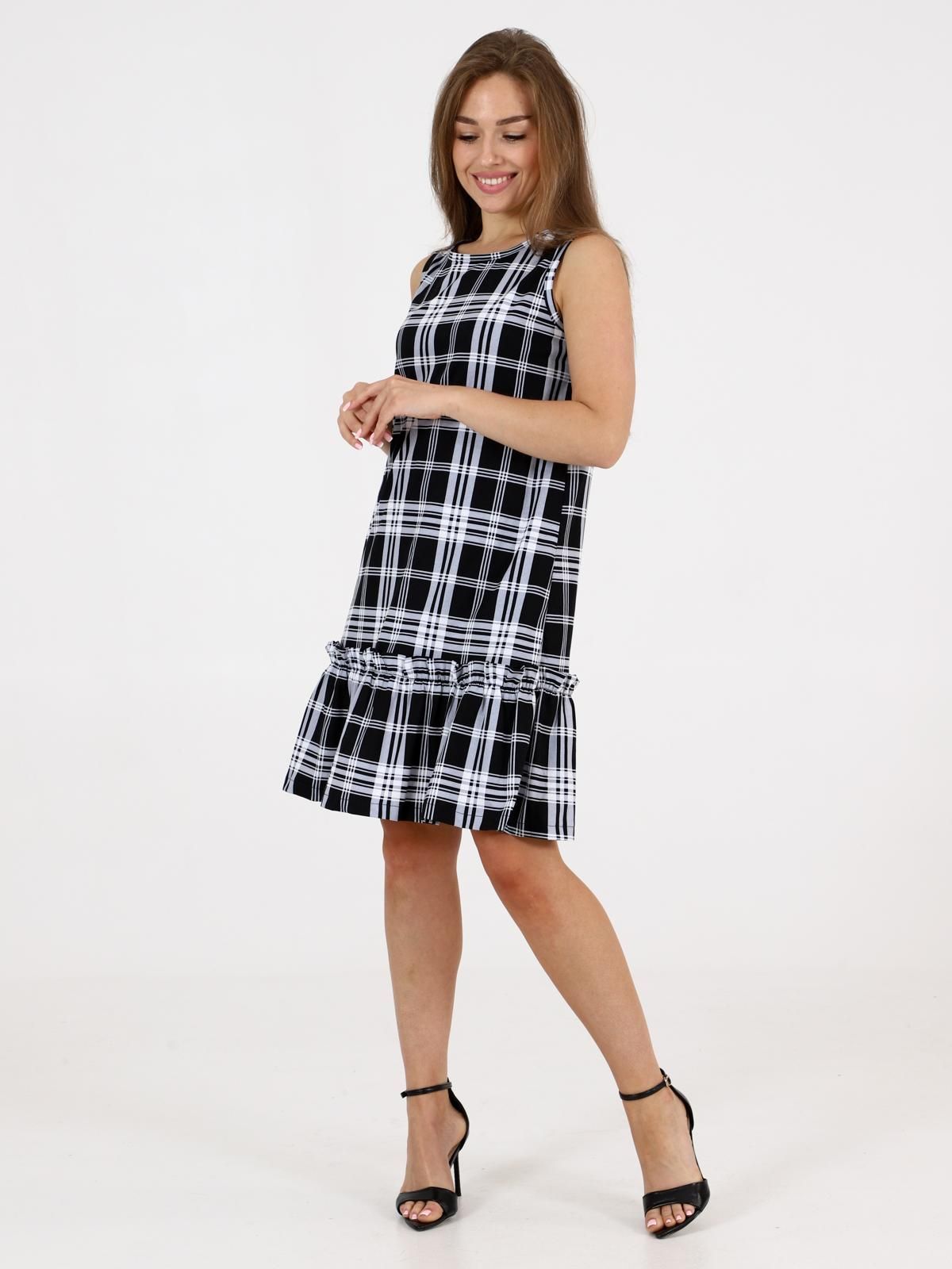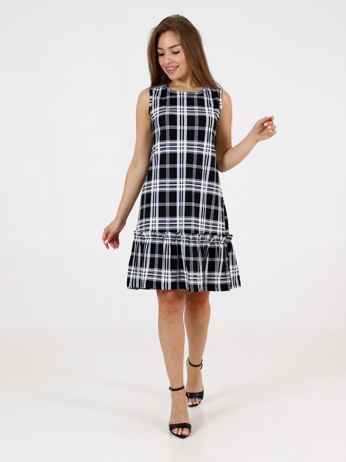 Платье женское из набивной кулирки свободного силуэта, без рукавов. По низу изделия - настрочная оборка.