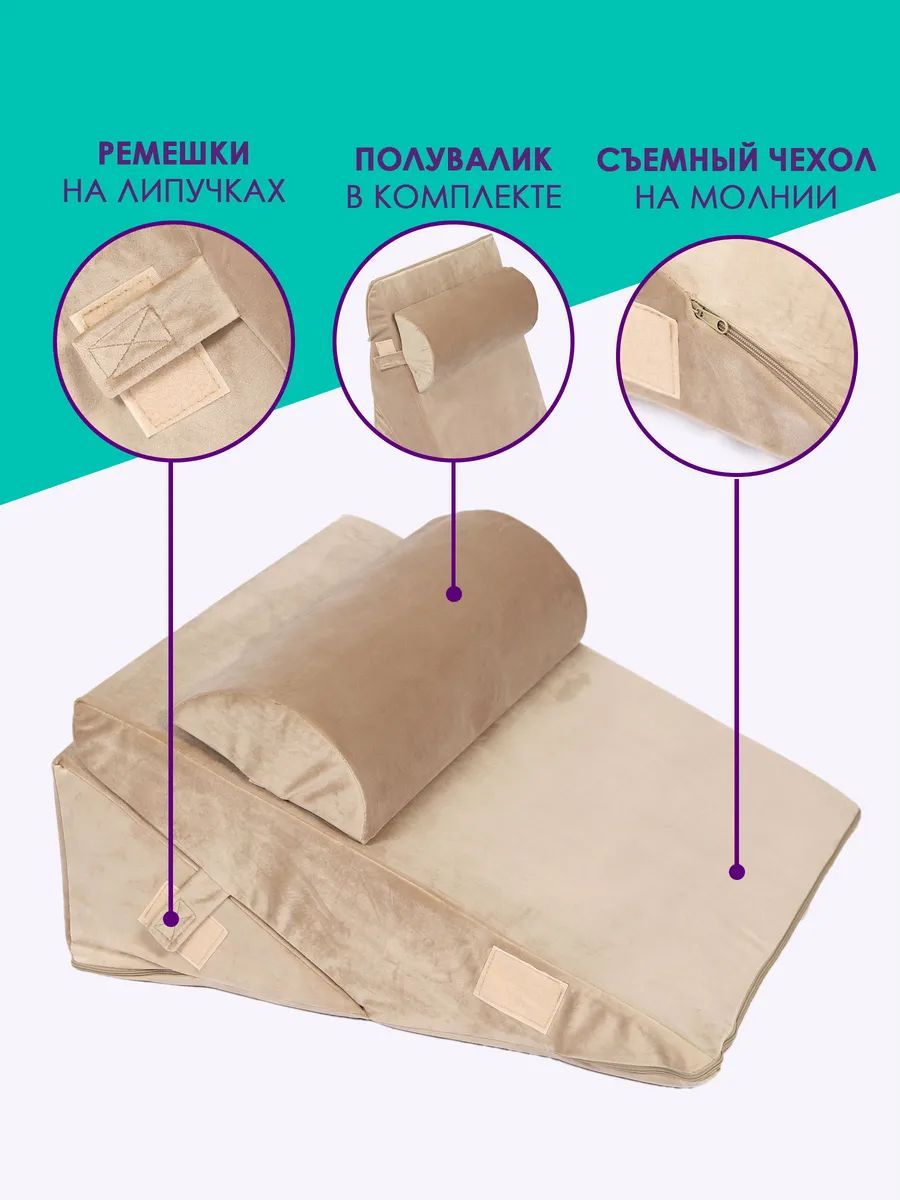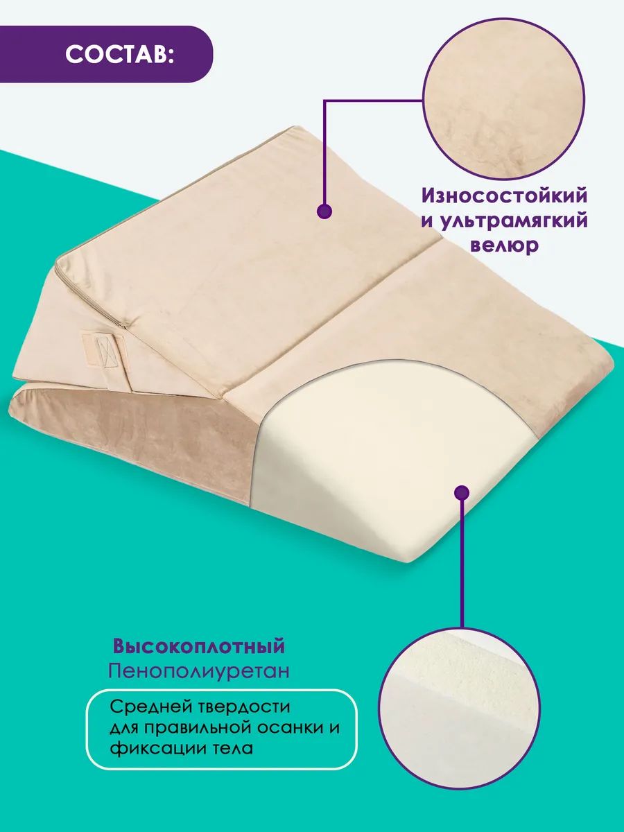 Клиновидная подушка при гэрб для сидения и сна PTK, велюр, поролон, трансформер - бежевый