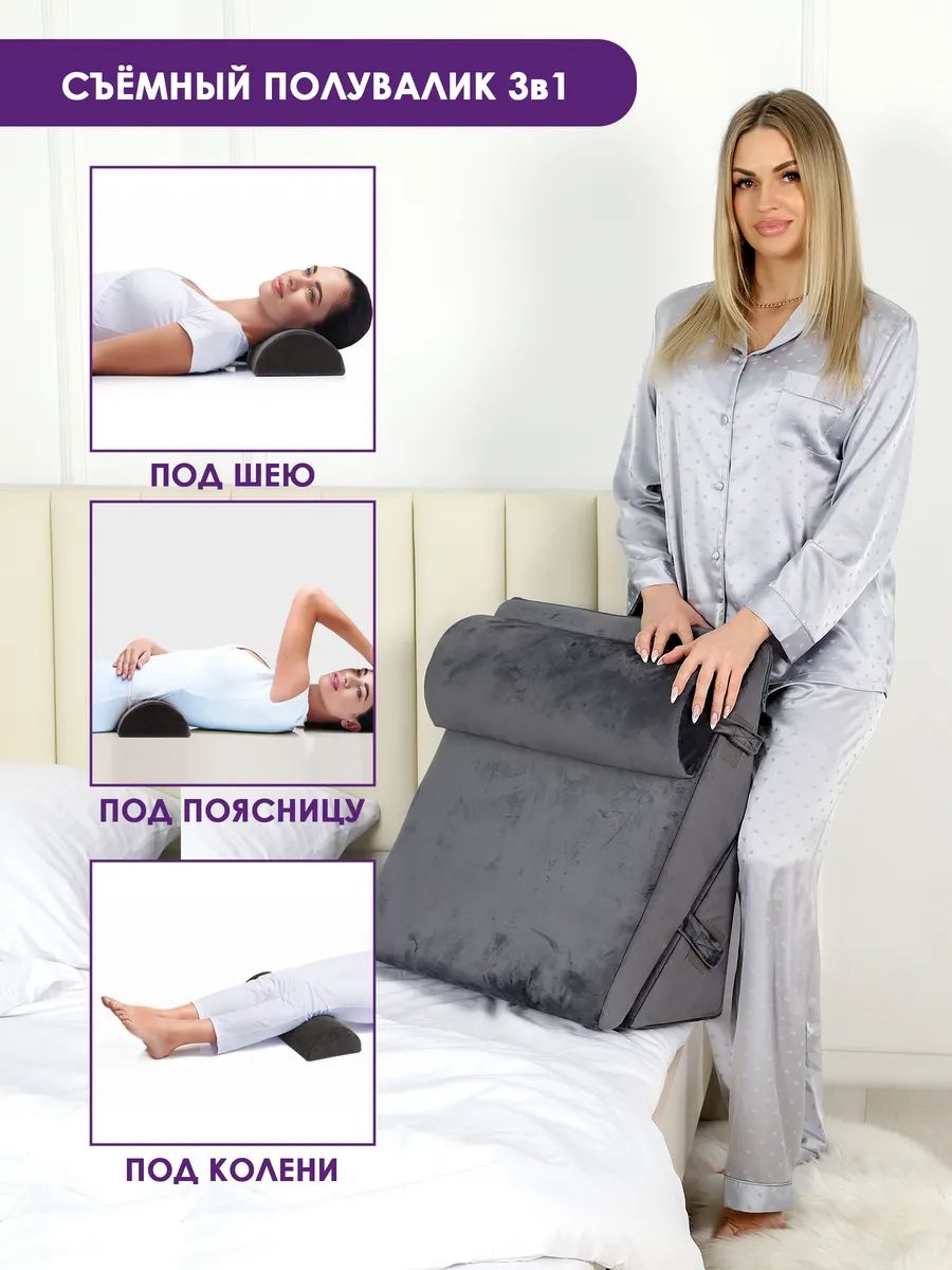 Модель отлично подходит для чтения, просмотра телевизора и работы за ноутбуком. Регулируемый угол наклона от 30 до 60 градусов позволяет легко подобрать оптимальное положение — для расслабления, поддержки спины сидя или размещения под ногами и коленями. Наклон в 30 градусов удобен при рефлюксе (ГЭРБ), а наклон в 60 градусов идеально подходит для поддержки коленей.