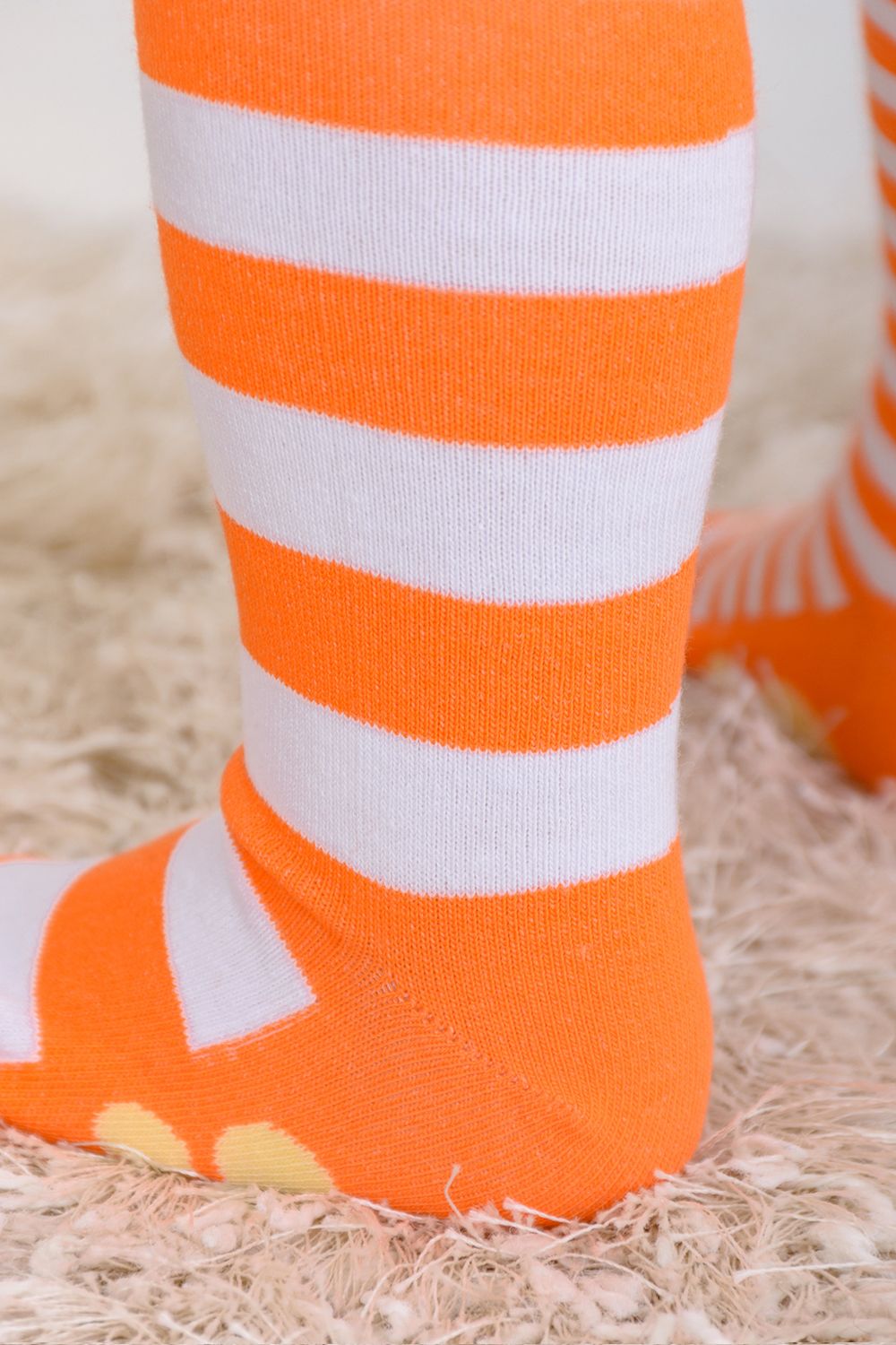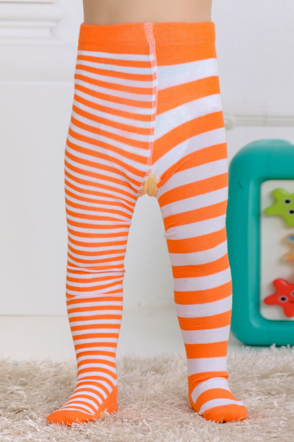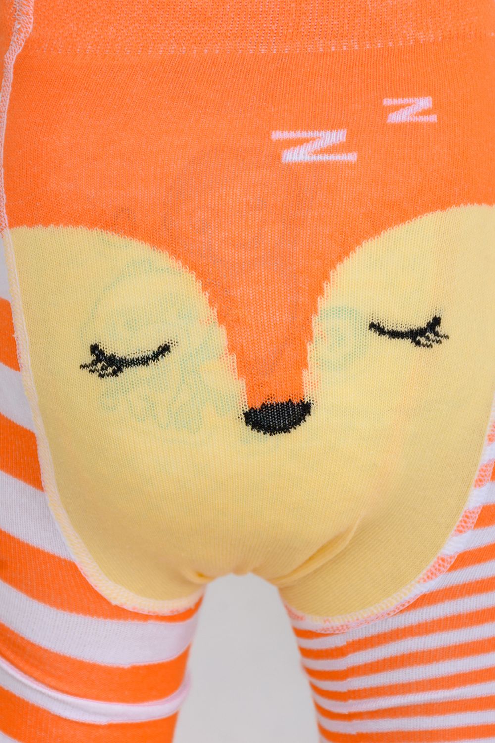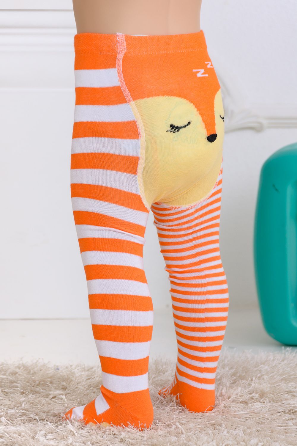 Яркие колготки для малышей. Оригинальная расцветка в полоску - по одной ножке широкая полоса, по другой - узкая. На стопе вывязаны милые лапки, сзади - мордочка спящего лисенка