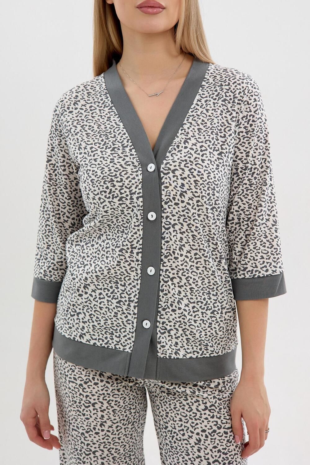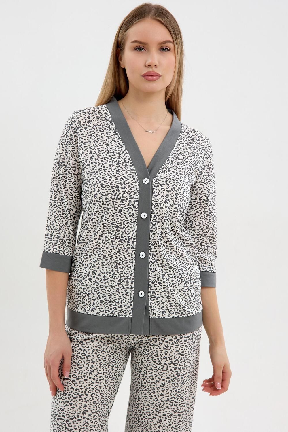 Женская пижама из 100% хлопка — идеальный вариант для комфортного сна и уютного отдыха дома. Натуральная ткань мягкая, дышащая и приятная к телу, подходит для повседневного использования в любое время года. Модель выполнена в удобном свободном силуэте, не сковывает движений и обеспечивает максимальный комфорт. Брюки на мягкой резинке, без карманов, удобно сидят по фигуре и не создают лишнего объёма. Кофта застёгивается на пуговицы, что делает пижаму практичной и комфортной в носке, а рукав длиной 3/4 обеспечивает удобство и свободу движений. Пижама отлично подходит не только для сна, но и в качестве стильного и уютного домашнего костюма. Модель представлена в широком размерном ряду и выполнена в трендовых расцветках с актуальными принтами, благодаря чему станет прекрасным подарком для родных и близких — практичным, красивым и по-настоящему комфортным.
