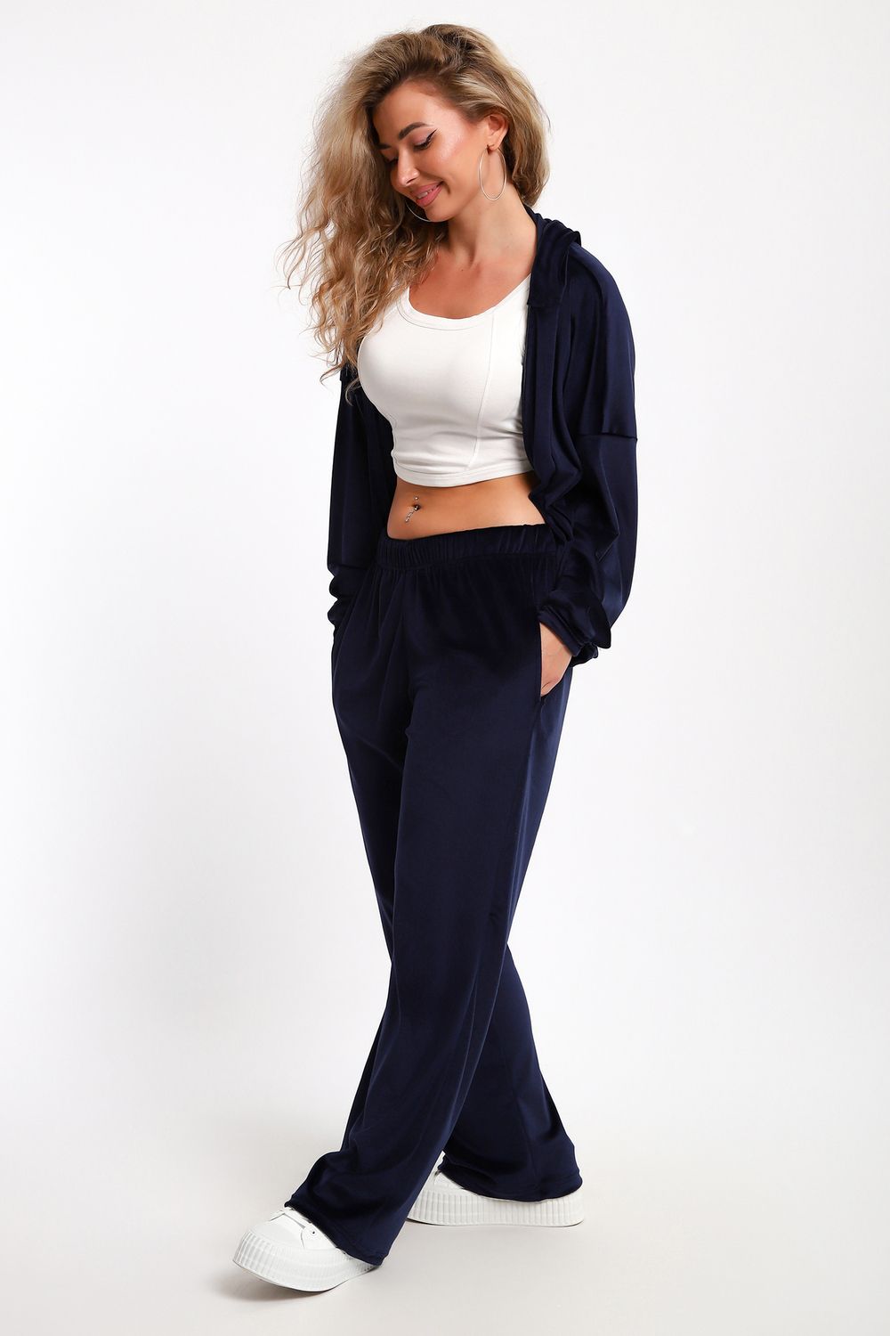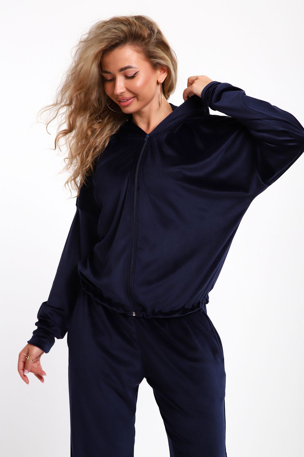Костюм женский велюровый состоит из толстовки на молнии и брюк. Толстовка с глубоким капюшоном, по низу утягивающий шнур с фиксаторами, рукав спущенный с манжетом, брюки прямые с карманами. Костюм мягкий, удобный, отлично подойдет для дома, прогулок и отдыха.