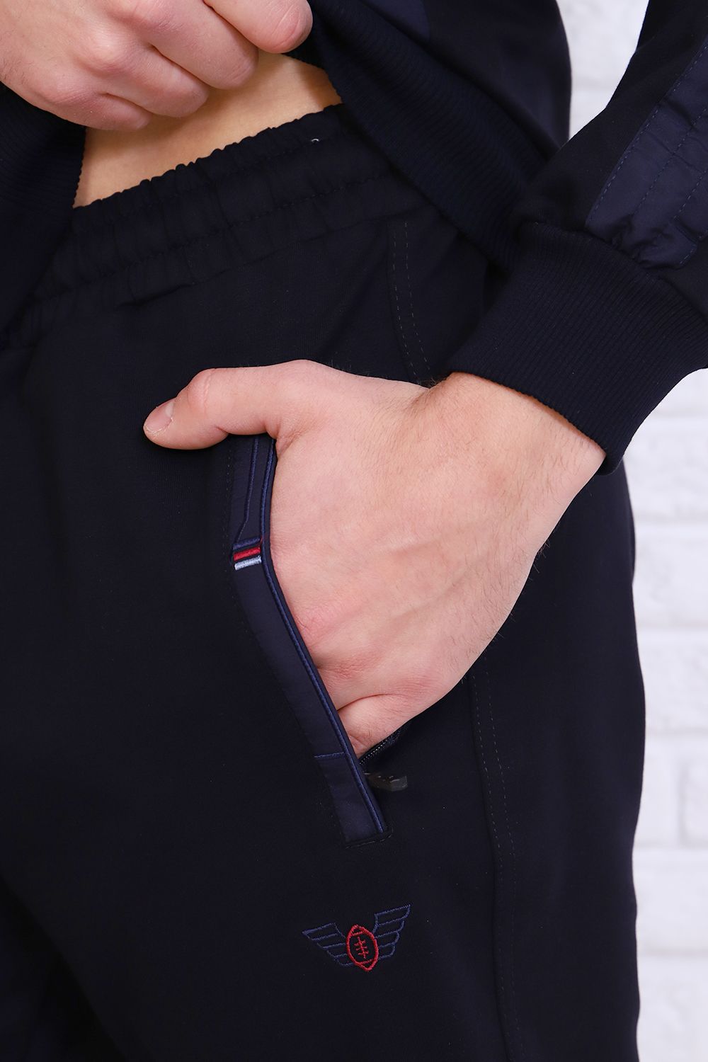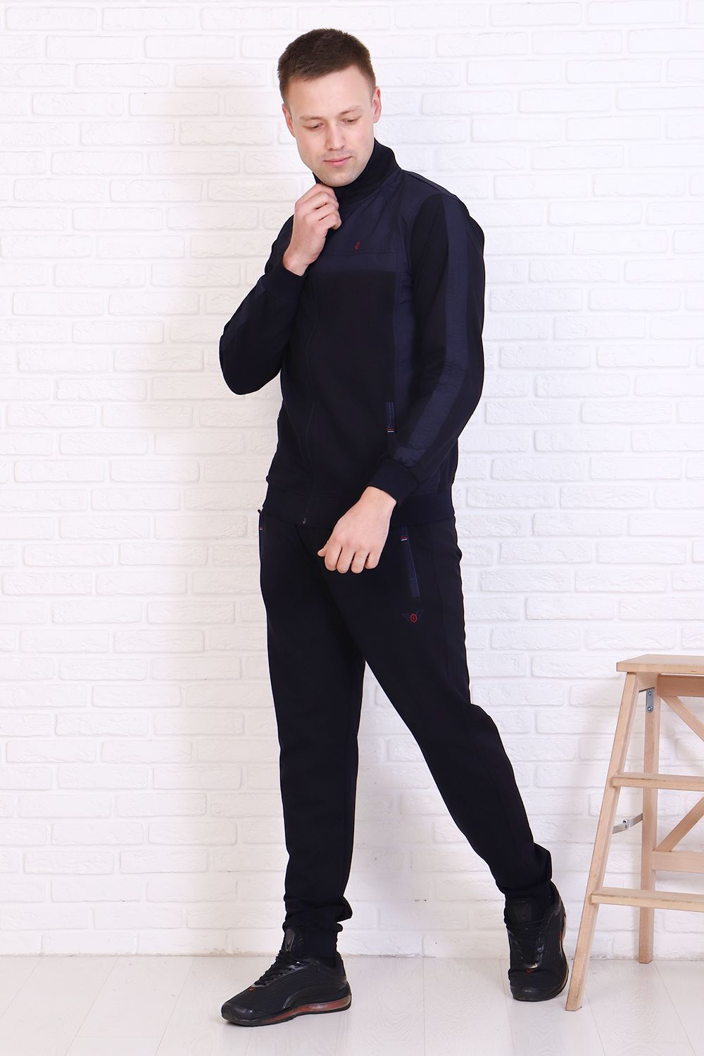 Мужской костюм спортивного плана. Кофта и карманы по бокам на молнии, сверху карман - обманка. На рукавах, по бокам кофты и сверху - вставка из плащевки. Воротник - стойка, рукава и низ кофты на манжетах. Брюки на манжетах, карманы на молнии, с декоративной листочкой. Сбоку на брюках и толстовке вышивная надпись.