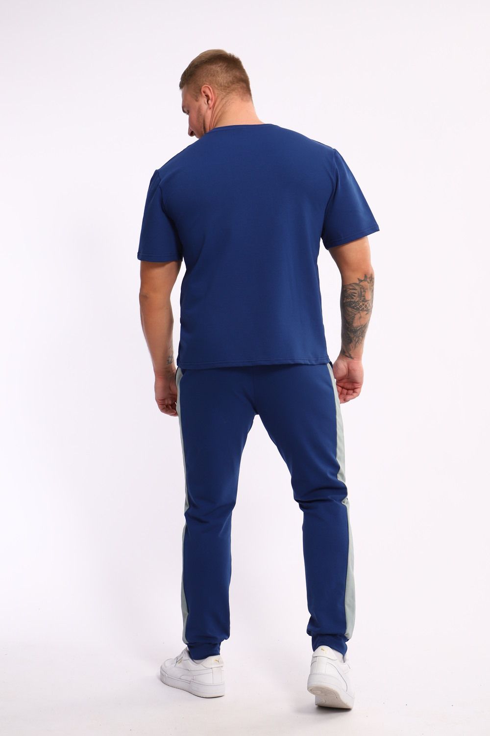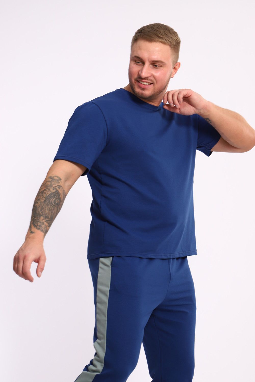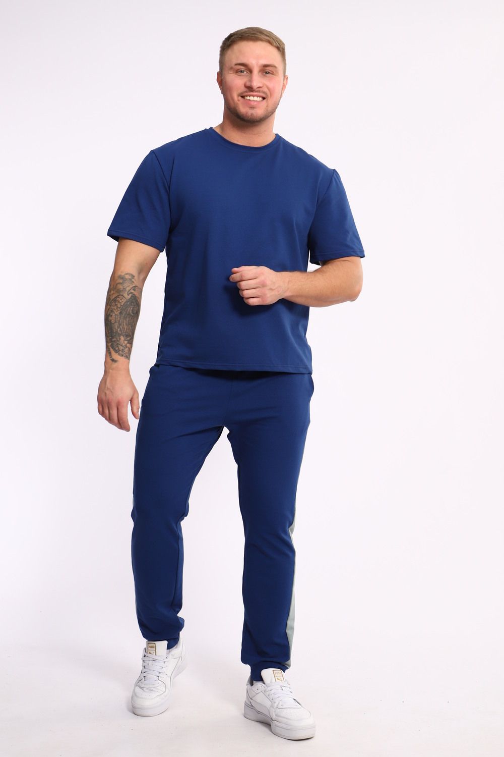 Стильный мужской костюм из мягкого и приятного на ощупь материала . Комплект состоит из футболки свободного кроя и комфортных прямых брюк с эластичным поясом и контрастной вставкой по бокам. Лаконичный дизайн делает этот костюм универсальным выбором для повседневной носки, прогулок или активного отдыха. Идеально сочетается с кроссовками для создания модного спортивного образа.