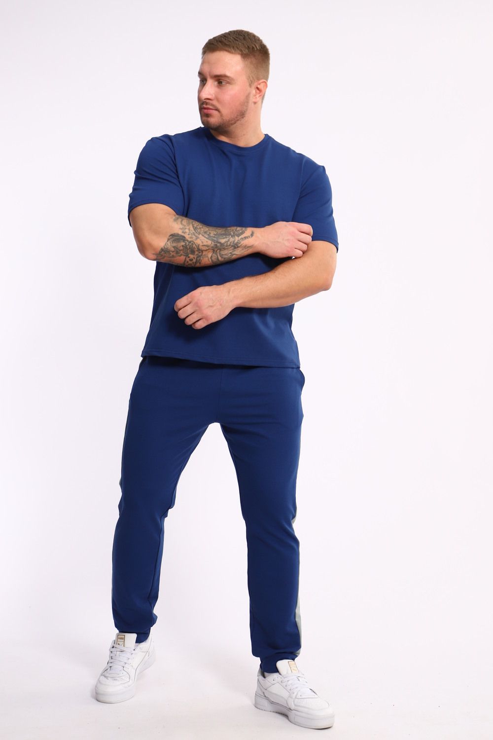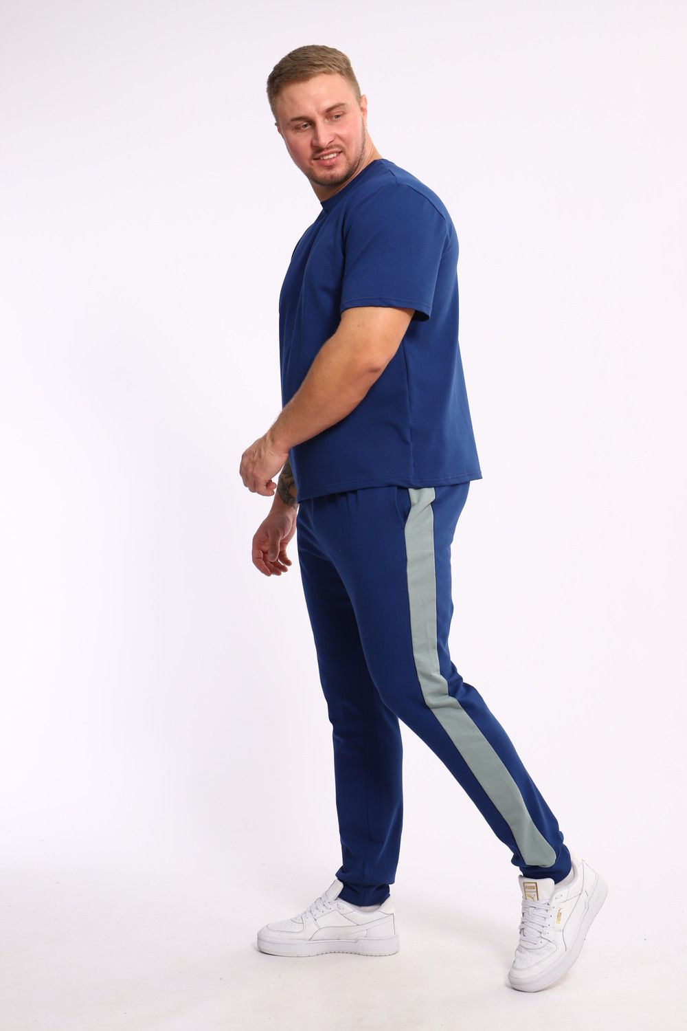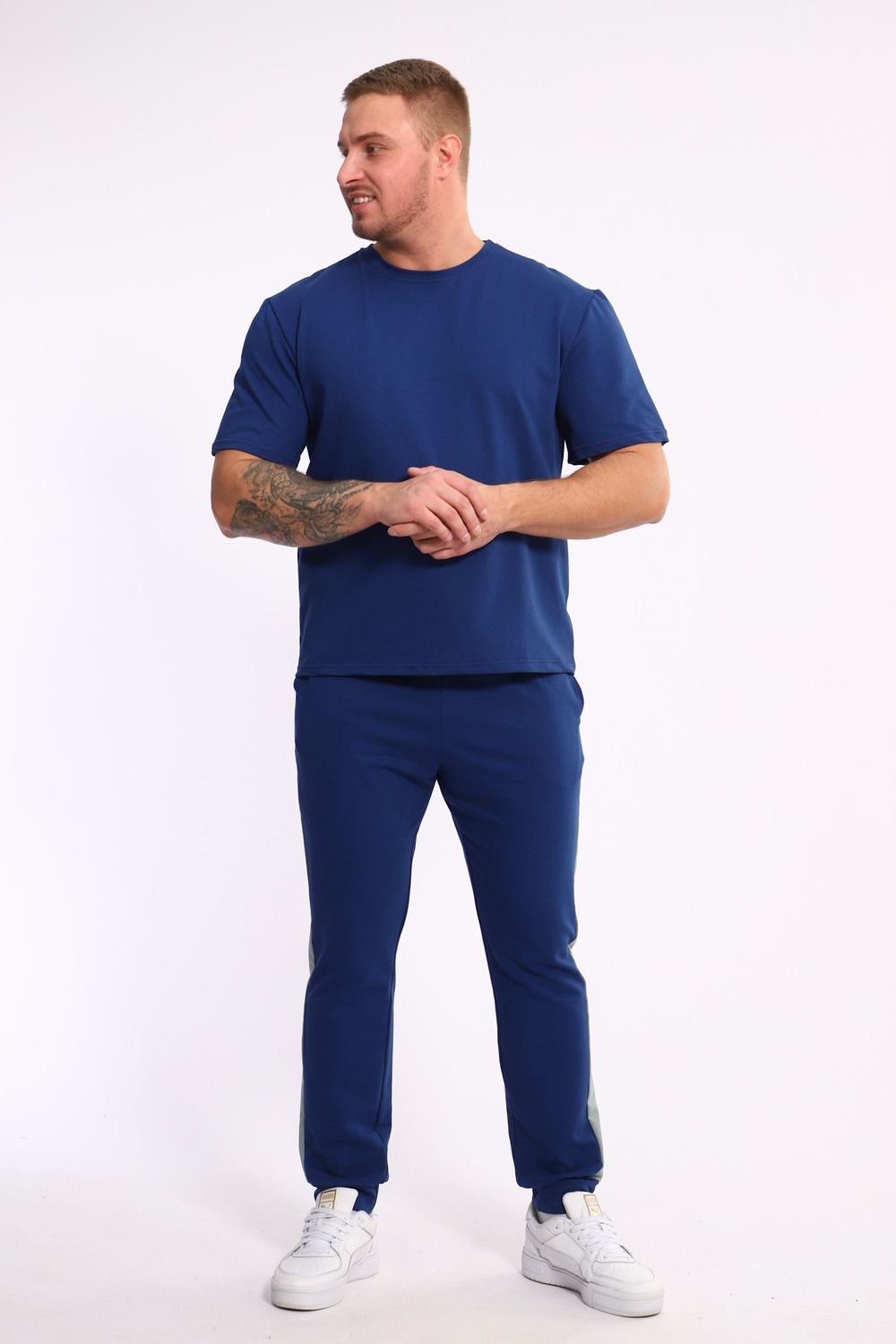 Стильный мужской костюм из мягкого и приятного на ощупь материала . Комплект состоит из футболки свободного кроя и комфортных прямых брюк с эластичным поясом и контрастной вставкой по бокам. Лаконичный дизайн делает этот костюм универсальным выбором для повседневной носки, прогулок или активного отдыха. Идеально сочетается с кроссовками для создания модного спортивного образа.