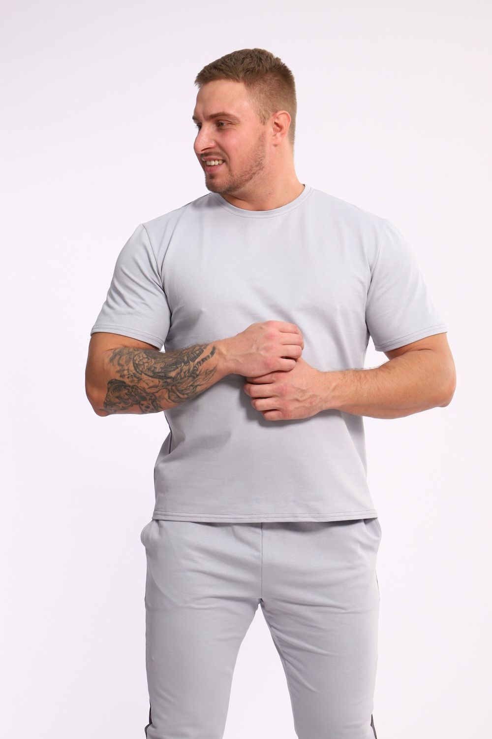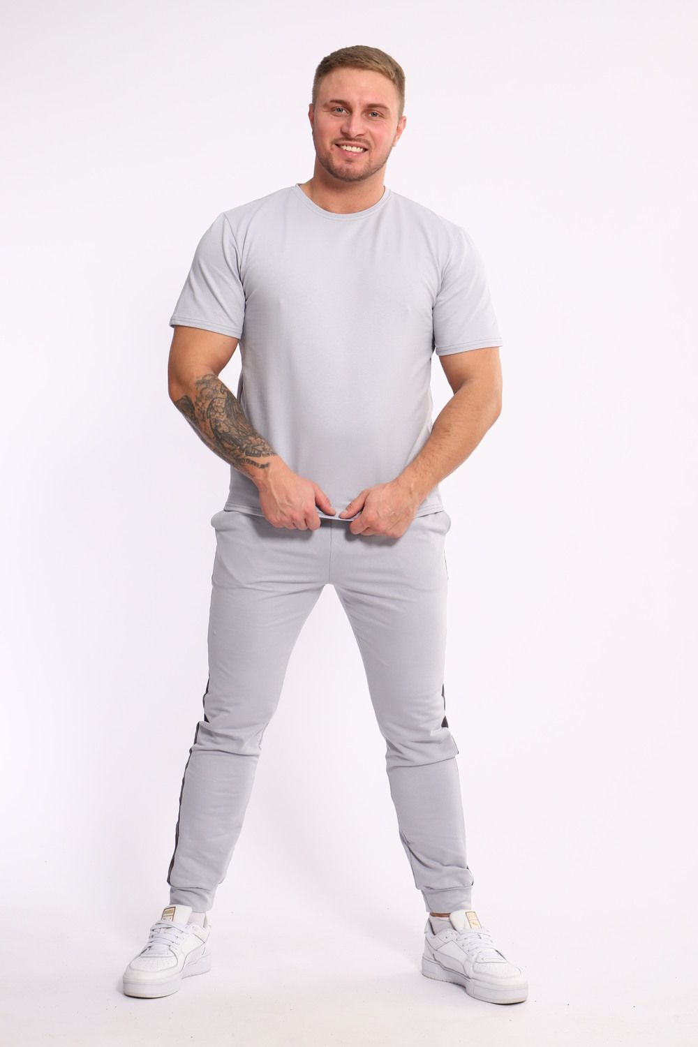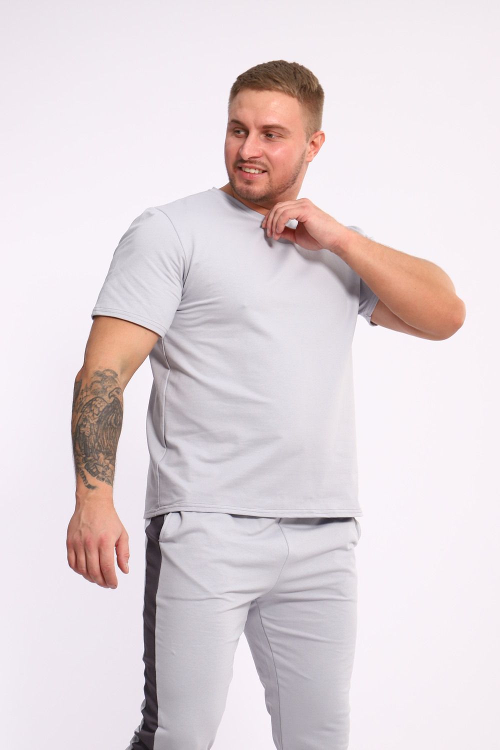 Стильный мужской костюм из мягкого и приятного на ощупь материала . Комплект состоит из футболки свободного кроя и комфортных прямых брюк с эластичным поясом и контрастной вставкой по бокам. Лаконичный дизайн делает этот костюм универсальным выбором для повседневной носки, прогулок или активного отдыха. Идеально сочетается с кроссовками для создания модного спортивного образа.