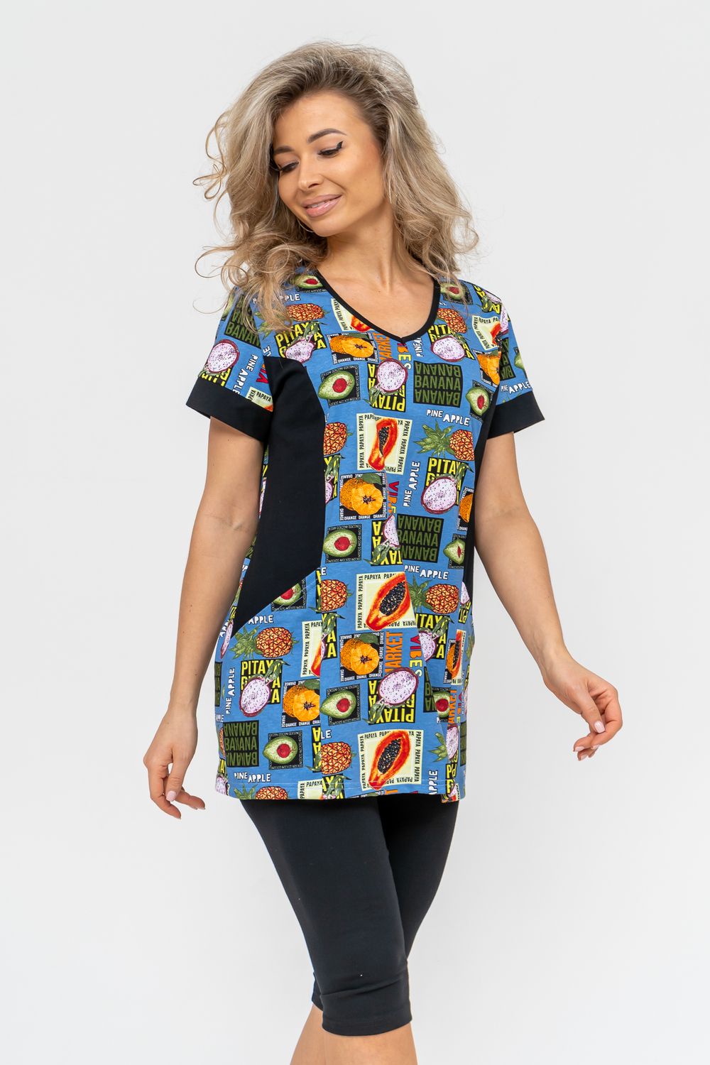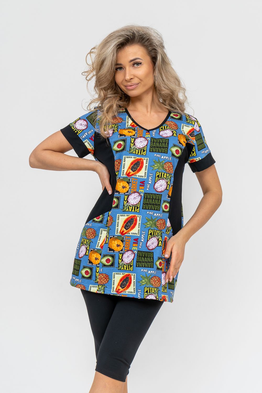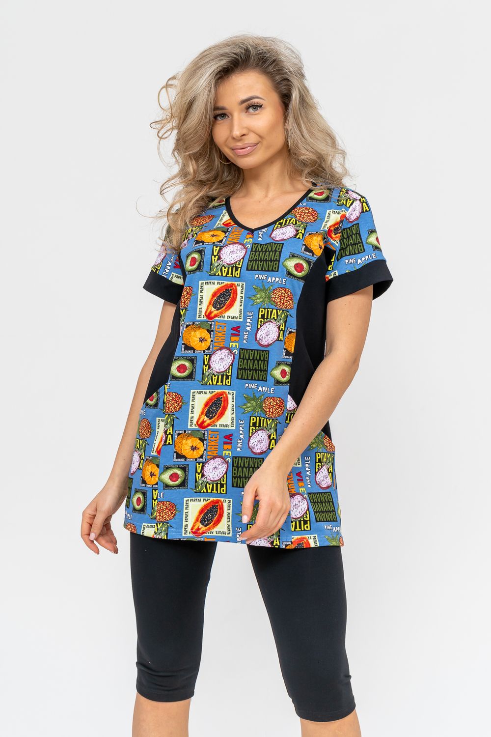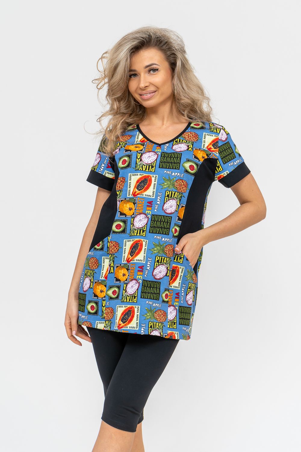 Женский костюм полуприлегающего силуэта состоит из туники и бриджей. 100% дышащий хлопок туники и эластичная вискоза бриджей несут в себе удобство при носке, гигроскопичность и износостойкость. V-образный вырез горловины придаёт изделию женственный вид. Для удобства туника имеет вместительные накладные карманы и втачные рукава с манжетами. Рельефы на полочке изделия создают идеальную посадку и безупречный внешний вид. Бриджи на резинке с высокой посадкой. В костюме такого плана Вы будете чувствовать себя комфортно как дома, так и на любимой даче. Эта двойка идеально подойдет для летнего отдыха на даче, на море или просто для девушек, которые хотят чувствовать себя уютно и комфортно дома. Летний женский костюм подходит для поездок и путешествий, загородного отдыха на природе, а также для получения лечения в больнице или санатории. Повседневное хлопковое изделие с бриджами - отличная идея для подарка любимой жене, маме, сестре или подруге на день рождения, 8 Марта или по любому другому приятному поводу. Рекомендация: для того чтобы продлить яркую жизнь Вашему костюму для дома и отдыха из хлопка, стирку производить при температуре не выше 30 градусов, а во избежание деформации изделия не прибегать к ручному отжиму (не перекручивать), утюжить слегка недосушенное изделие утюгом на паровом режиме. Покупайте наши красивые и удобные домашние костюмы с бриджами и носите с удовольствием! Приятных покупок!