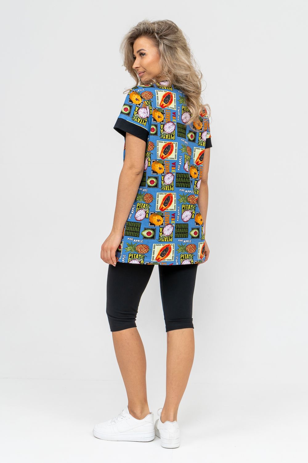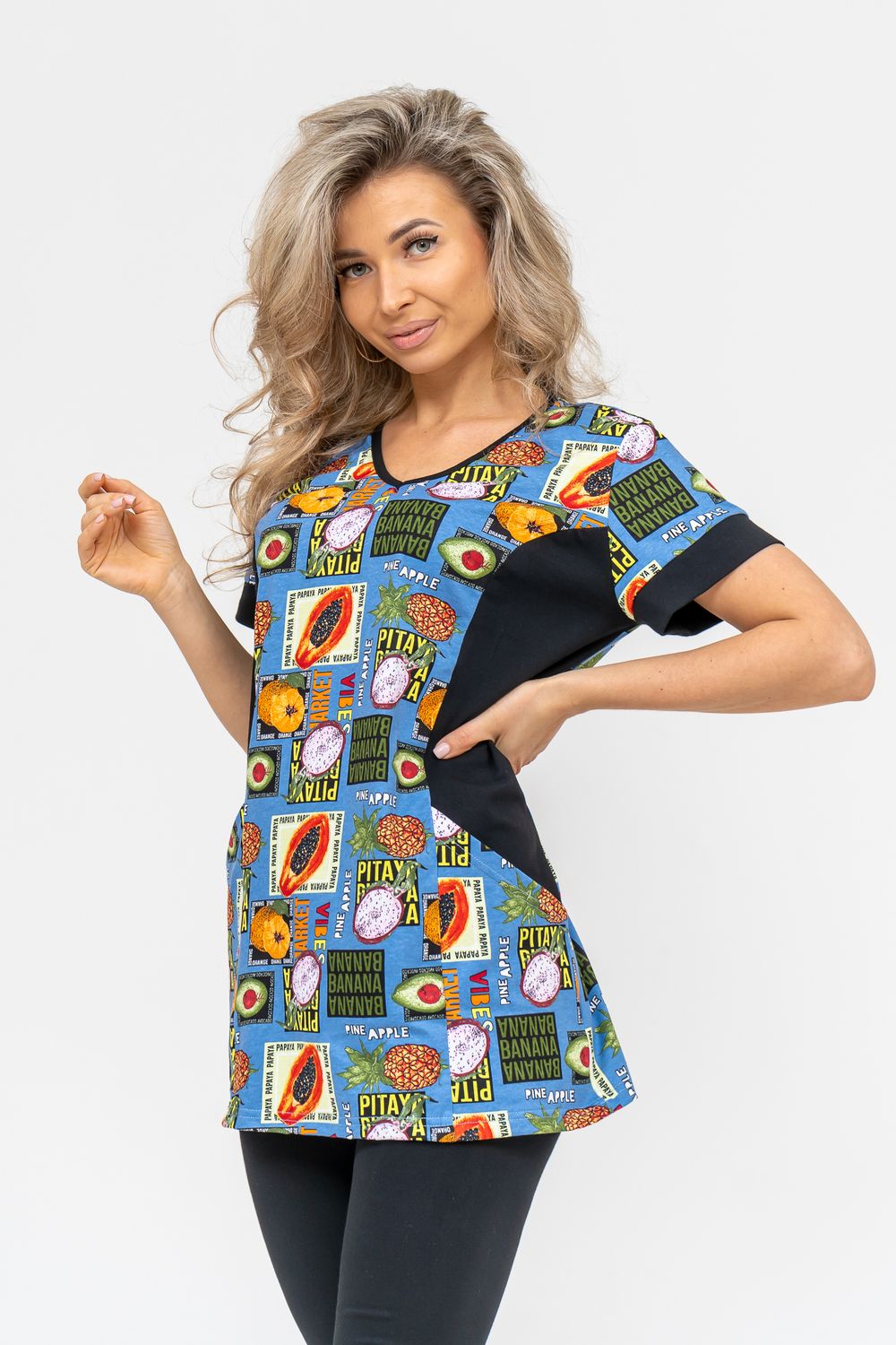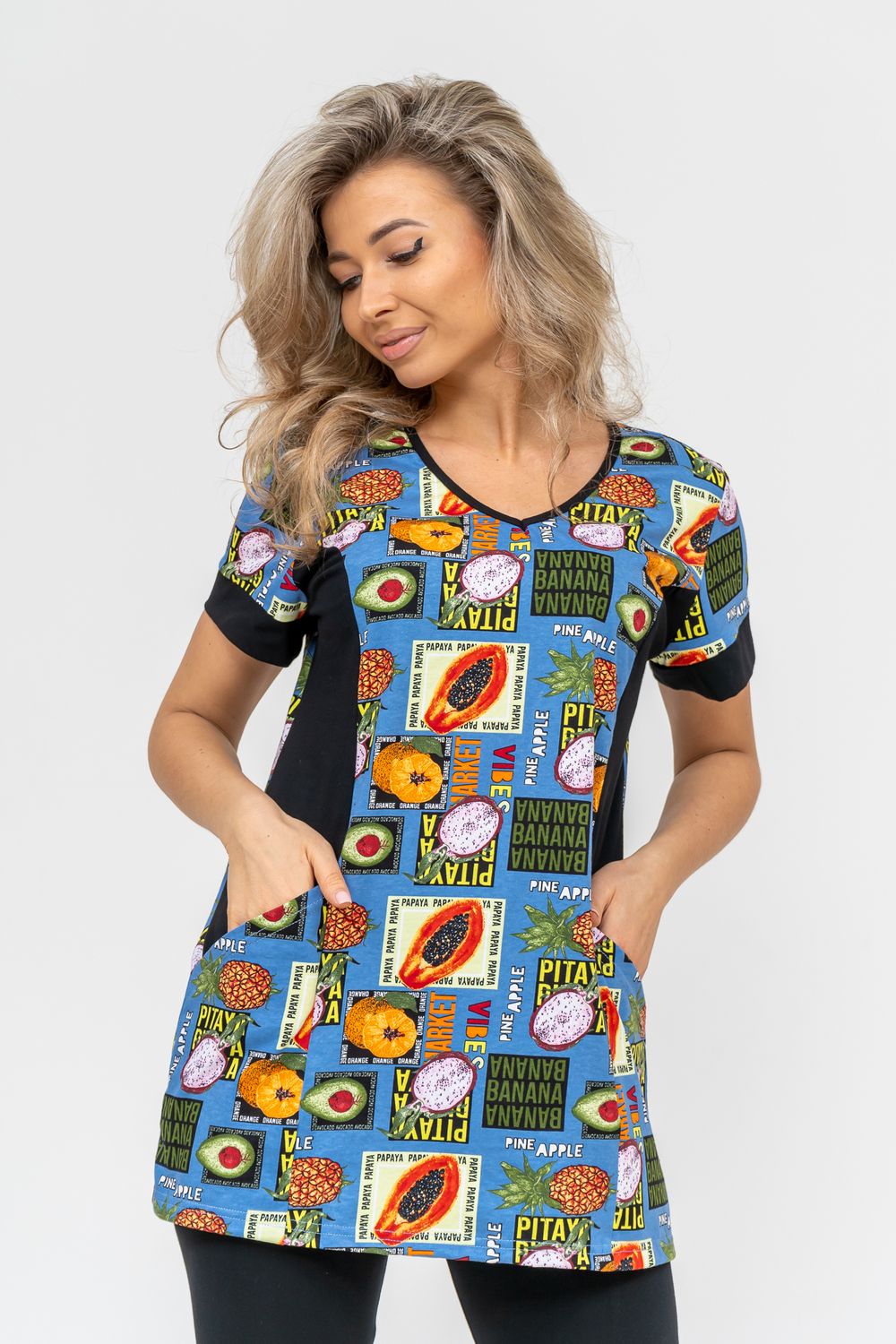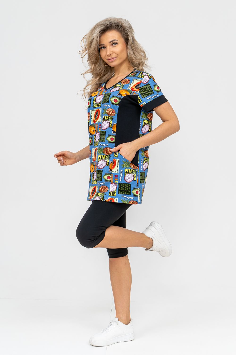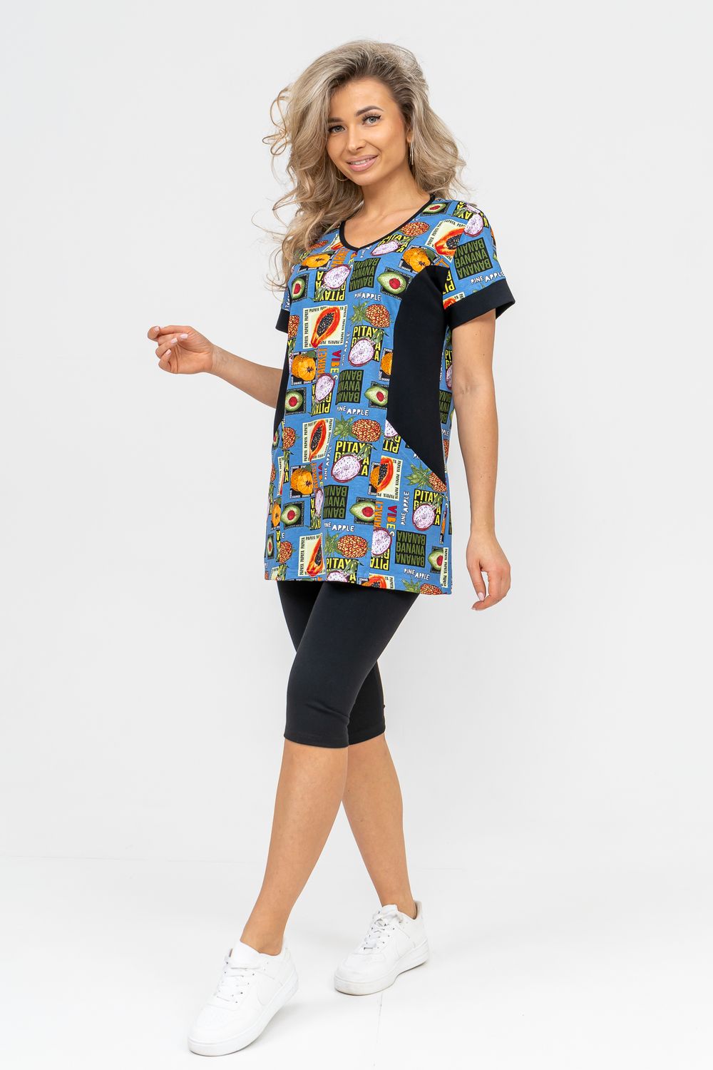 Женский костюм полуприлегающего силуэта состоит из туники и бриджей. 100% дышащий хлопок туники и эластичная вискоза бриджей несут в себе удобство при носке, гигроскопичность и износостойкость. V-образный вырез горловины придаёт изделию женственный вид. Для удобства туника имеет вместительные накладные карманы и втачные рукава с манжетами. Рельефы на полочке изделия создают идеальную посадку и безупречный внешний вид. Бриджи на резинке с высокой посадкой. В костюме такого плана Вы будете чувствовать себя комфортно как дома, так и на любимой даче. Эта двойка идеально подойдет для летнего отдыха на даче, на море или просто для девушек, которые хотят чувствовать себя уютно и комфортно дома. Летний женский костюм подходит для поездок и путешествий, загородного отдыха на природе, а также для получения лечения в больнице или санатории. Повседневное хлопковое изделие с бриджами - отличная идея для подарка любимой жене, маме, сестре или подруге на день рождения, 8 Марта или по любому другому приятному поводу. Рекомендация: для того чтобы продлить яркую жизнь Вашему костюму для дома и отдыха из хлопка, стирку производить при температуре не выше 30 градусов, а во избежание деформации изделия не прибегать к ручному отжиму (не перекручивать), утюжить слегка недосушенное изделие утюгом на паровом режиме. Покупайте наши красивые и удобные домашние костюмы с бриджами и носите с удовольствием! Приятных покупок!