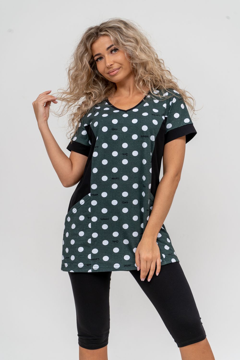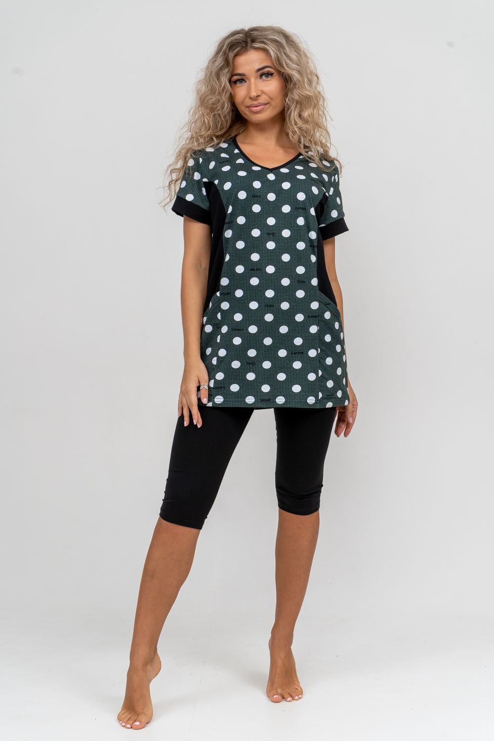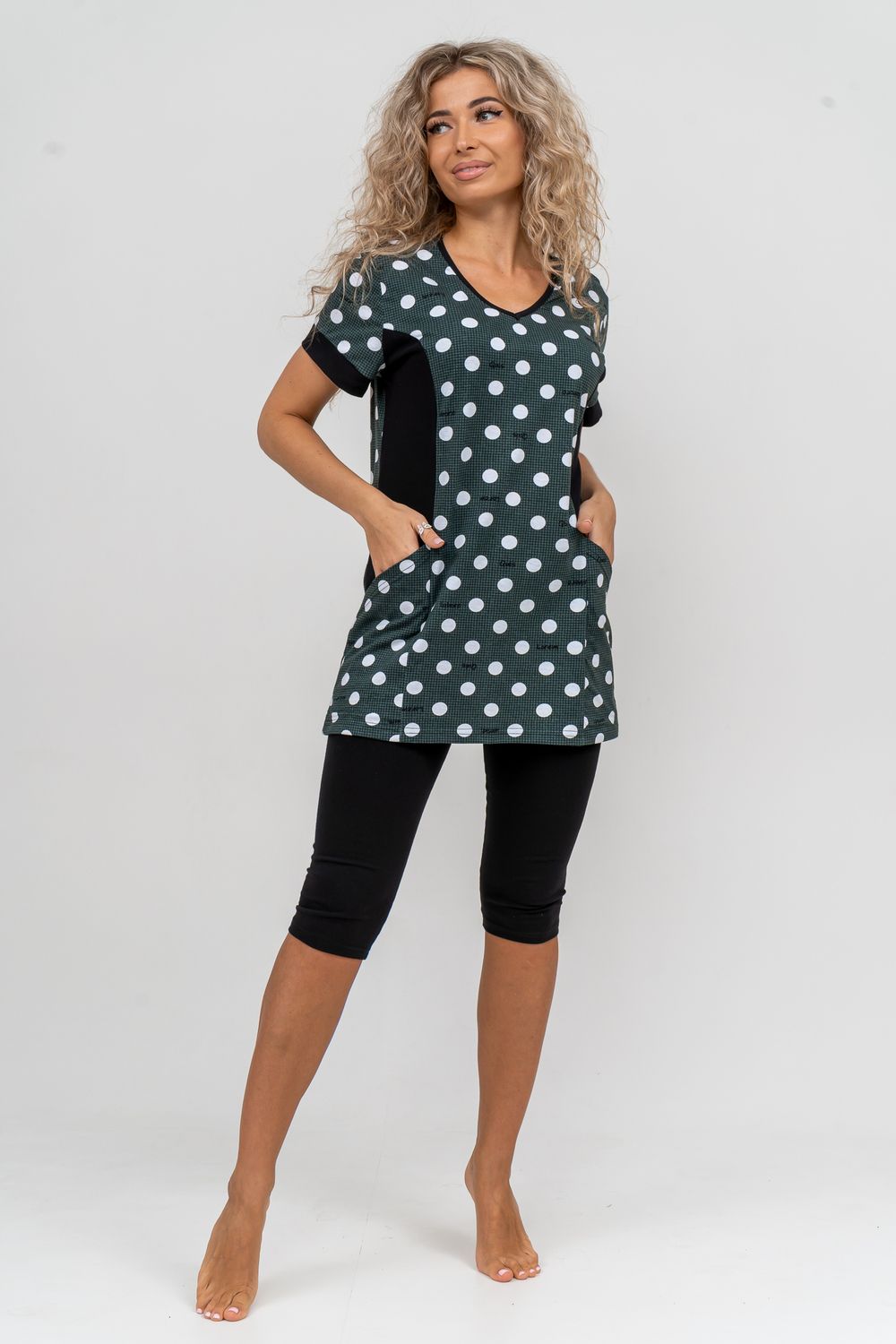 Женский костюм полуприлегающего силуэта состоит из туники и бриджей. 100% дышащий хлопок туники и эластичная вискоза бриджей несут в себе удобство при носке, гигроскопичность и износостойкость. V-образный вырез горловины придаёт изделию женственный вид. Для удобства туника имеет вместительные накладные карманы и втачные рукава с манжетами. Рельефы на полочке изделия создают идеальную посадку и безупречный внешний вид. Бриджи на резинке с высокой посадкой. В костюме такого плана Вы будете чувствовать себя комфортно как дома, так и на любимой даче. Эта двойка идеально подойдет для летнего отдыха на даче, на море или просто для девушек, которые хотят чувствовать себя уютно и комфортно дома. Летний женский костюм подходит для поездок и путешествий, загородного отдыха на природе, а также для получения лечения в больнице или санатории. Повседневное хлопковое изделие с бриджами - отличная идея для подарка любимой жене, маме, сестре или подруге на день рождения, 8 Марта или по любому другому приятному поводу. Рекомендация: для того чтобы продлить яркую жизнь Вашему костюму для дома и отдыха из хлопка, стирку производить при температуре не выше 30 градусов, а во избежание деформации изделия не прибегать к ручному отжиму (не перекручивать), утюжить слегка недосушенное изделие утюгом на паровом режиме. Покупайте наши красивые и удобные домашние костюмы с бриджами и носите с удовольствием! Приятных покупок!