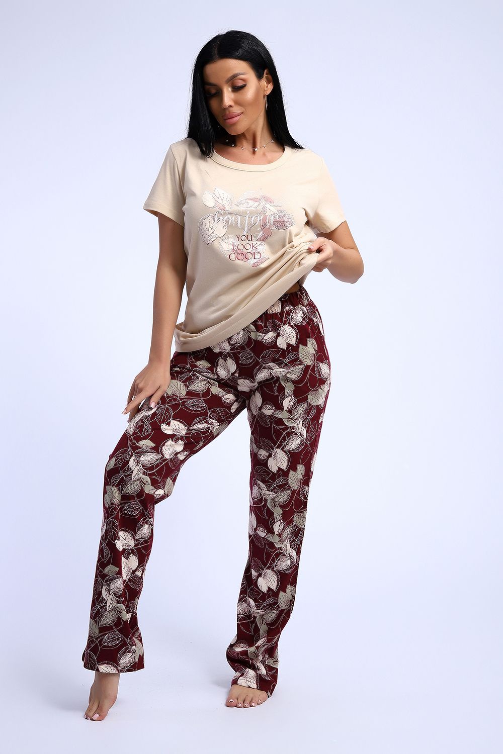 Комплект трикотажный футболка и брюки из натурального хлопка высокого качества. Размерный ряд с 48 до 66 размера. Футболка нежно-песочного цвета, брюки бордово-винного цвета с растительным рисунком, есть боковые карманы.