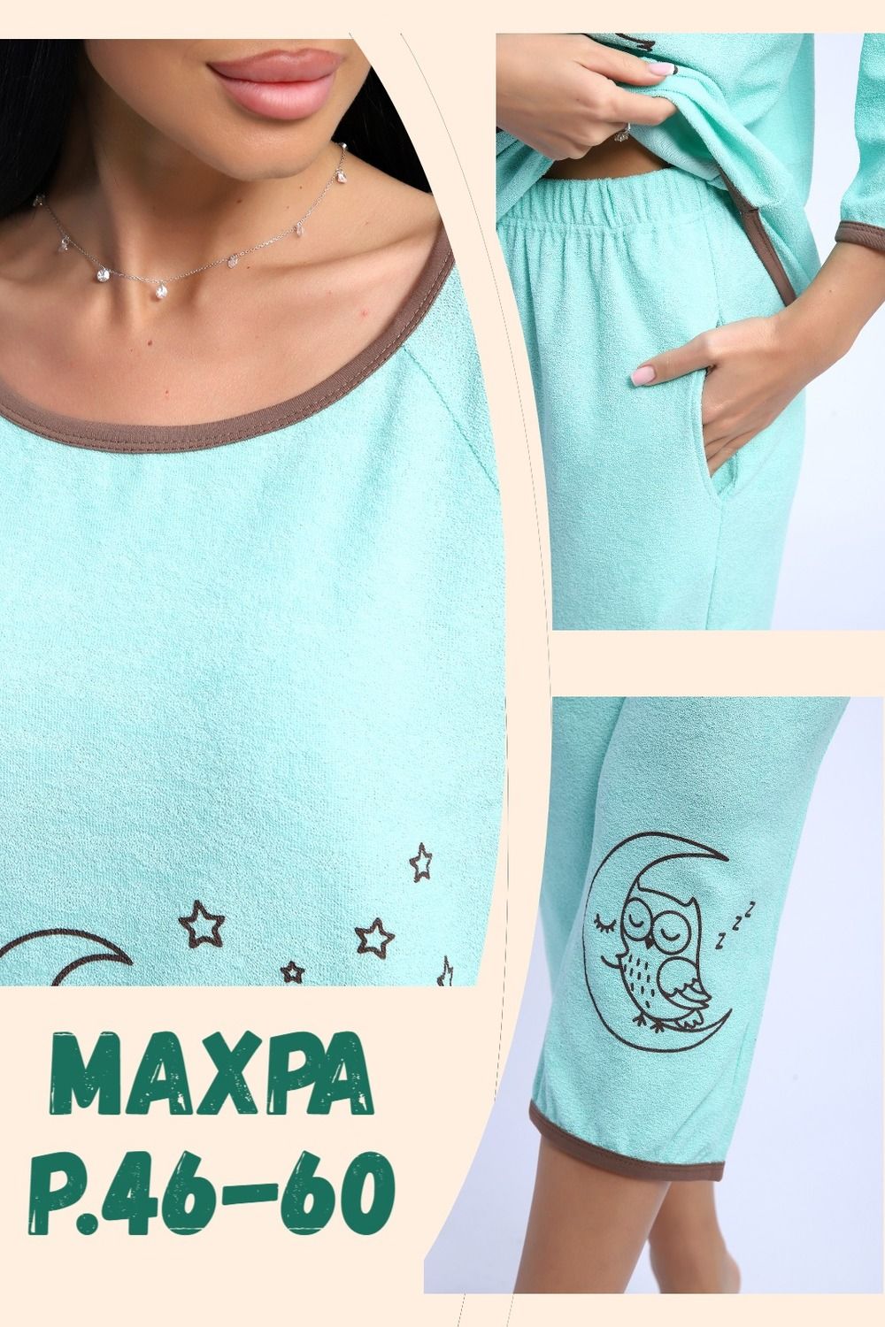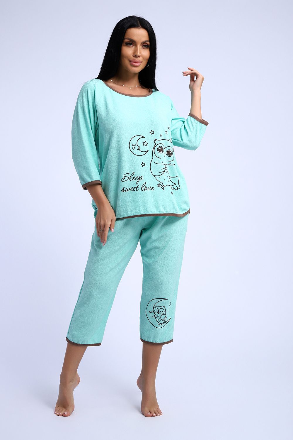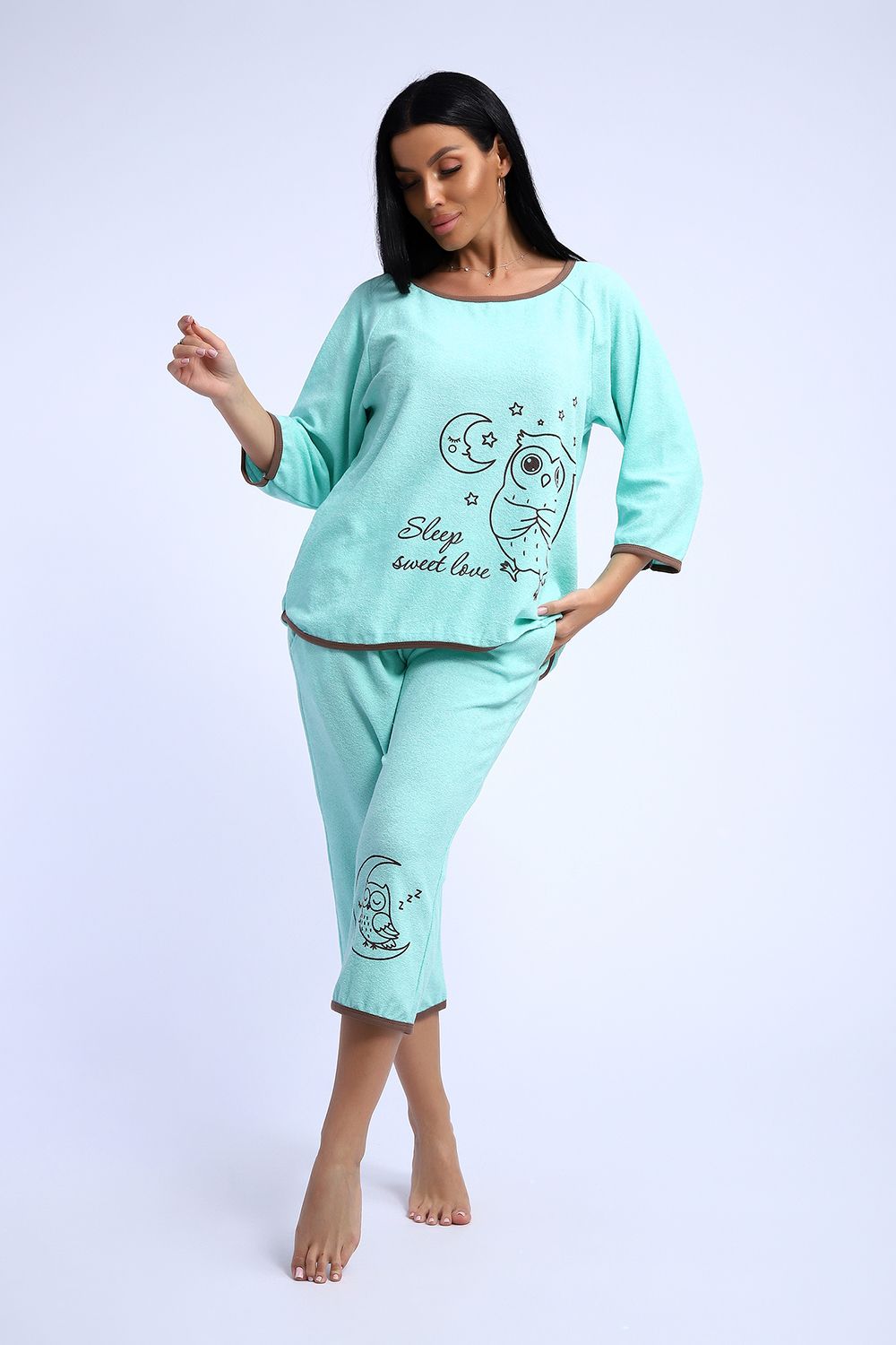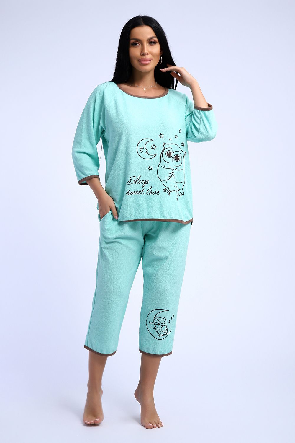 Симпатичный махровый костюм из футболки и бриджей. Футболка с рукавом-реглан длиной 3/4, на полочке изображение совы на фоне луны и звезд. Бриджи свободные, на резинке, с боковыми кармашками, на одной половинке - изображение маленькой совы.
