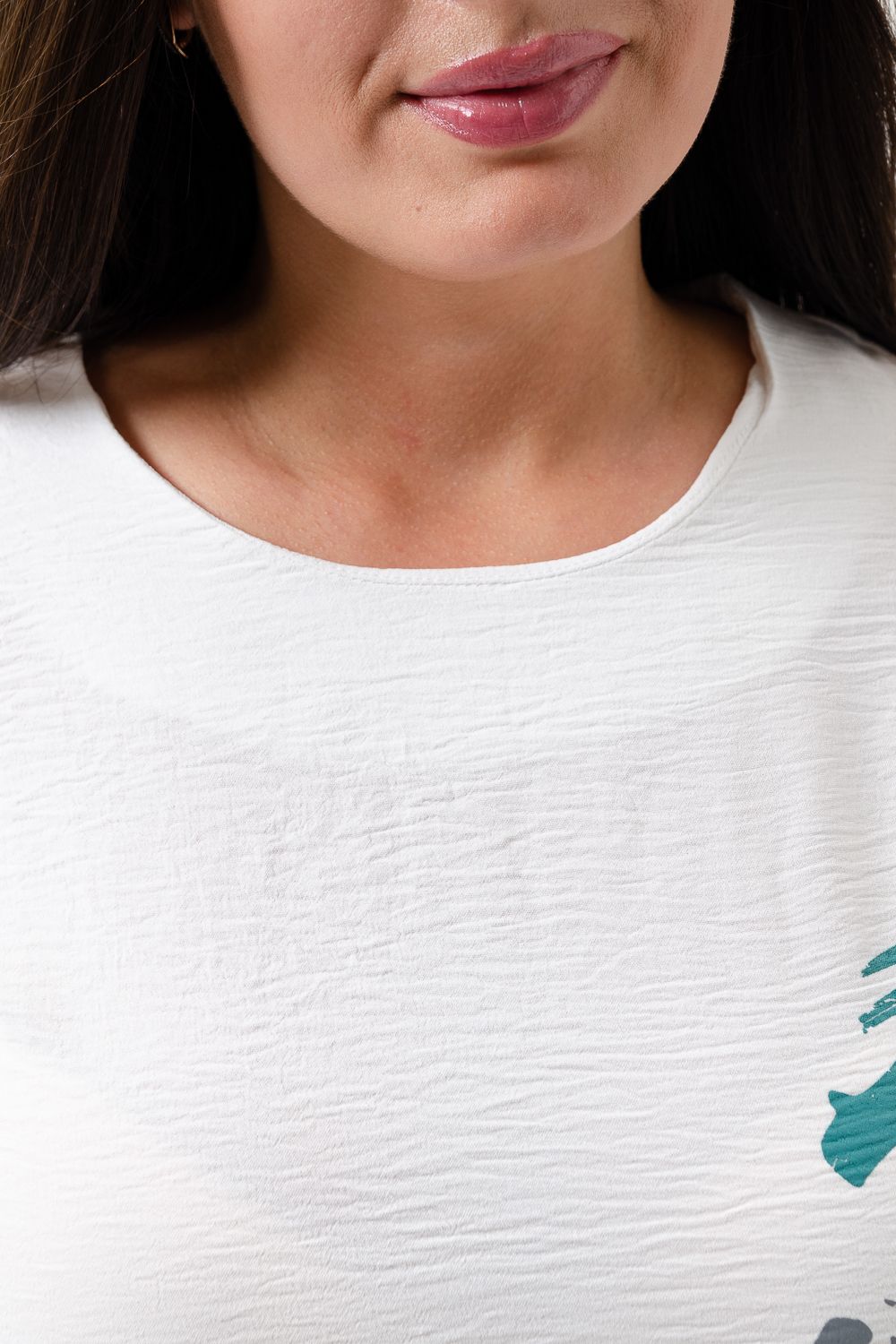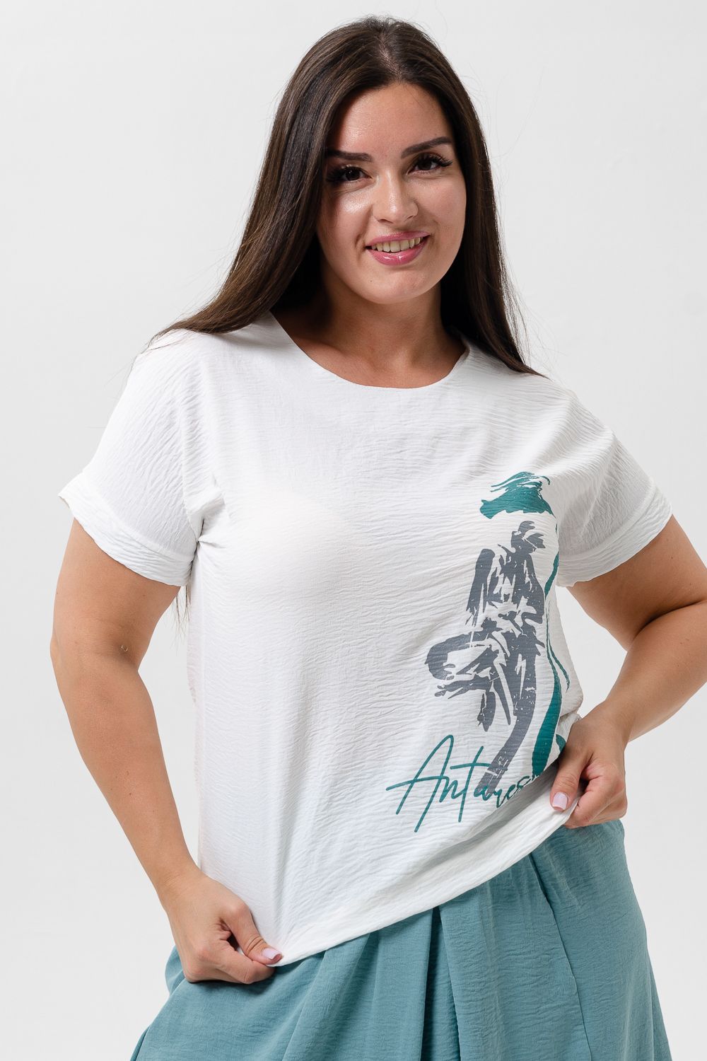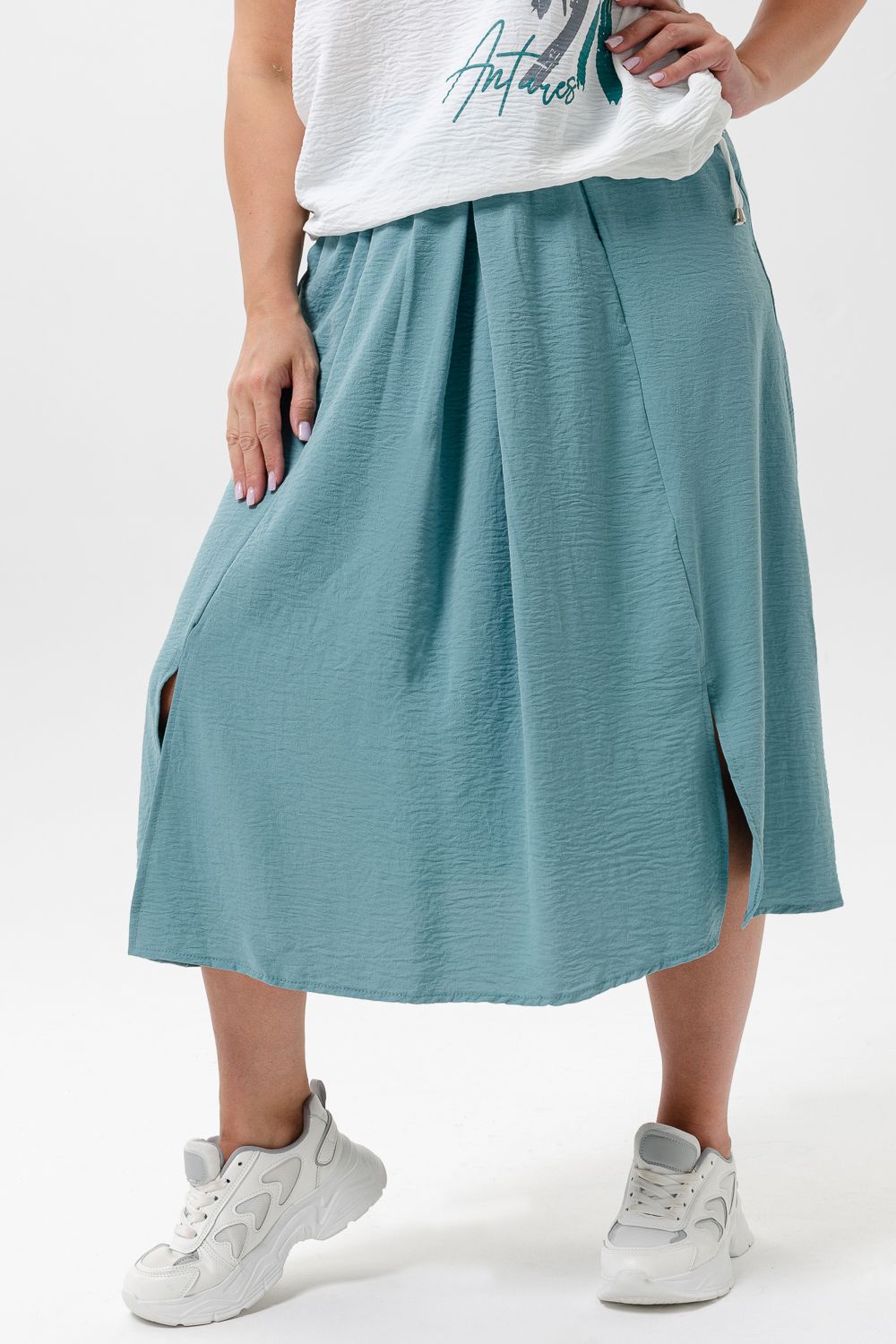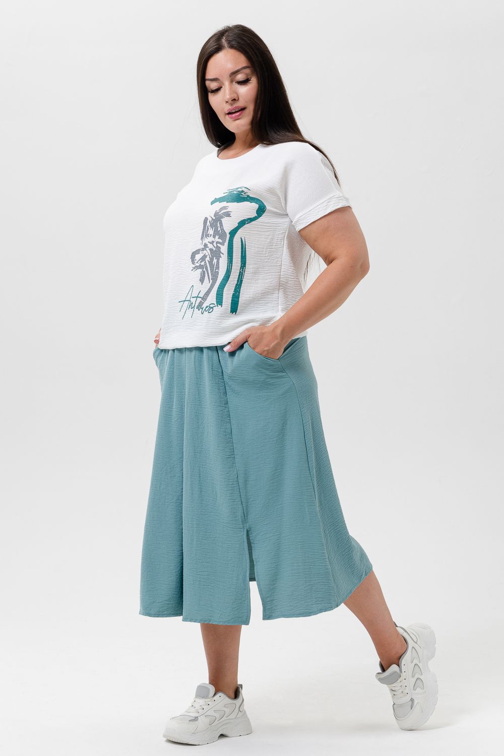 Женская двойка прямого силуэта. Верх комплекта в белом цвете с цветным принтом, короткий цельнокроеный рукав, низ футболки имеет свойство затягиваться, поэтому ее можно носить спущенную на юбку, а можно затянуть и оставить над ней, что подчеркнет вашу талию. Низ - свободная юбка двух цветов, с двумя разрезами снизу. Костюм повседневный и удобный, из легкой ткани сингапур, что хорошо для жаркого лета.