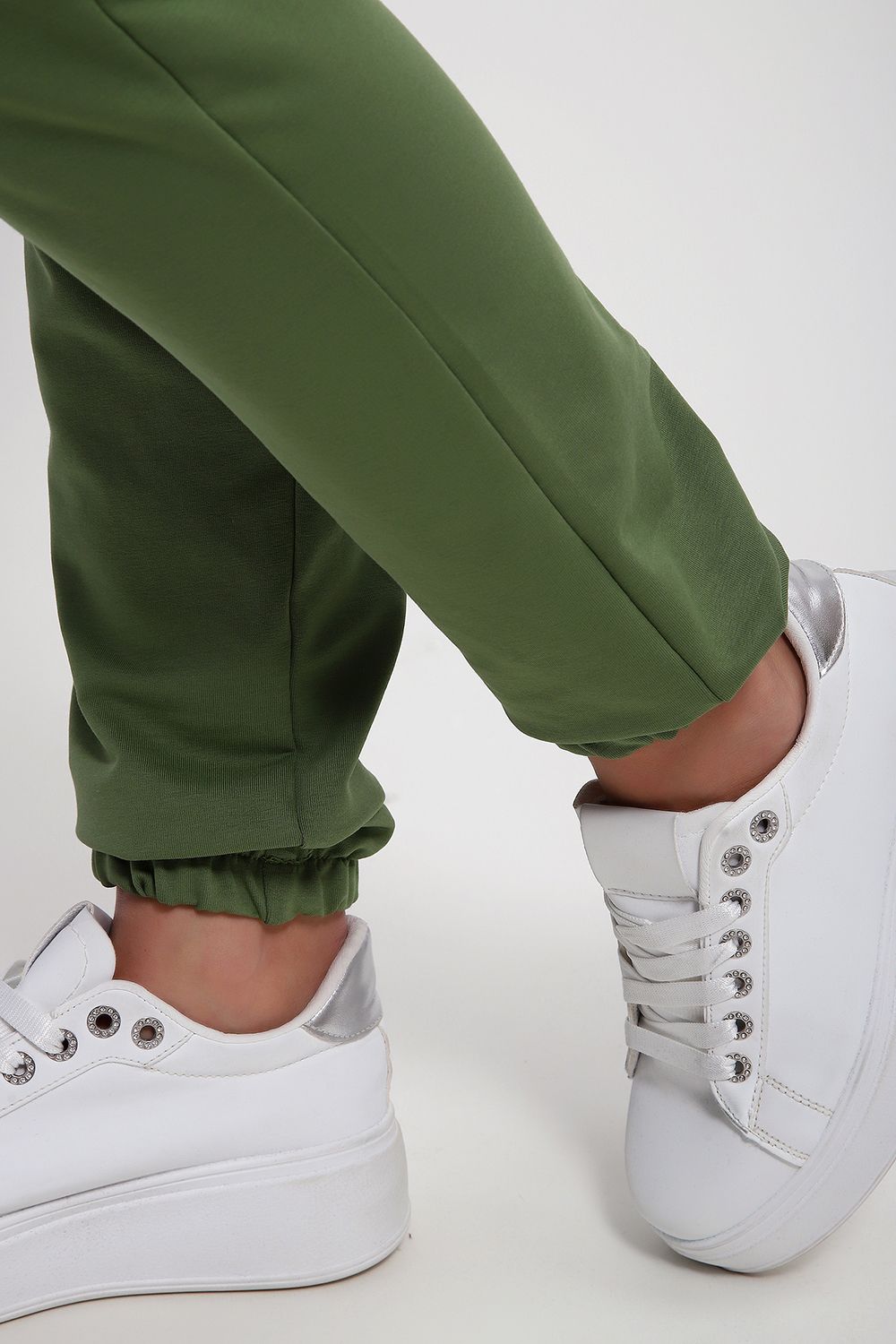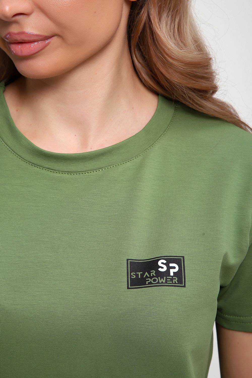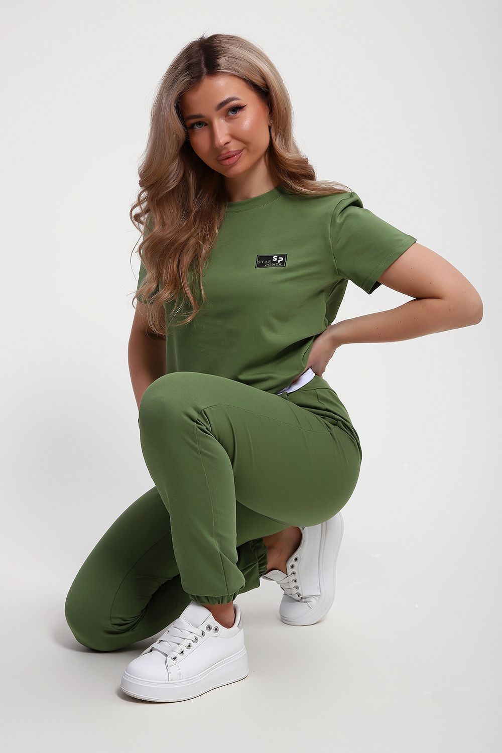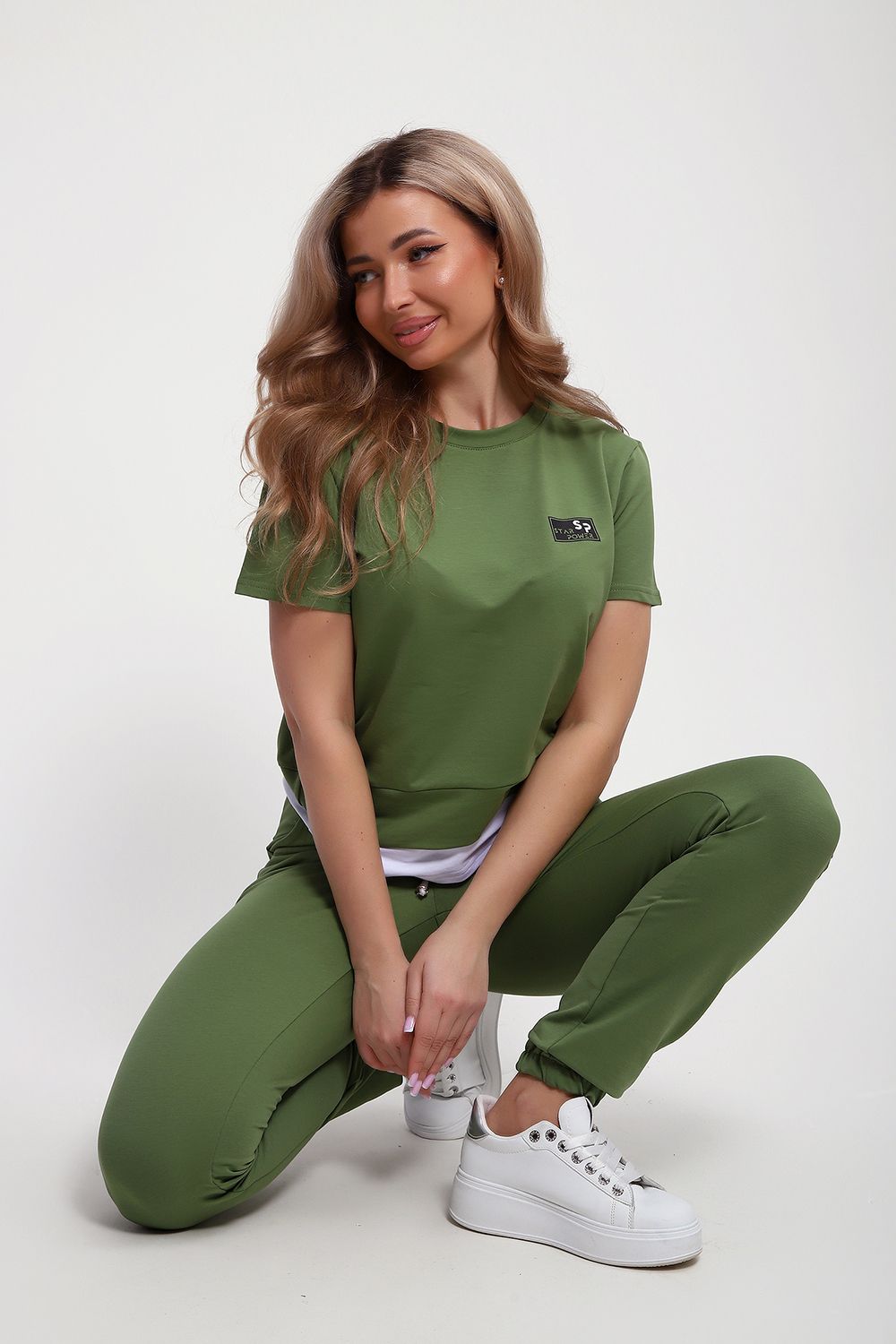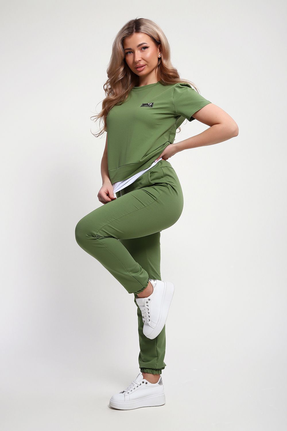 Костюм женский трикотажный - футболка и брюки. Футболка укороченная с отделкой по низу контрастного цвета. Брюки с завязками и втачными боковыми карманами. На футболке и брюки небольшие отделочные печати.