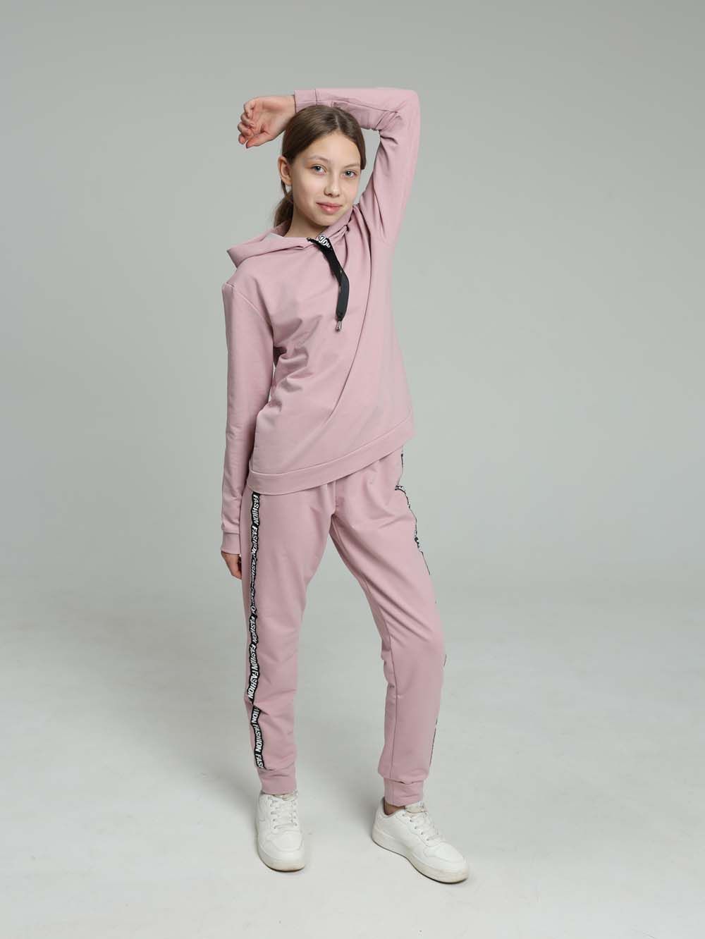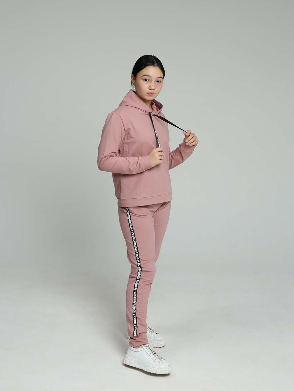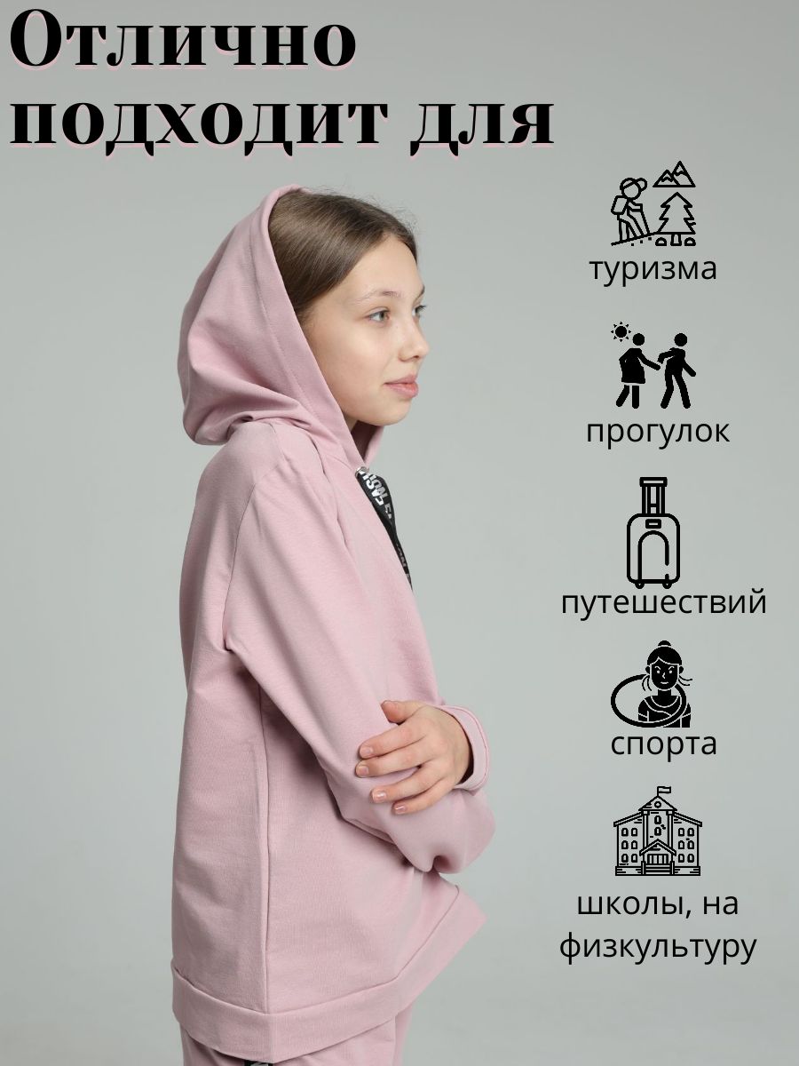 Стильный костюм с брюками сшит из трикотажного полотна высокого качества - футера двухнитки. Лицевая сторона футера гладкая, изнаночная - петлеобразная. Это полотно выполнено из хлопковой пряжи пенье, прошедшей обработку. Такой трикотаж устойчив к истиранию, появлению затяжек и катышков, меньше мнется и хорошо держит форму. Манжеты из резинки-кашкорсе. Лампасы с надписями визуально добавляют стройности. За счёт уникальных авторских лекал современный костюм выигрышно смотрится на стандартной фигуре любого размера. Практичный костюм в спортивном стиле будет удобным и комфортным во многих ситуациях. Универсальный костюм идеален для встреч с друзьями и прогулок, активного отдыха и любительского спорта, для поездок и путешествий, для дома, улицы, дачи, для похода в магазин и поездки на пикник. Этот модный качественный костюм с удобной посадкой отлично подойдет для невысоких девушек и женщин ростом до 165 см.