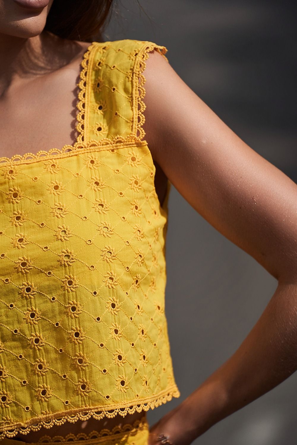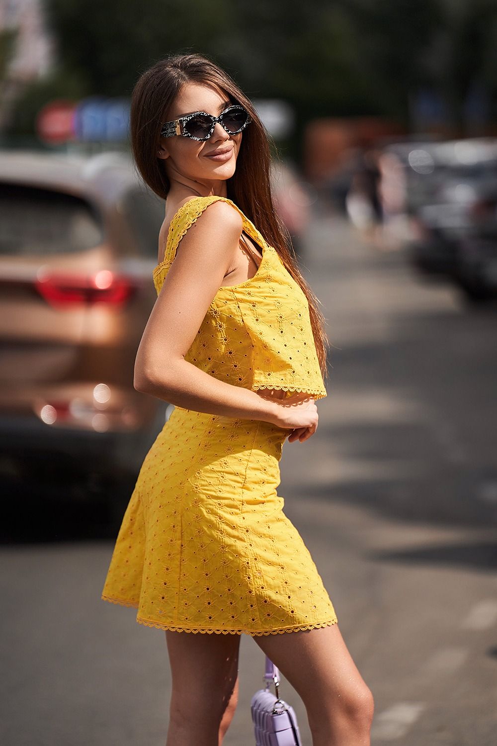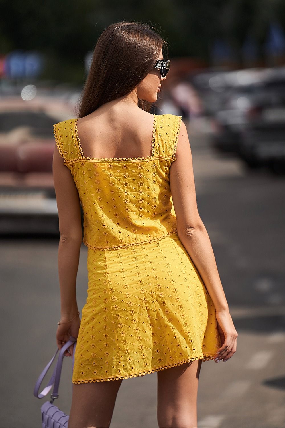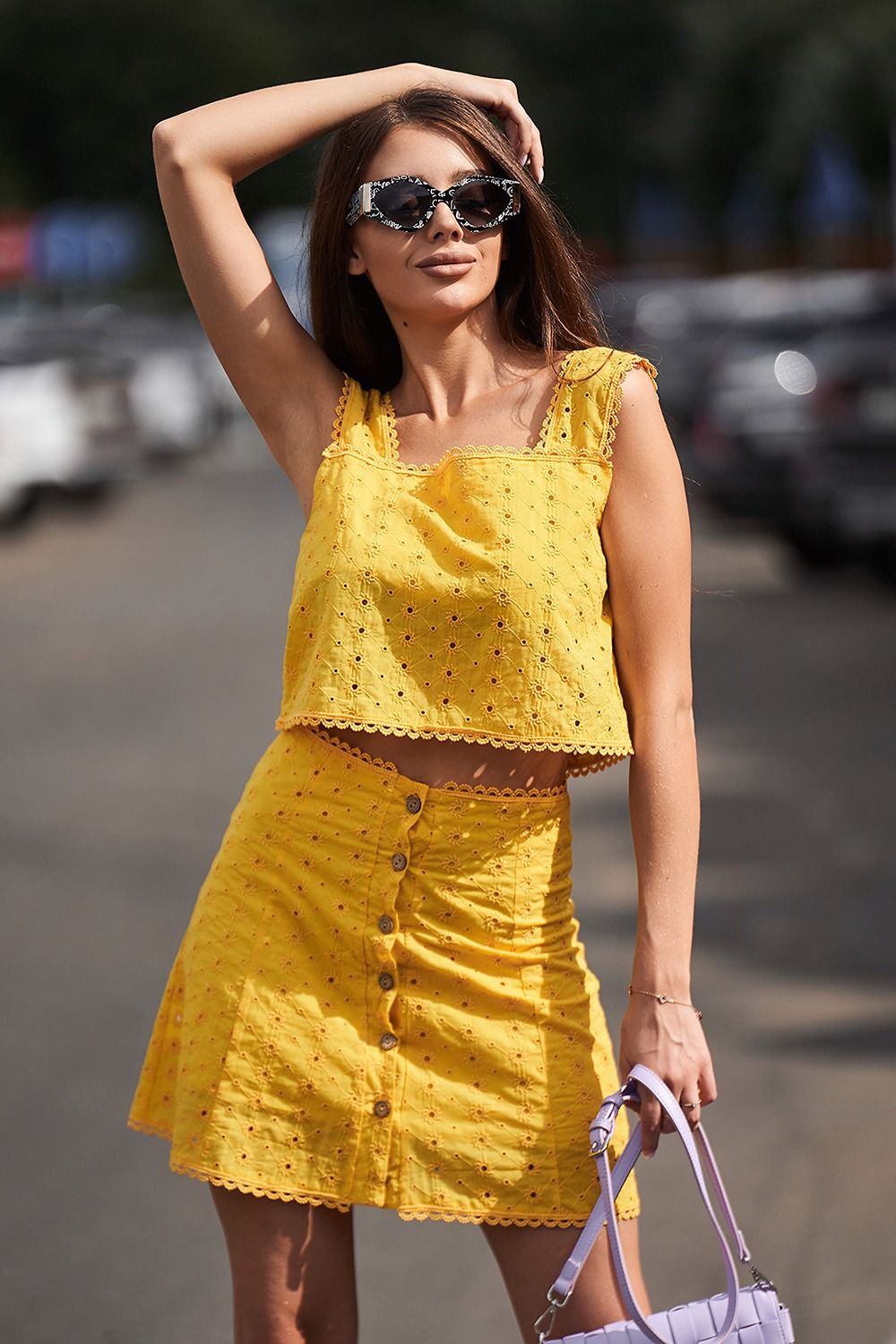 Летни и яркий костюм из шитья. Топ на широкий бретелях, юбка на пуговицах.