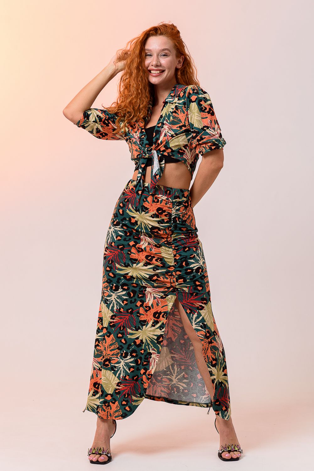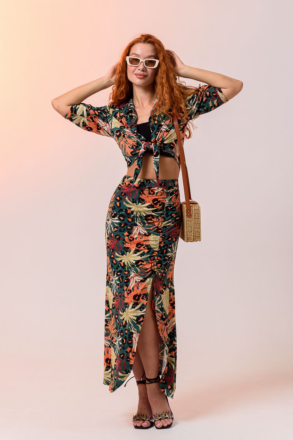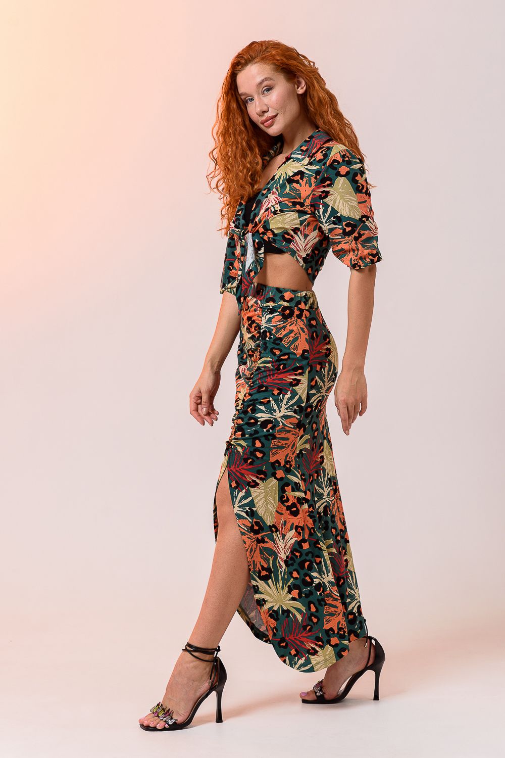 Комплект женский из 3-х изделий состоит из рубашки, топа, юбки. Выполнен из качественно эластичного мягкого материала хорошей растяжимости. Рубашка с отложным дублированным воротником, который держит форму, рукавами средней длины, дополнена укороченным топом на широких бретелях. Юбка длиной макси с высокой посадкой на талии и широким поясом, длинным разрезом и мягкой драпировкой. Длину разреза и драпировку вы можете регулировать с помощью тонкой эластичной резинки, а оставшейся конец петли завязать.