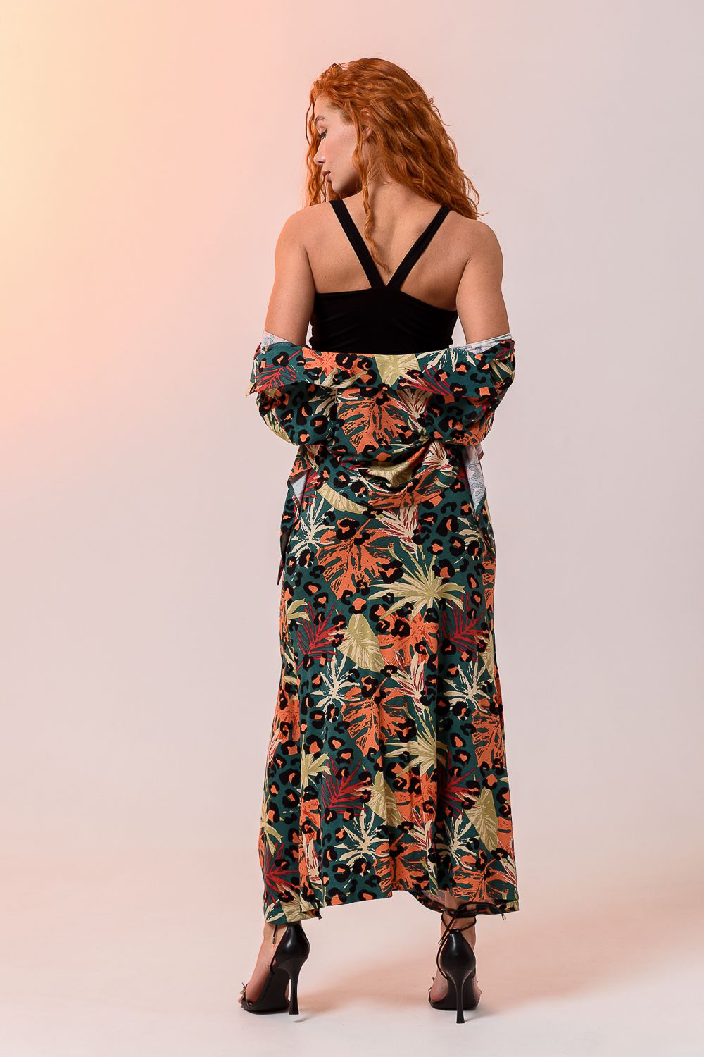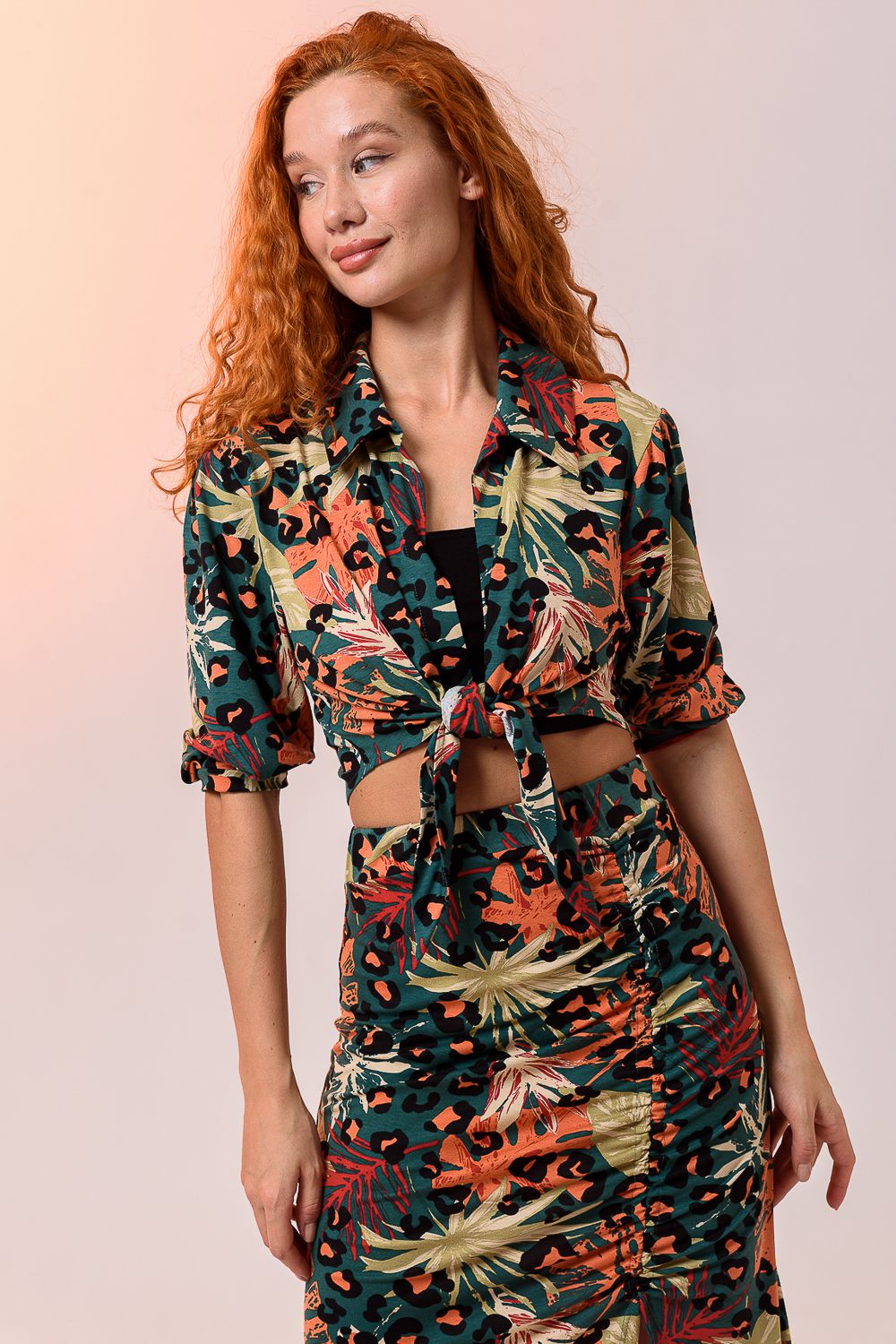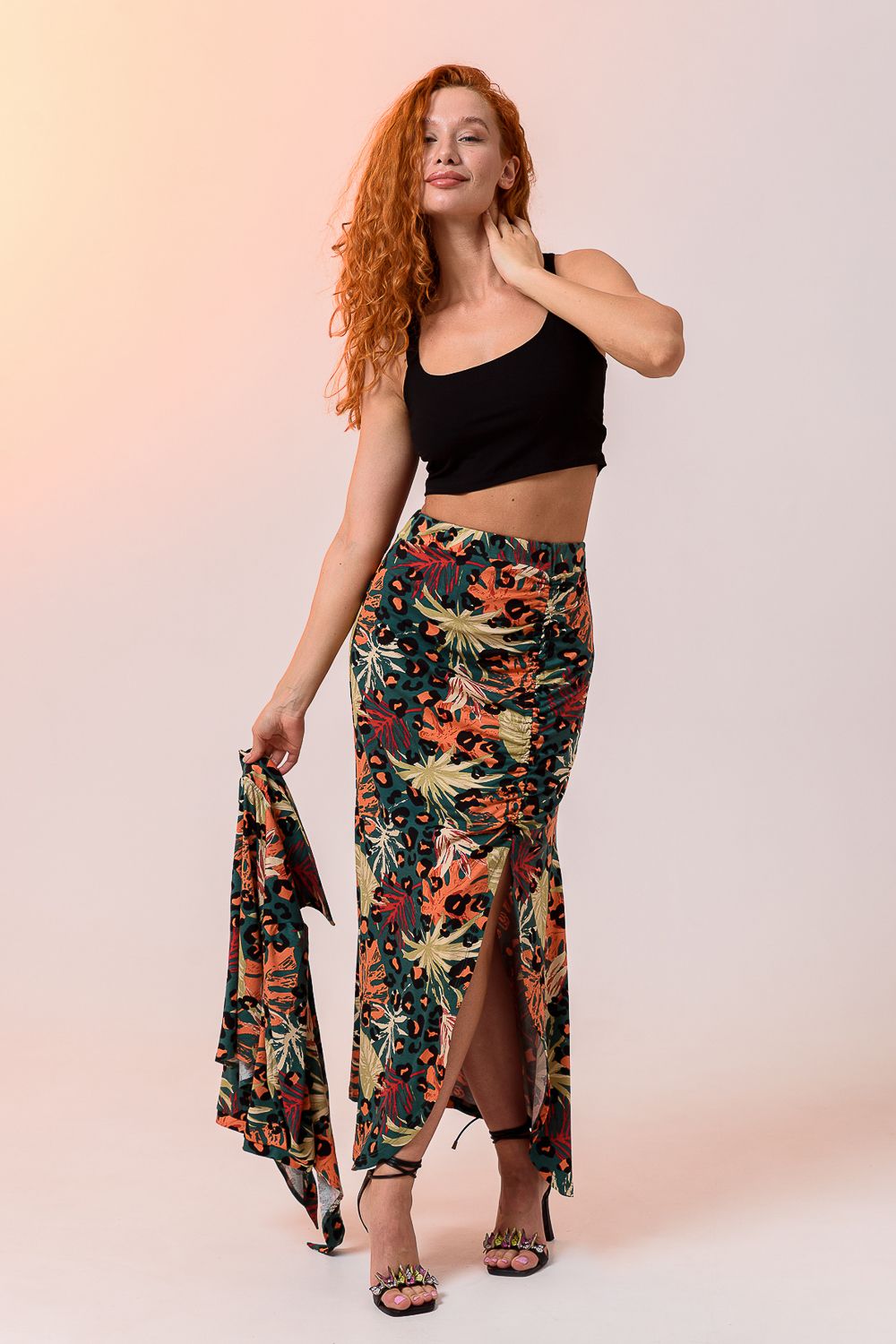 Комплект женский из 3-х изделий состоит из рубашки, топа, юбки. Выполнен из качественно эластичного мягкого материала хорошей растяжимости. Рубашка с отложным дублированным воротником, который держит форму, рукавами средней длины, дополнена укороченным топом на широких бретелях. Юбка длиной макси с высокой посадкой на талии и широким поясом, длинным разрезом и мягкой драпировкой. Длину разреза и драпировку вы можете регулировать с помощью тонкой эластичной резинки, а оставшейся конец петли завязать.