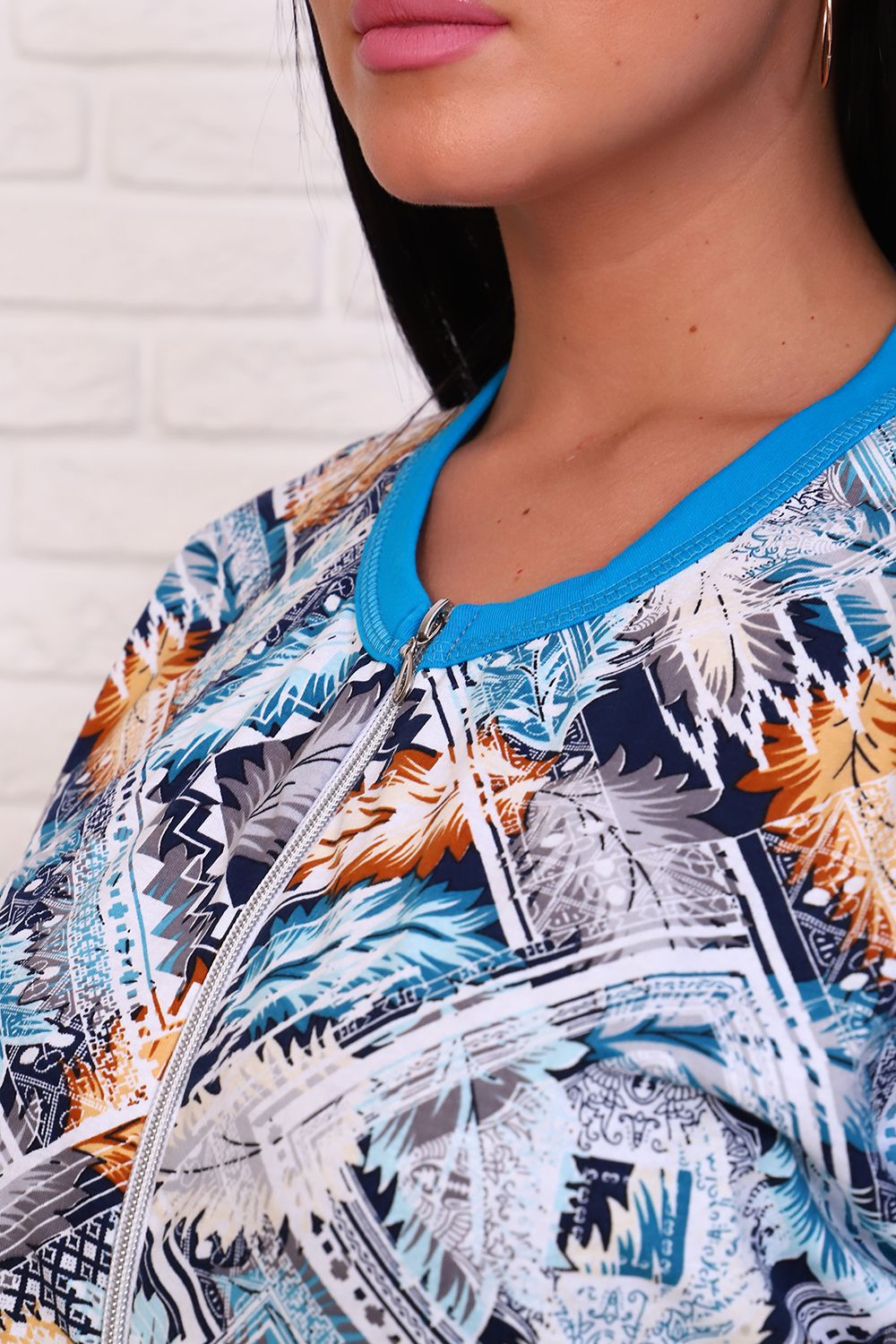 Костюм женский состоит из туники из кулирки и вискозных бриджей. Туника удлиненная на молнии, по линии талии проходит кулиска со шнуром, горловина с контрастной окантовкой. Рукав спущенный с контрастной окантовкой. Ткань с оригинальным принтом. Костюм подойдет для дома, отдыха и прогулок.