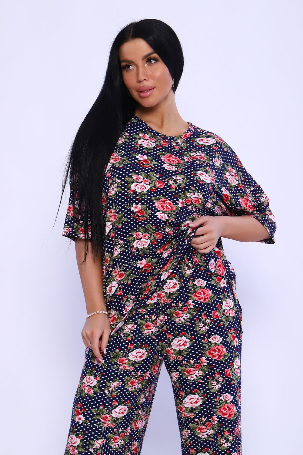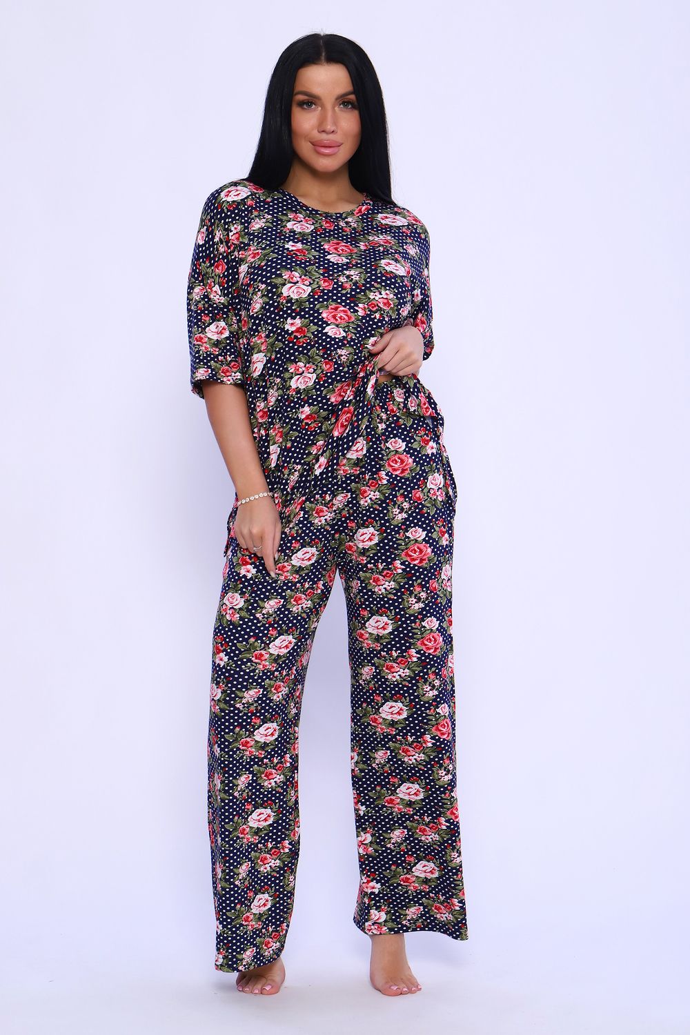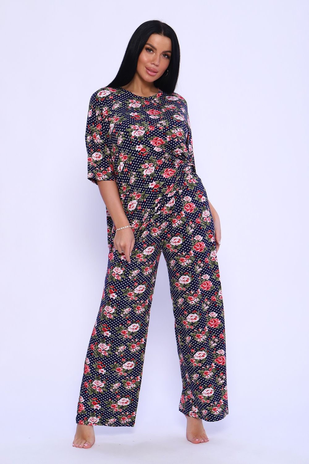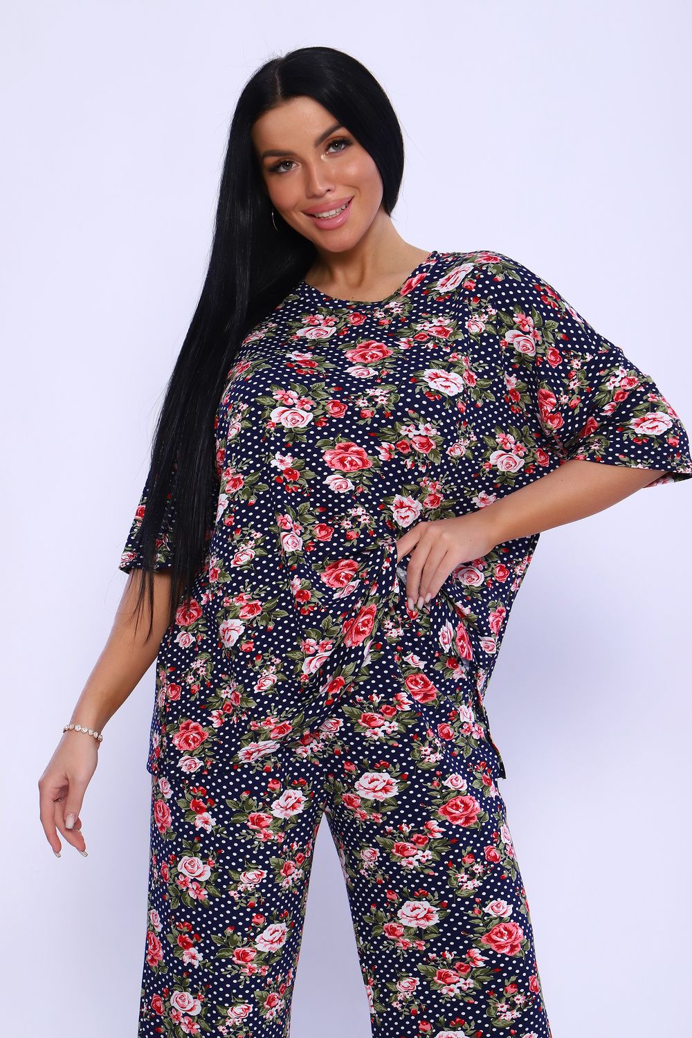 Женский костюм из вискозы с лайкрой кофта + брюки, кофта свободная с короткими рукавами и разрезом по бокам. Брюки "палаццо" с высокой посадкой, Костюм прекрасно подойдёт для дома, обращаем ваше внимание что модель свободного покроя и указанные размеры подходят и для девушек на размер больше, например размер 48 подходит девушка 48 и 50.
