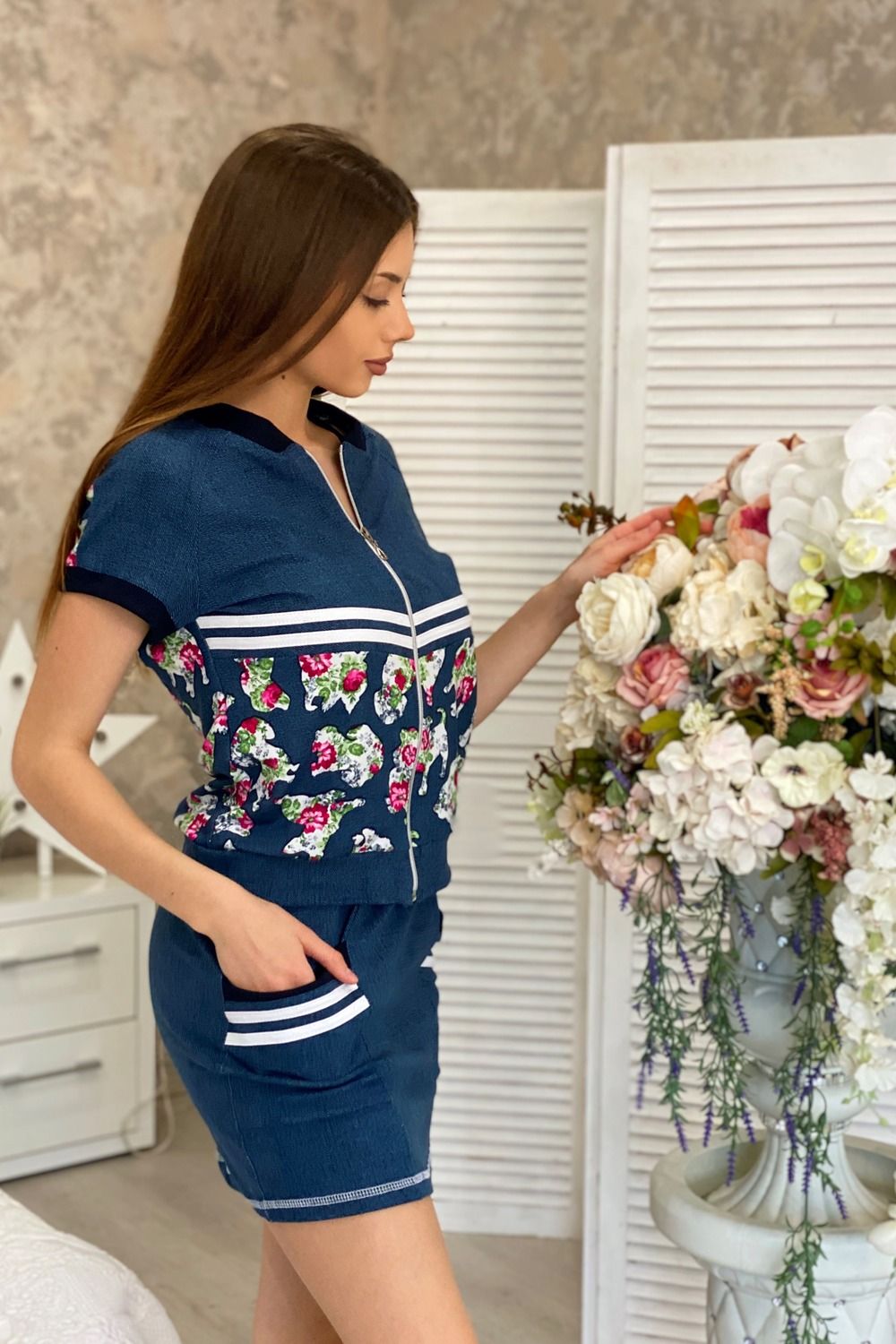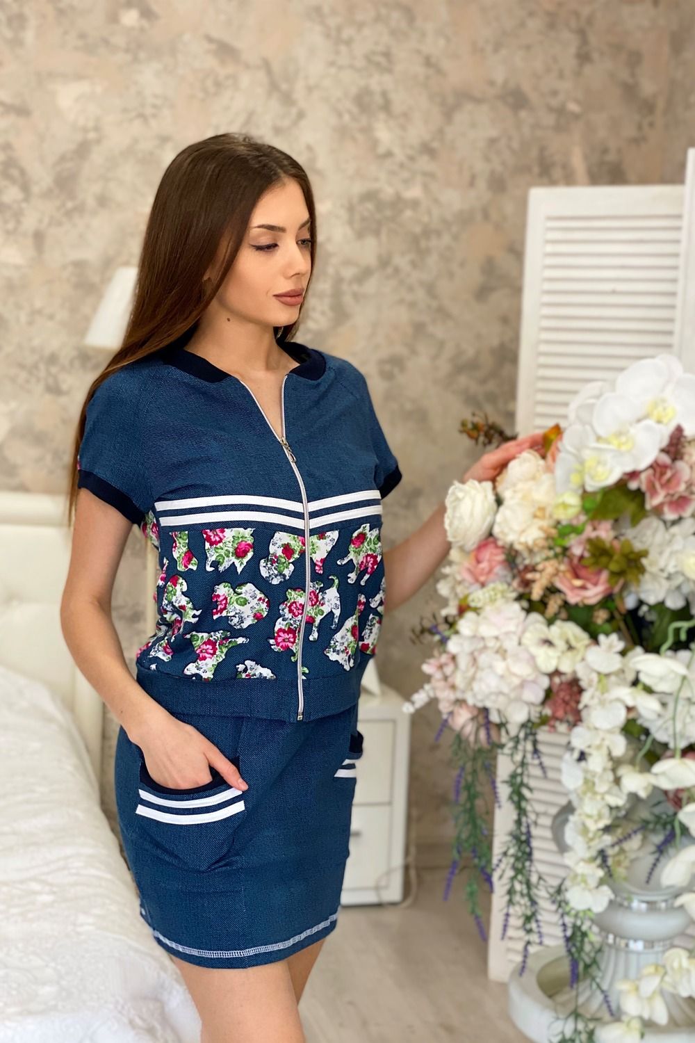 Комплект в спортивном стиле состоит из бомбера и юбки. Юбка полуприлегающего силуэта, длиной выше колена, с карманами на уровне середины бедра, на эластичном поясе. Верх кармана обработан эластичной обтачкой. Куртка-бомбер полуприлегающего силуэта, длиной немного ниже талии, с округлой горловиной. На полочке расположены симметричные кокетки. Рукав реглан, короткий, на эластичном манжете. Горловина обработана эластичной обтачкой.