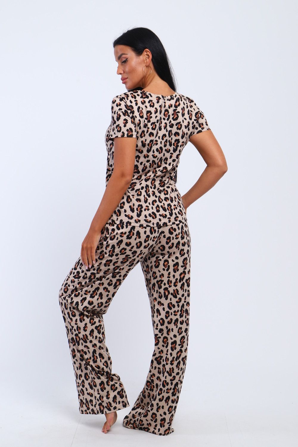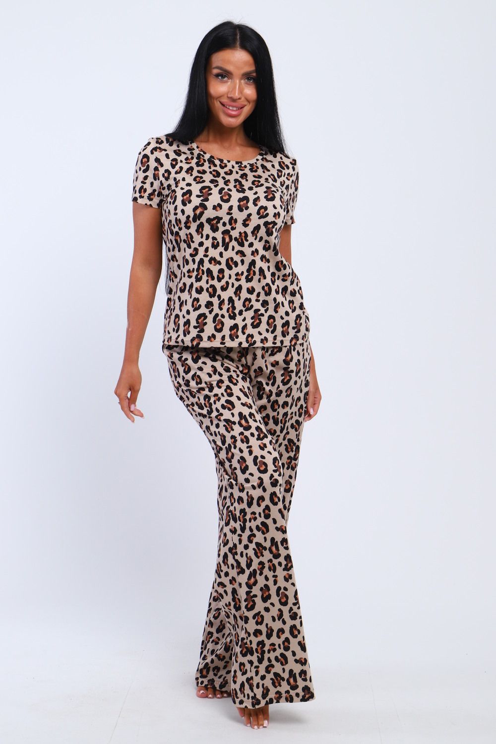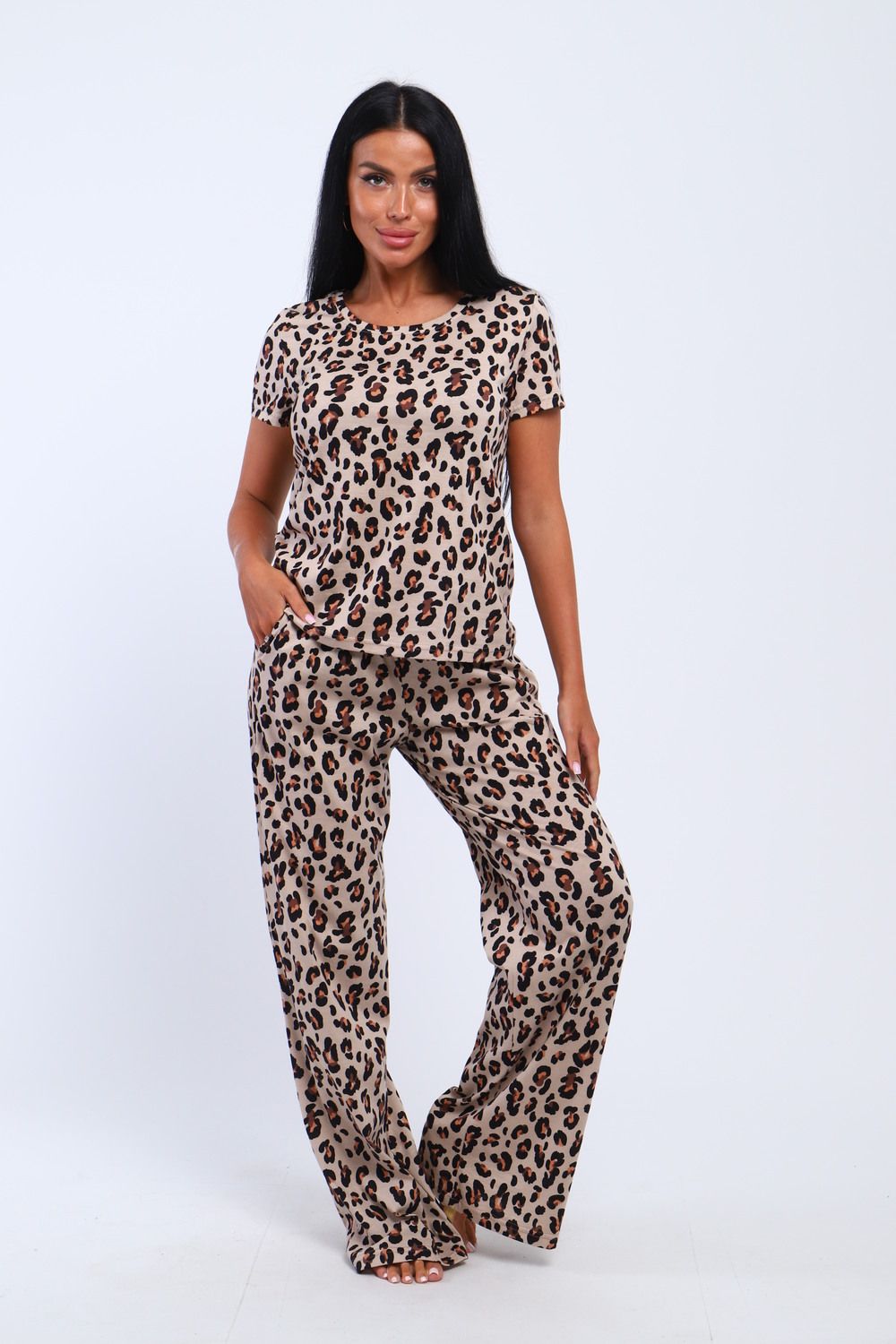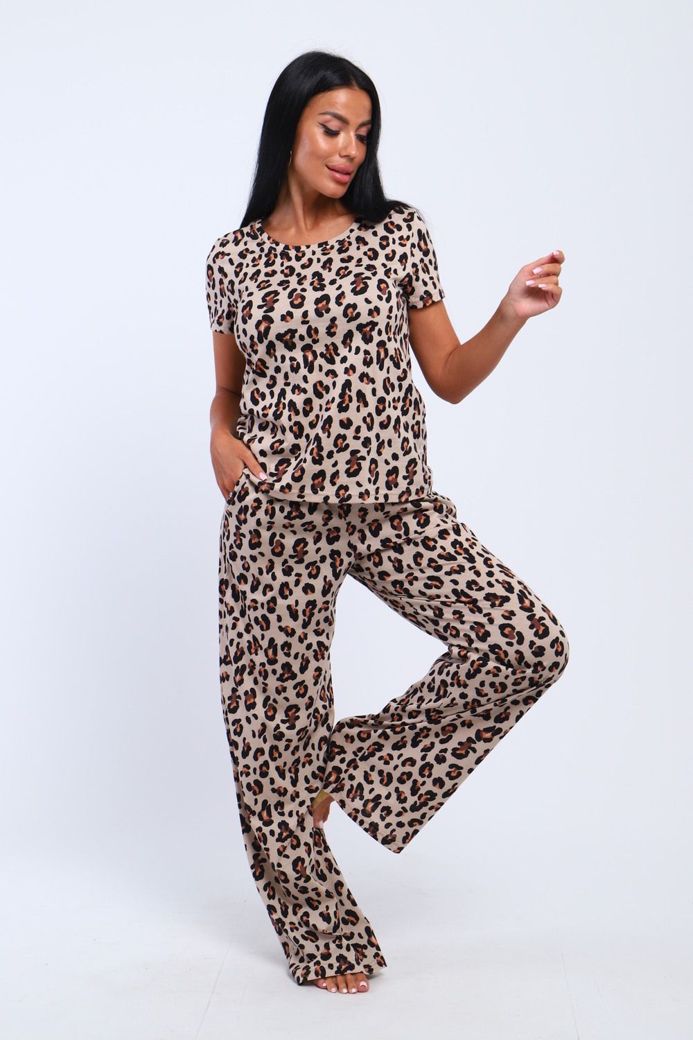 Представляем Вашему вниманию современный домашний костюм, состоящий из брюк и футболки . Футболка в леопард –это модный тренд уже несколько сезонов подряд. В сочетании с такой футболкой можно наработать огромное количество образов, как на каждый день.. Наша модель брюк с двумя боковыми карманами. Брюки выполнены из трикотажного полотна которое сохранит свой первоначальный вид на долгое время. В этом костюме вы будете выглядеть эффектно и приковывать к себе взгляды. Костюм имеет большую размерную сетку с 42 по 62 размер
