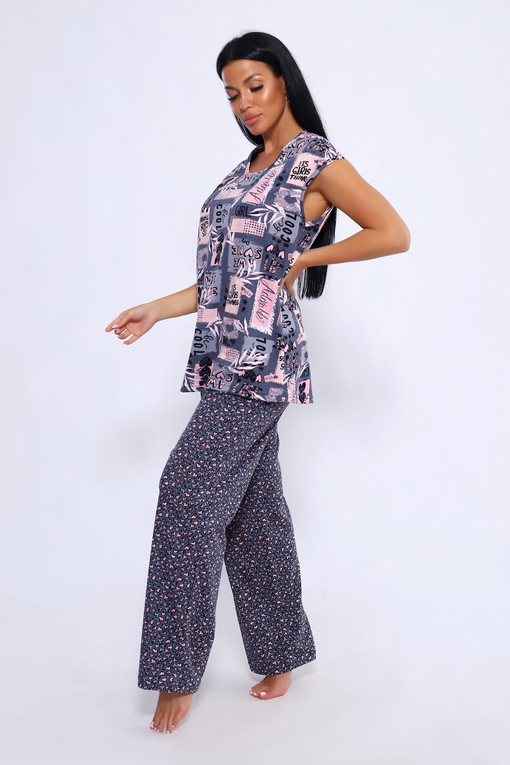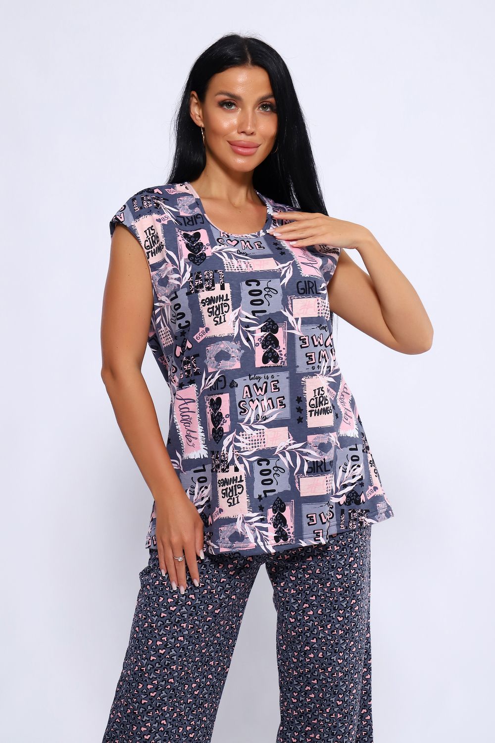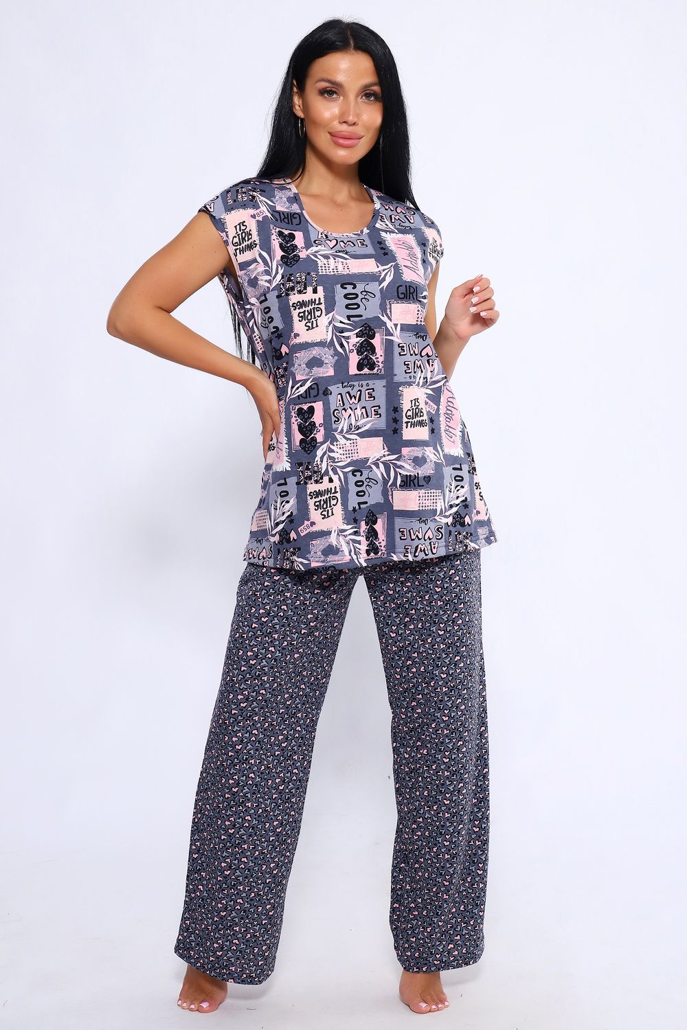 Женский костюм из 100% хлопка, длинные широкие брюки на эластичной резинке по талии шириной 3 см., с карманами в боковых швах и футболкой со спущенным плечом. Брюки в двух расцветках. Интересное и актуальное цветовое сочетание серых и розовых оттенков отличный вариант. Брюки и футболку можно сочетать и с другими предметами вашего гардероба. Ткань не просвечивает и имеет эластичность, обеспечит комфортное времяпрепровождение вашего досуга как дома так и на отдыхе. На фото модель представлена в 48 размере.