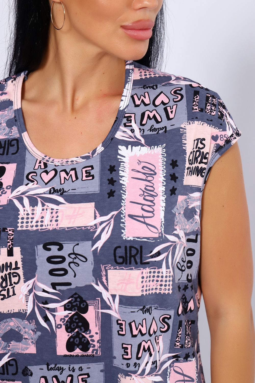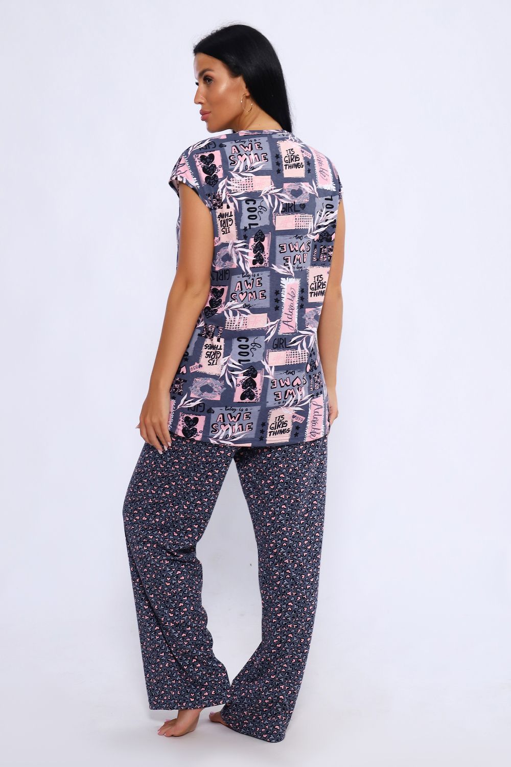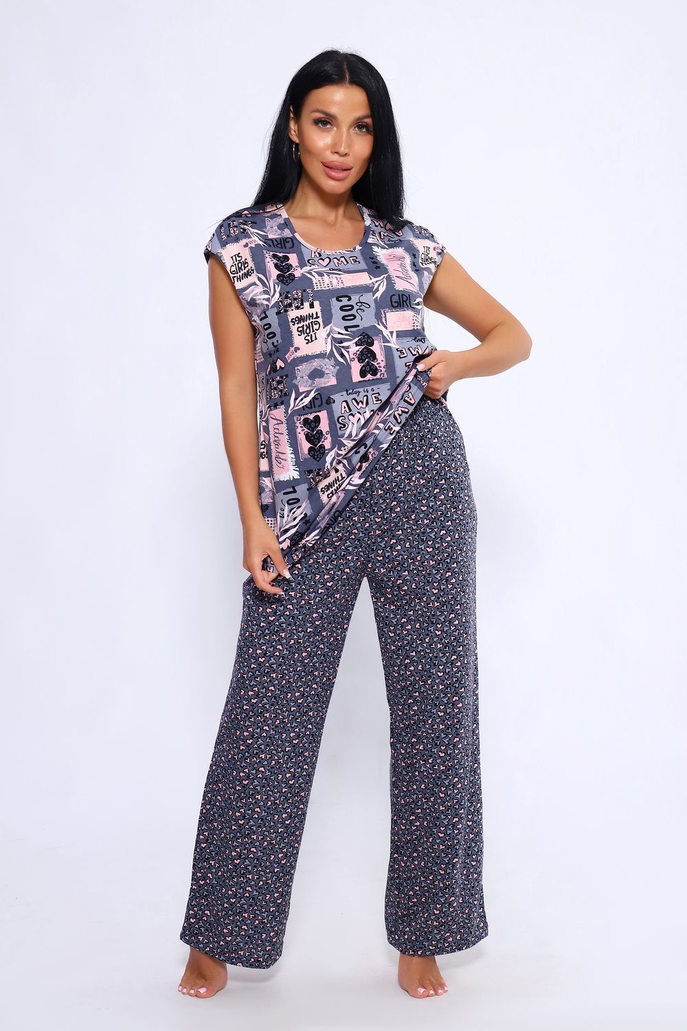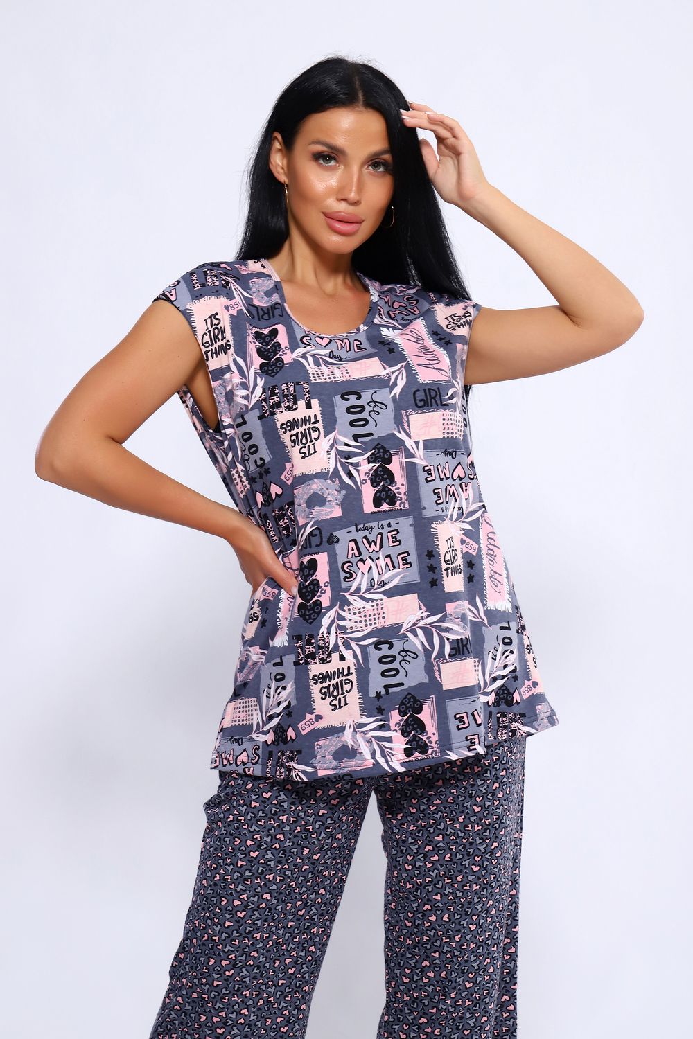 Женский костюм из 100% хлопка, длинные широкие брюки на эластичной резинке по талии шириной 3 см., с карманами в боковых швах и футболкой со спущенным плечом. Брюки в двух расцветках. Интересное и актуальное цветовое сочетание серых и розовых оттенков отличный вариант. Брюки и футболку можно сочетать и с другими предметами вашего гардероба. Ткань не просвечивает и имеет эластичность, обеспечит комфортное времяпрепровождение вашего досуга как дома так и на отдыхе. На фото модель представлена в 48 размере.