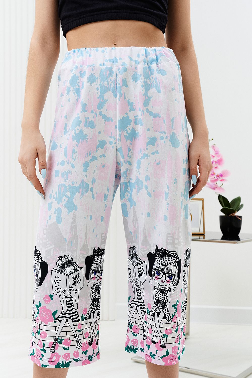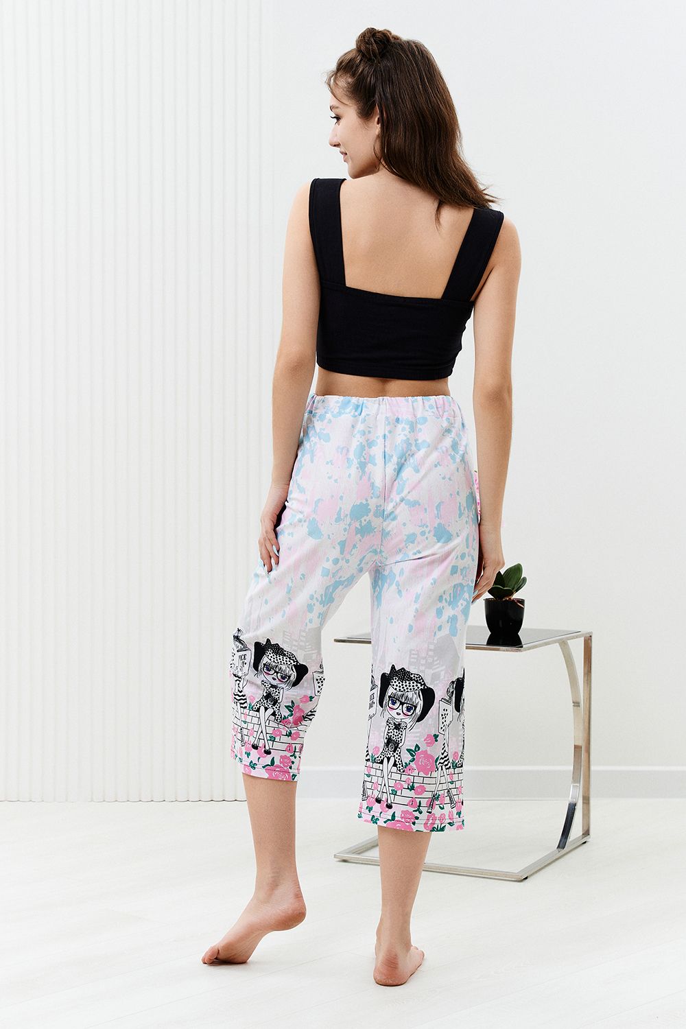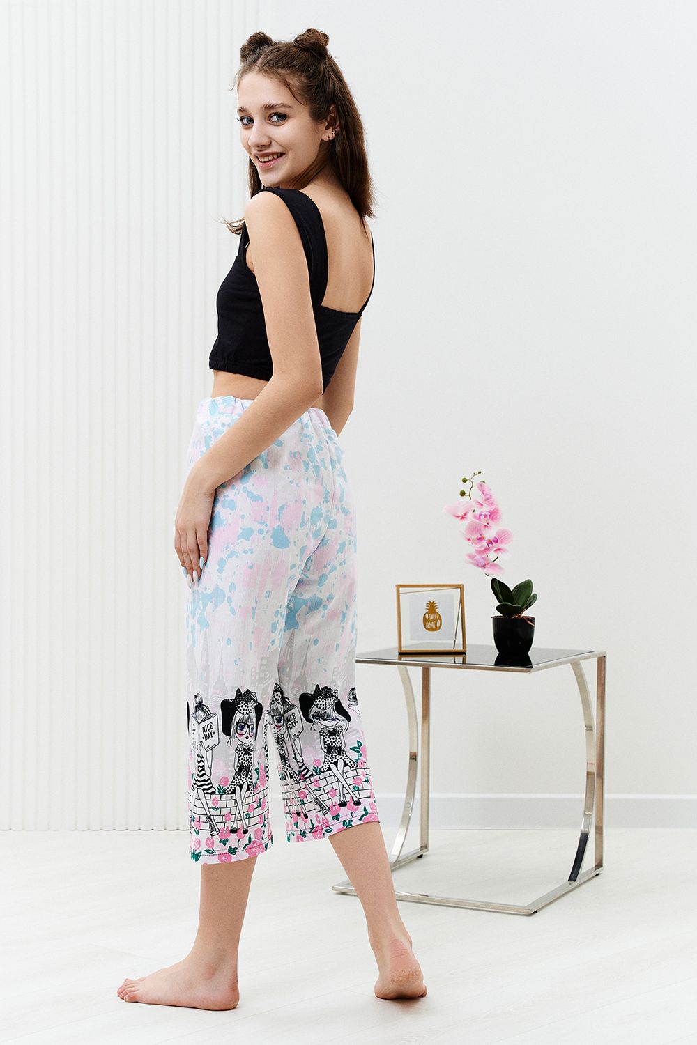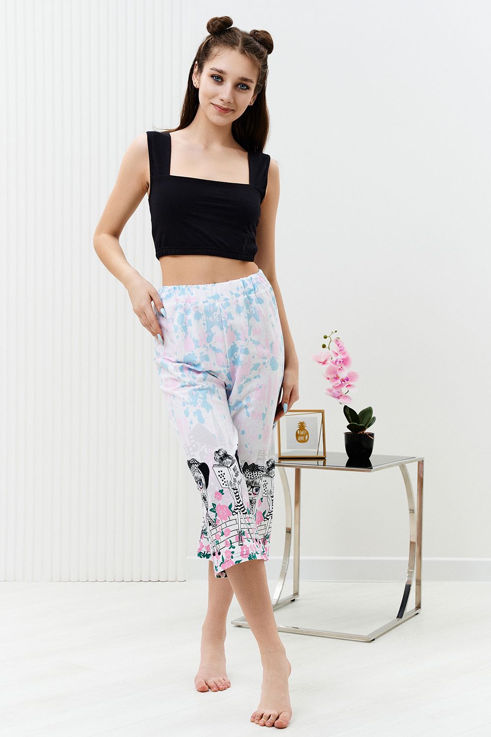 Комплект состоит из топа и укороченных брюк "кюлот". Топ из кулирки с лайкрой на широких бретелях, с квадратной горловиной, длиной выше линии талии. Верх спинки и низ топа собраны на резинке. Проймы обработаны бейкой из основного полотна. Брюки из кулирки прямые, свободные, укороченные, на поясе.